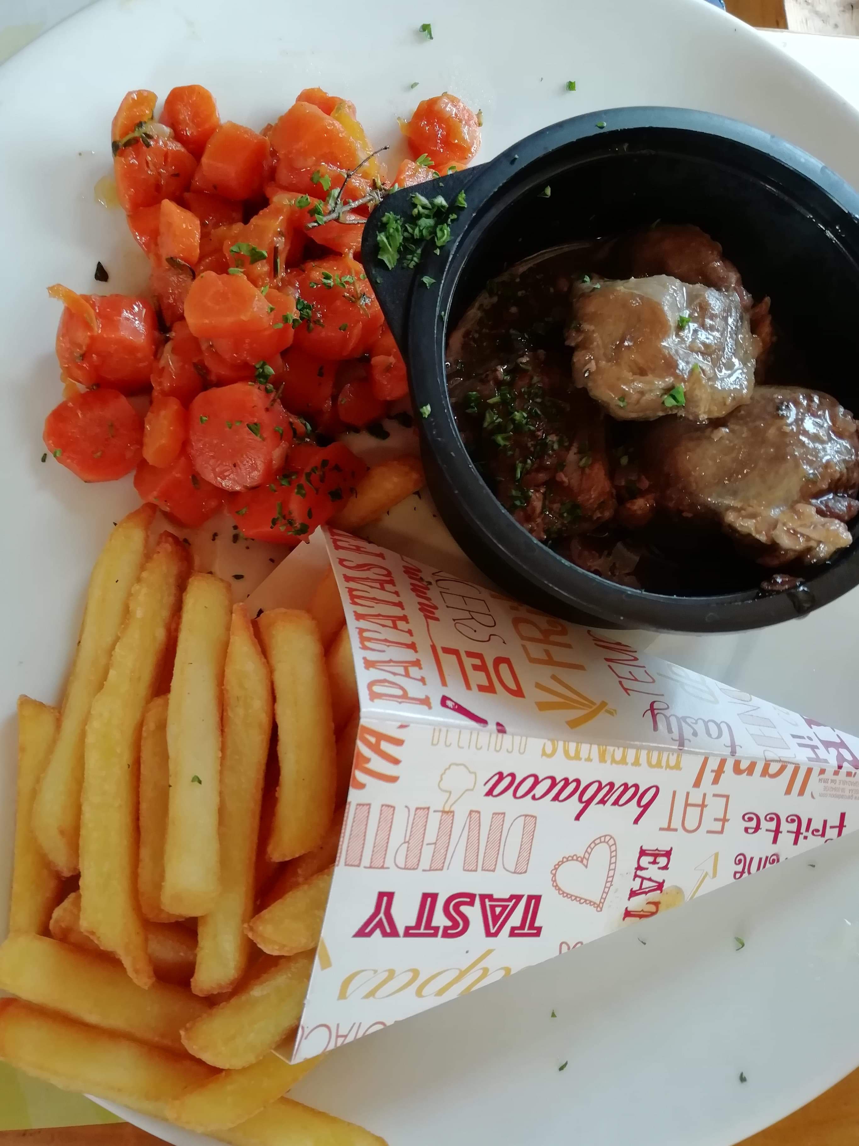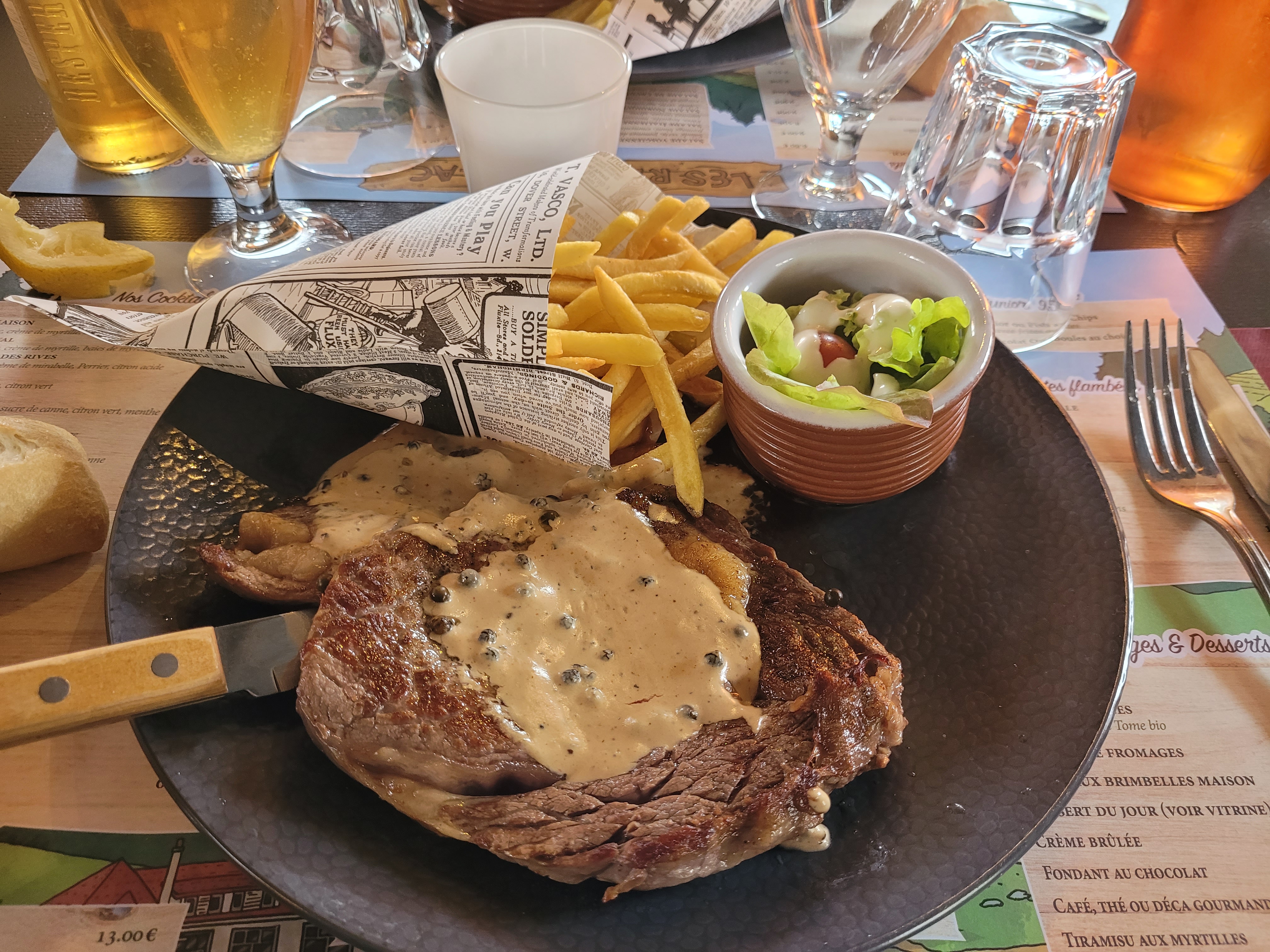 Très très décevant, il vaut mieux ne pas ouvrir de restaurant quand le seul but est de faire de l’argent. Par où commencer? La suggestion du jour, barbecue de langoustine avec merguez, saucisse blanche et frites à 25€. Tout arrive à moitié, une moitié de saucisse, une moitié de merguez, ce qui n’était absolument pas précisé surtout pour 25€ des moitiés de saucisse… En plus de cela, ce plat est arrivé en dernier pour la dernière personne lorsqu’on on avait déjà tous fini de manger 20 min plus tarde. Ensuite l’entrecôte, avec plus de gras que de viande. Un poulet forestière mal cuit avec une sauce sans goût à l’eau avec des champignons en conserve. C’est dommage parce que les serveurs sont adorables, leur service est super mais c’est bien la seule chose de positive dans ce resto avec le fish and chips.