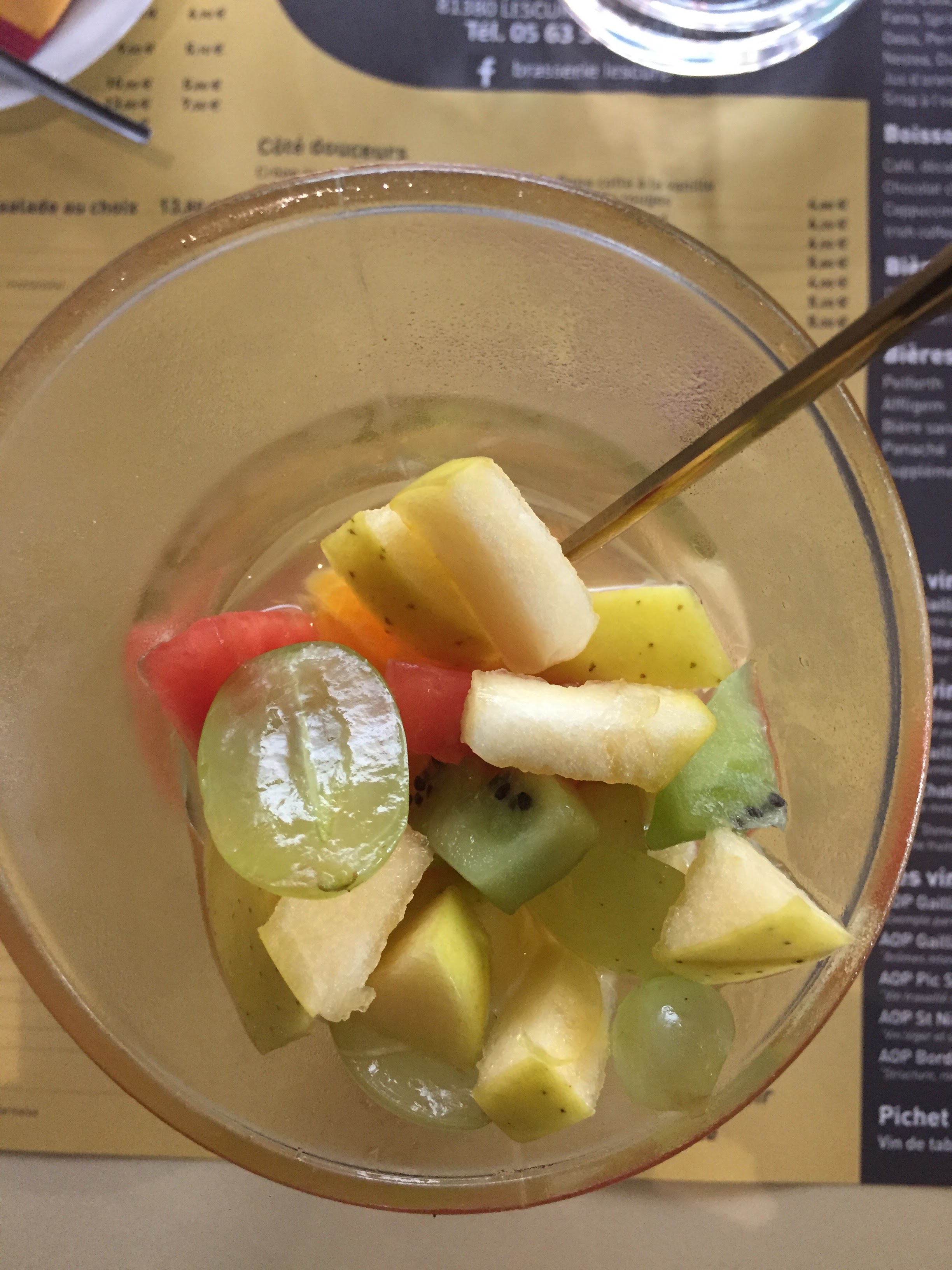 Arrivée à 13 heures pour un déjeuner rapide. La prise de commande est un peu longue mais on est en plein coup de feu et c est plein...alors il faut être un peu bienveillant. J ai pris une salade aux nems. C est très bon et copieux. Ensuite on m a servi une excellente salade de fruits de saison faite maison. C est un peu bruyant mais nous sommes dans une brasserie où il y a du monde...