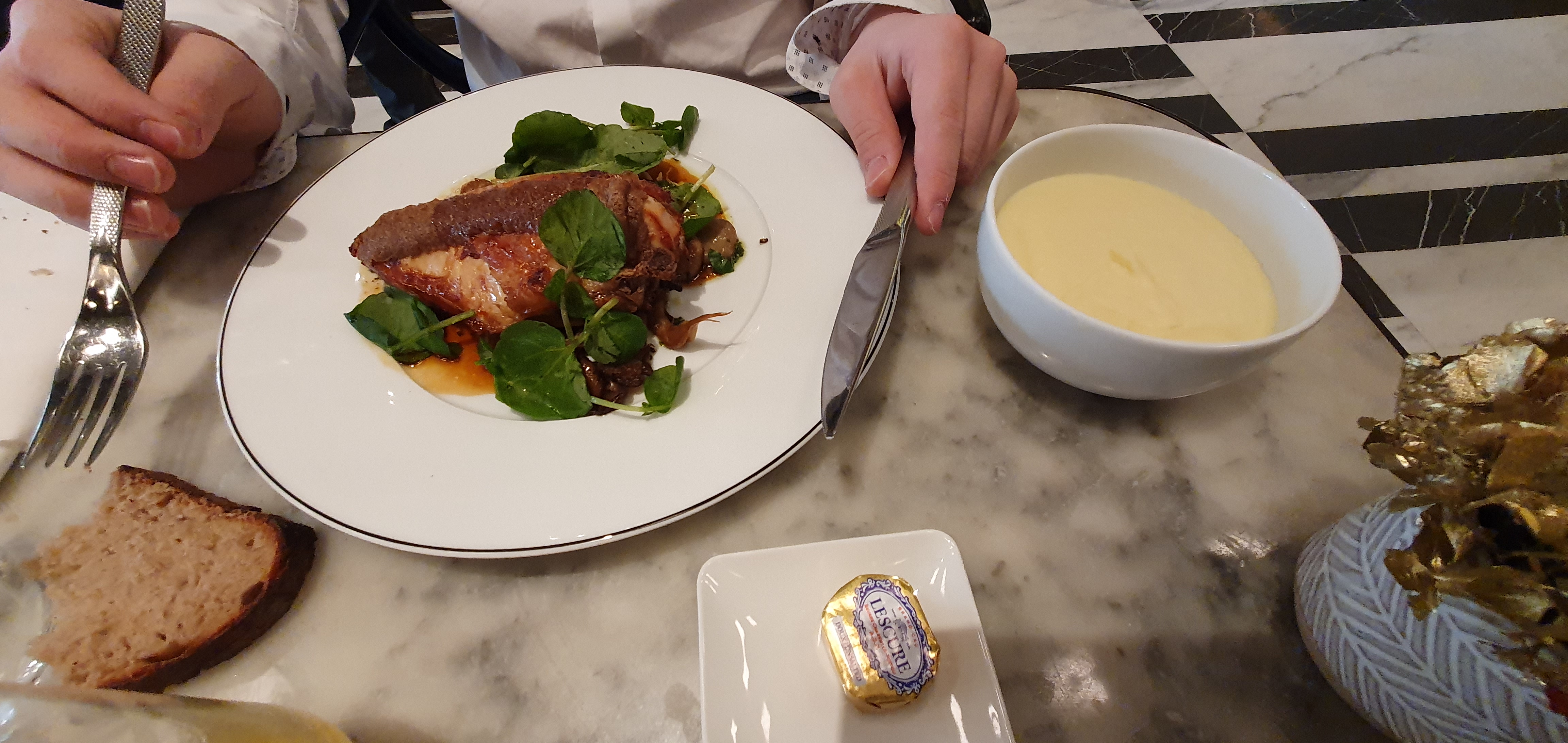 Lieu très beau. Pléthore de personnels, majoritairement très jeunes. Je regrette la volaille de Bresse avec sa purée. A la place un blanc de poulet trop cuit, donc sec, sur une tartine de je ne sais quoi très ferme et qui n'apportait, pour mon goût, rien de plus au plat. Purée bonne mais pas gourmande. Je me faisais une joie de retourner à la Brasserie du Lutetia, n'y étant pas retournée depuis sa réouverture après de lourds travaux, je suis un peu déçue. Pour la personne qui ne connaissait pas l'excellence de l'ancienne brasserie, déjeuner dans cette nouvelle version sera sûrement très satisfaisant.