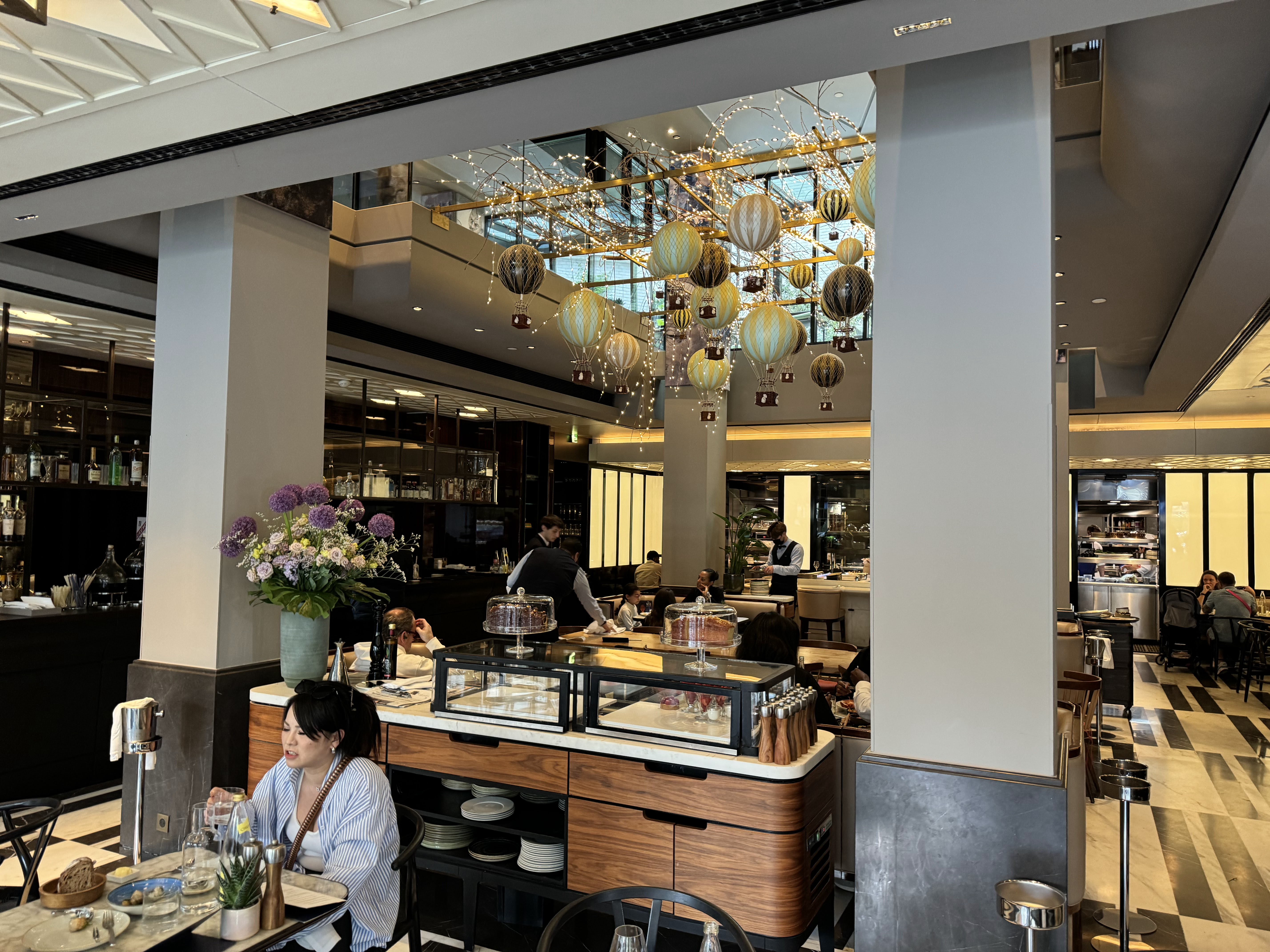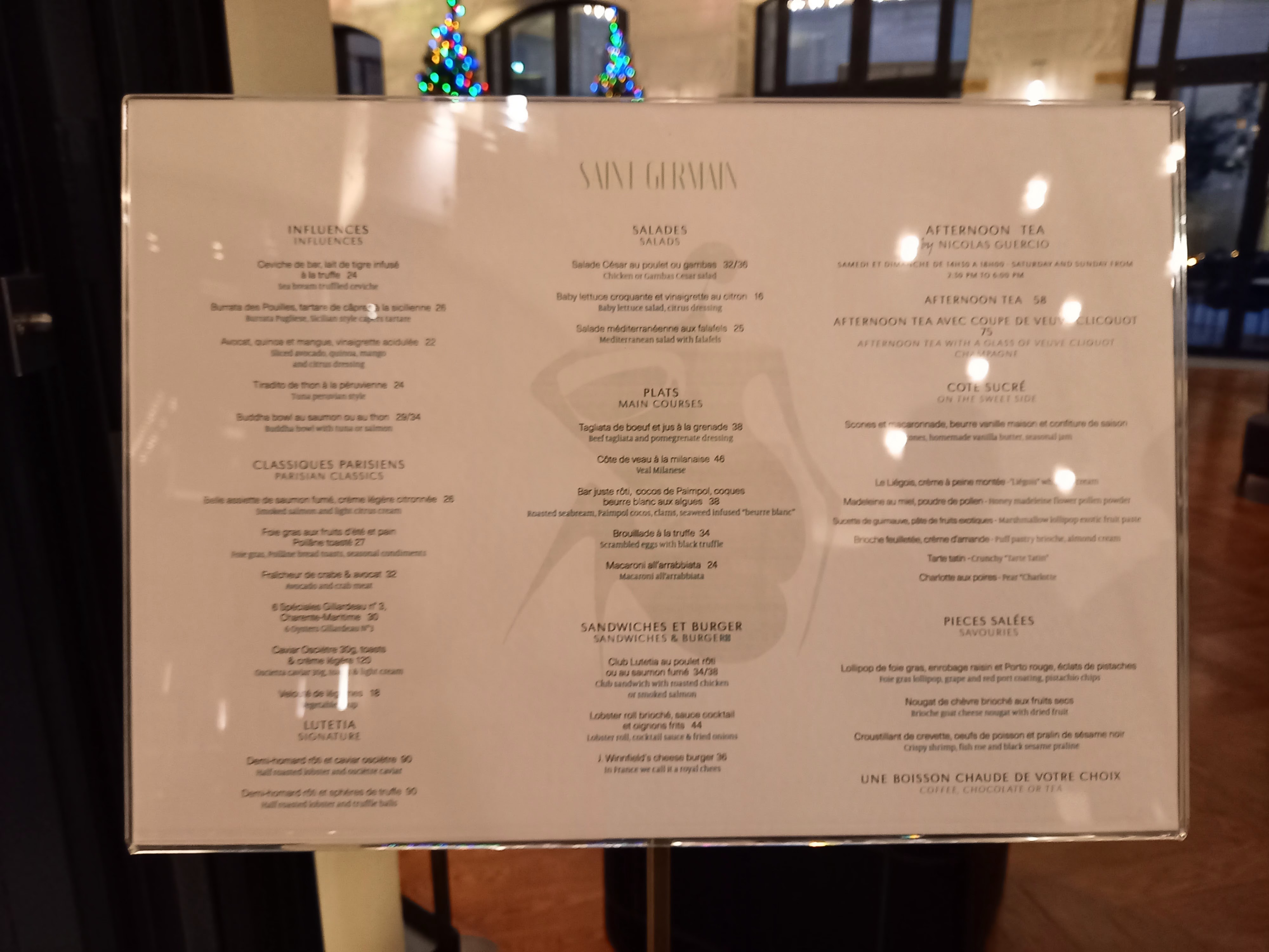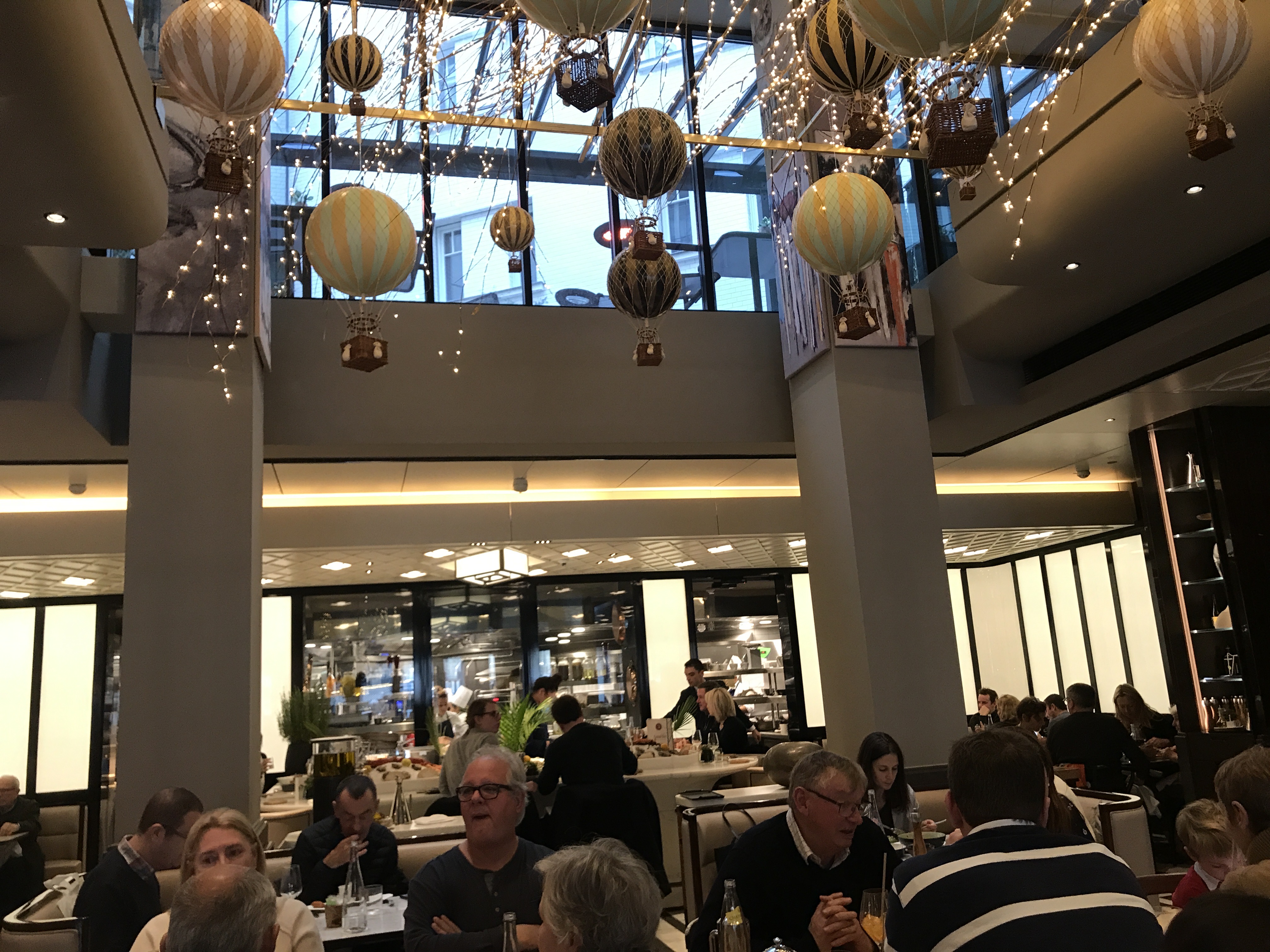 Carte type brasserie haut de gamme, bonne sélection d’entrées chaudes et froides, de viandes et de poissons/crustacées, mais d’une extrême pauvreté sur les options végétariennes, on sent que le chef n’a pas l’habitude. J’ai pris des linguine au homard. Linguine parfaitement cuites al dente. La sauce est bien travaillée, légèrement épicée, bonne. Le homard était insipide malheureusement, et alors que je devais avoir un demi-homard, je n’en vois que les pinces et un ridicule petit bout de queue (bref assez loin d’une moitié, quand bien même aurait-il été un homard chétif). En dessert, un Royal au chocolat dans les règles de l’art ; bon, mais sans plus. A ma table, une sole meunière excellente, et les Saint Jacques excellentes aussi (mais une portion ridicule, même pour ma femme qui n’a pas gros appétit… il manquerait peut-être un accompagnement). J’ai trouvé la décoration (petites Montgolfières au plafond) du lieu sympa, sans whaou ! Les serveurs sont au début de leur courbe d’apprentissage. On a eu affaire à 5 serveurs différents. 15 minutes se sont écoulées entre le moment où j’arrive à ma table et demande le vestiaire et le moment où on vient me prendre mon manteau. Un serveur vient nous proposer de commander un verre en apéro, il nous laisse consulter la carte et n’est jamais revenu. Le sommelier était absent pour notre choix de vin. Pendant la commande et le service des plats tout était au niveau. Le service du vin plus aléatoire. A la fin du dîner notre serveur nous a salué avec une insistance dans son discours peu usuelle, nous demandant a de maintes reprises si tout s’était bien passé sans vraiment nous laissé le temps de répondre. Les prix sont élevés bien sûr, c’est la brasserie du Lutetia après tout ! Ce qui fait que le rapport qualité-prix est assez mauvais.