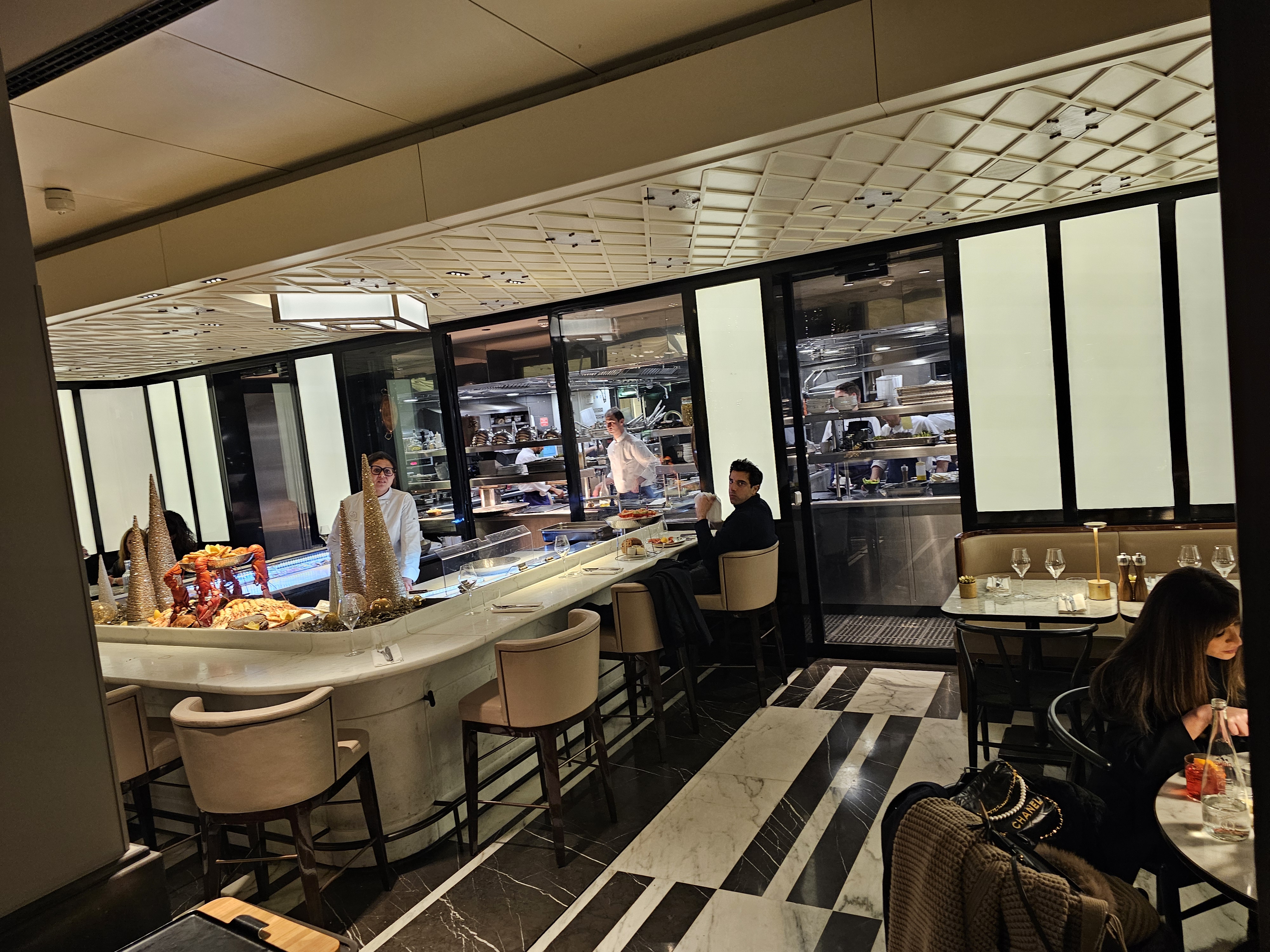 La brasserie n'est pas au niveau de ce qu'elle prétend être avec son positionnement prix. Le service est mal organisé, nous avons du appeler/relancer le personnel pour tout. La cuisine est bonne, mais les plats totalement disproportionnés: alors que le plat de linguine semble copieux, le plat de Saint Jacques (très bon) ne nourrit pas plus qu'une entrée (je suis pourtant petite mangeuse), et je me retrouve à manger du pain avec du beurre. Pour 48 euros le plat, c'est à mon inacceptable. Les desserts sont quant à eux très quelconques.