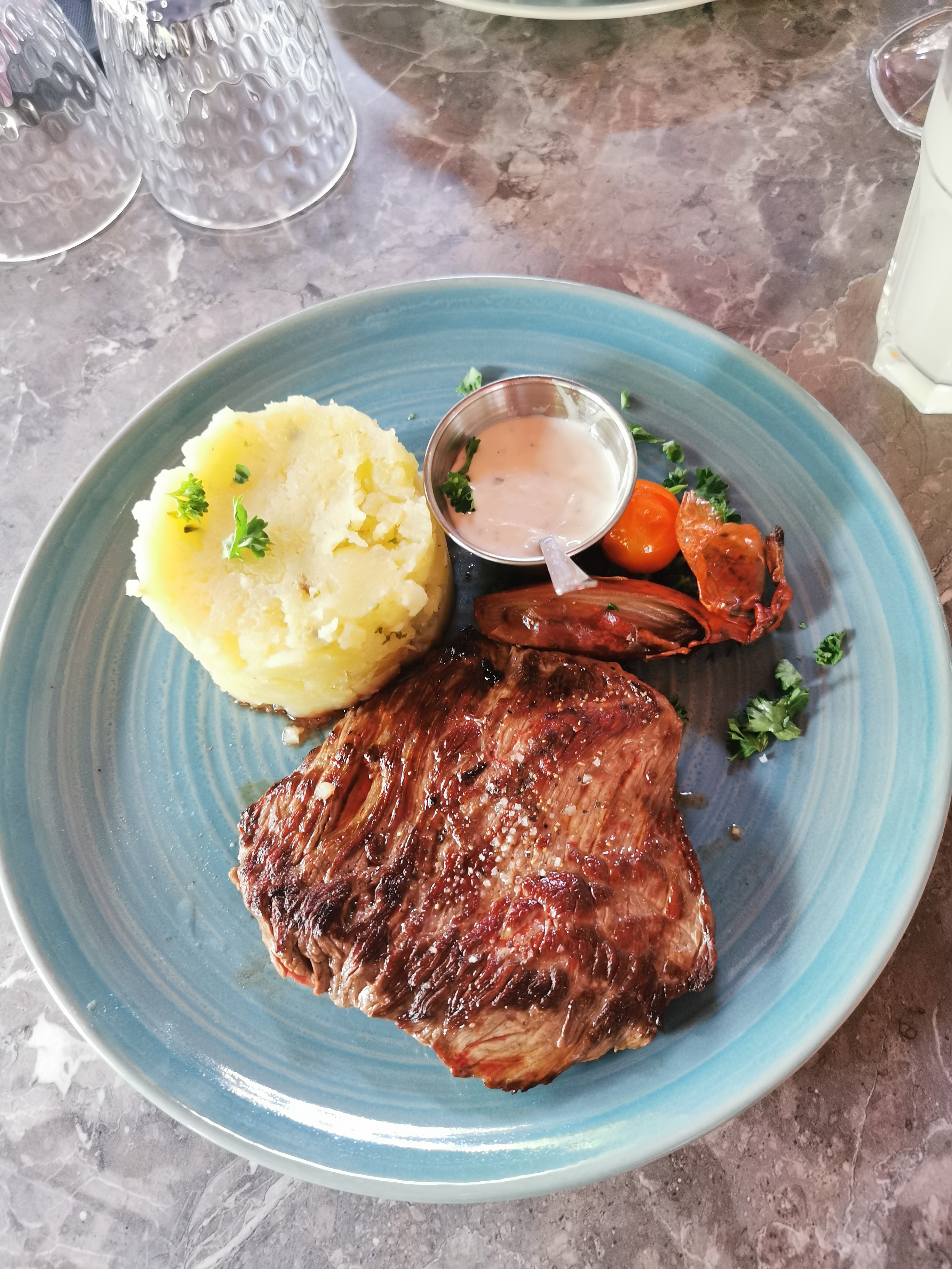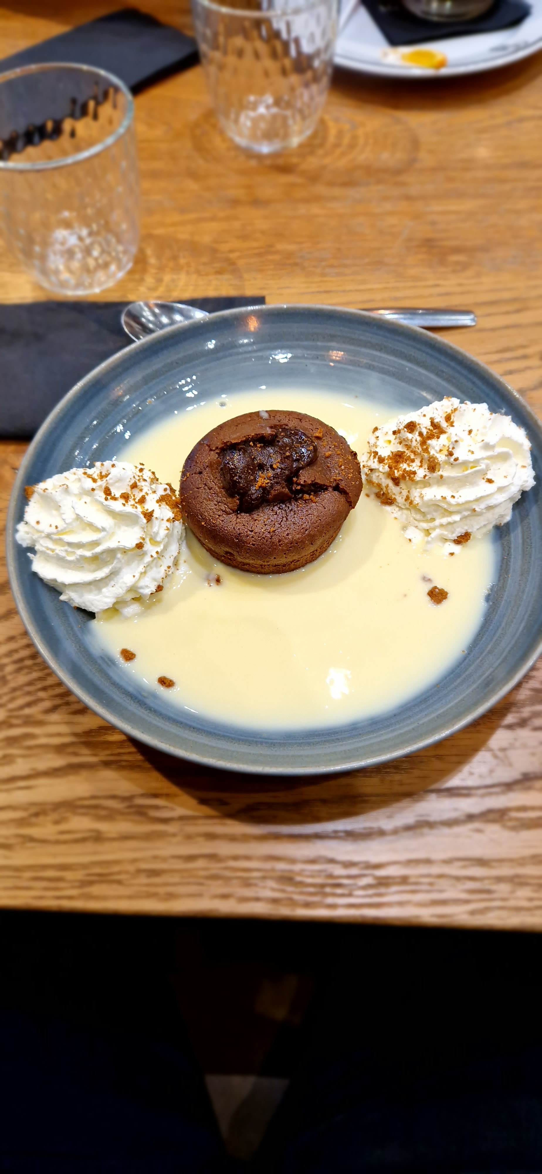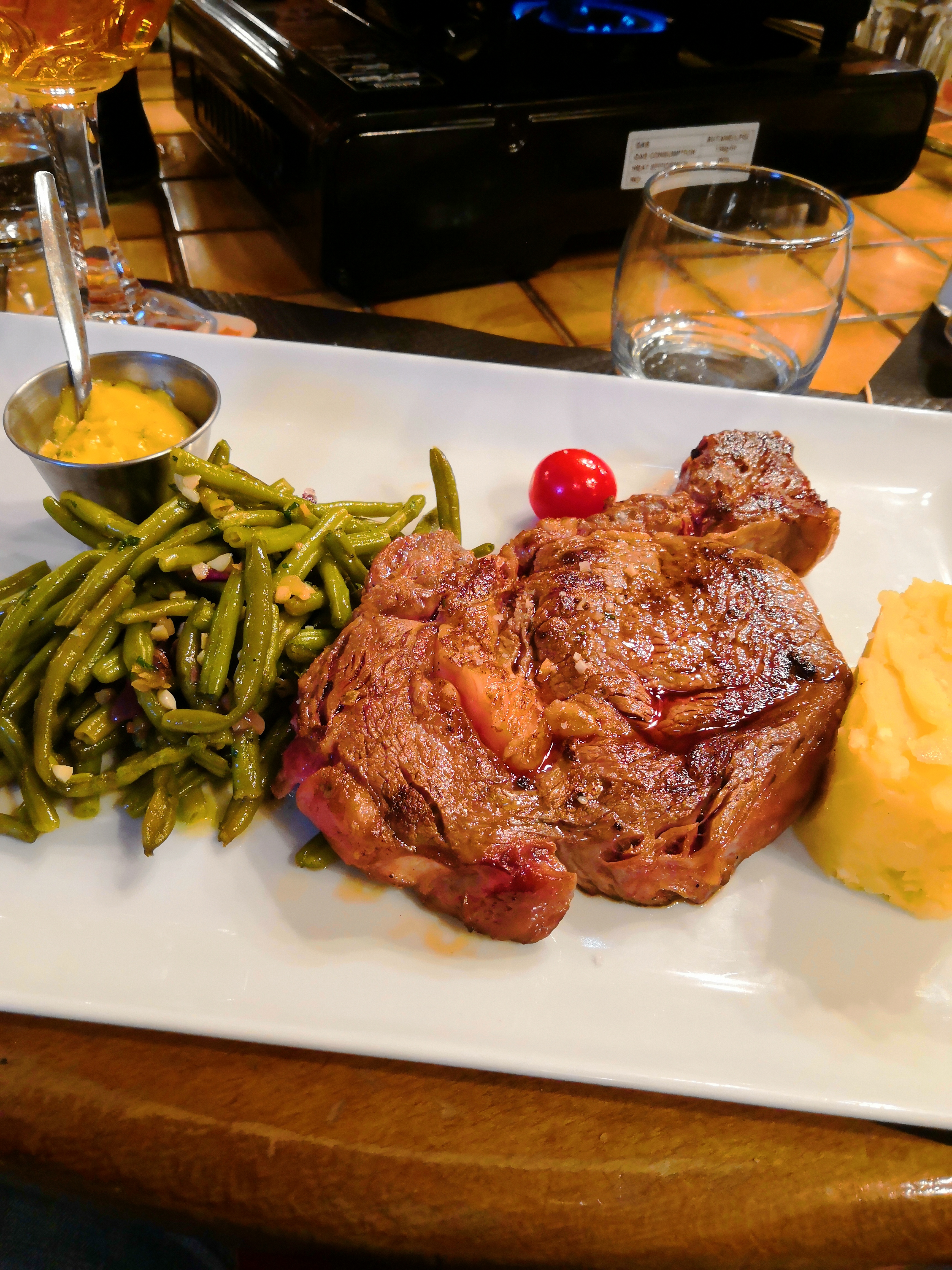 Je suis arriver a 17h20, bien accueilli avec ma compagne . Le verre de rhum plantation Xo 20 th anniversary juste incroyable avec un tiramisu café fait maison en attendant de manger une heure après ,ma compagne a pris l'un des côte d'Auvergne fruité est excellent au palais très peu d'amertume j'ai pris un autre rhum qui est le ZAPACA XO CENTENARIO ,passons au choses sérieuse, ma compagne et moi avions pris des burrata crémeuses en entrée qui étais visuellement très propre et raffiné au niveau du détail ,pour la suite elle a pris fish an chips de cabillaud qu'elle a trouver de croustillant et moelleux a la fois avec frite maison pas brûler 😊 et pour ma part une entrecôte de 300 gr tout juste a point comme voulue et très salivante en terminant avec trois magnifique petite profiteroles vanille en dessert et un très bon tiramisu café pour ma compagne qui avais aimer le mien un peut plus tôt dans la journée un repas tout juste extraordinaire,exquis tout ce que vous voulez rien a y redire même pour les serveur qui sont très avenant en vers leurs clients et très pro niveau commande pas de carnet dans les mains '👍👍👌👌👌👌👌👏👏👏