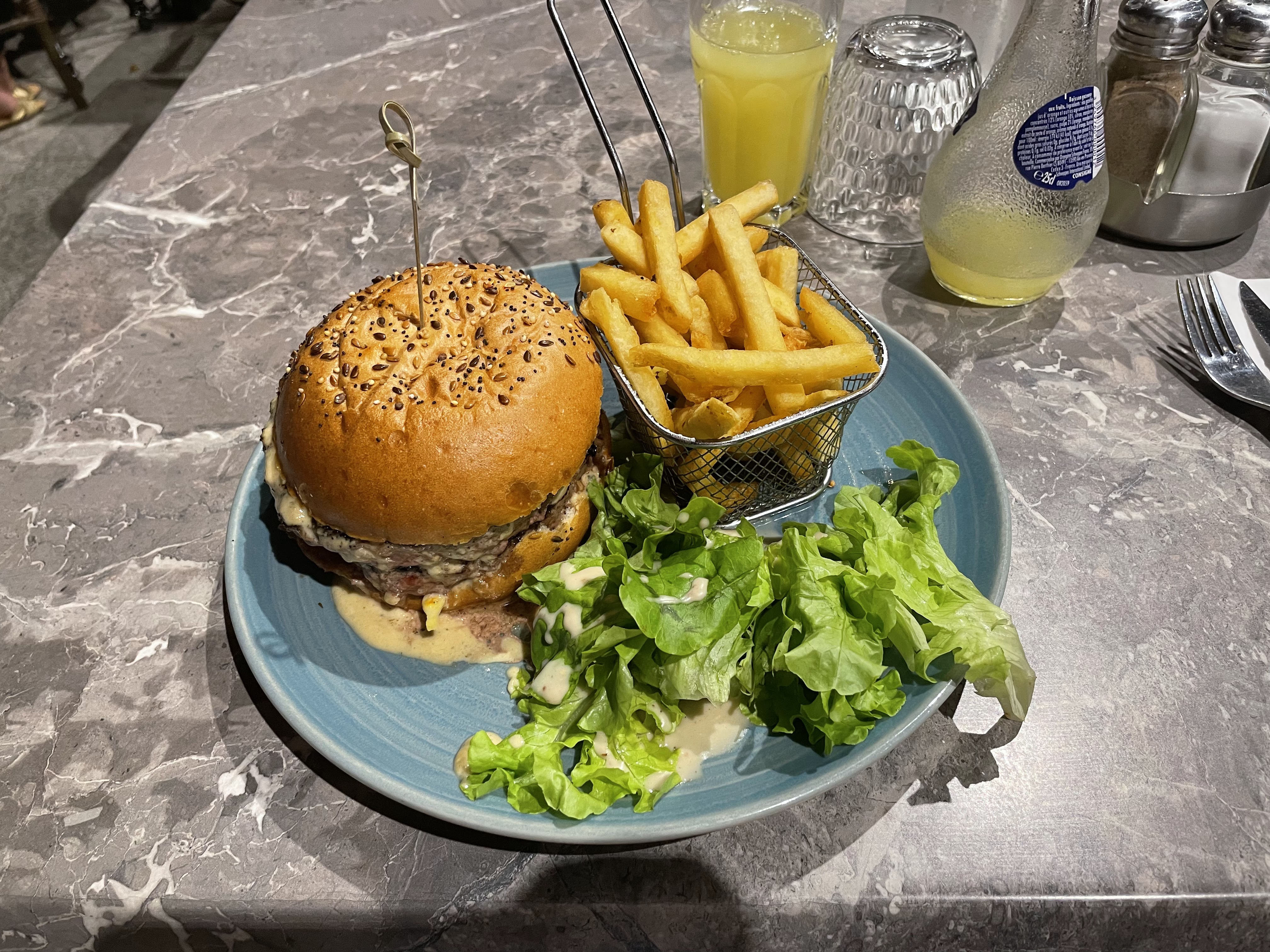 C est le burger à 14,90 € Alors La salade qui était dans mon assiette était pas fraîche du tout, complément cuite Le fromage à burger doit etre un être un produit industriel sous forme de liquide ... Sous la viande il y avait une tranche de tomate, avec quelque chose qui ressemblait a de la carotte râpée ?? Franchement le burger était pas bon, il y avait un truc de-dans de vraiment pas bon . Les frites sont industriel. À cela notre table était dans un coin extérieur du restaurant, on a passé le repas dans les odeurs d urine. Même si le restaurant n est pas responsable ils pourraient au moins mettre du produit qui sent bon ou faire quelque chose. À deux serveurs j ai demandé à changer de place, mais cela ne c est pas fait (à la fin du repas on m'a proposé, personnellement je n avais qu'une seule envi vite partir, fuire