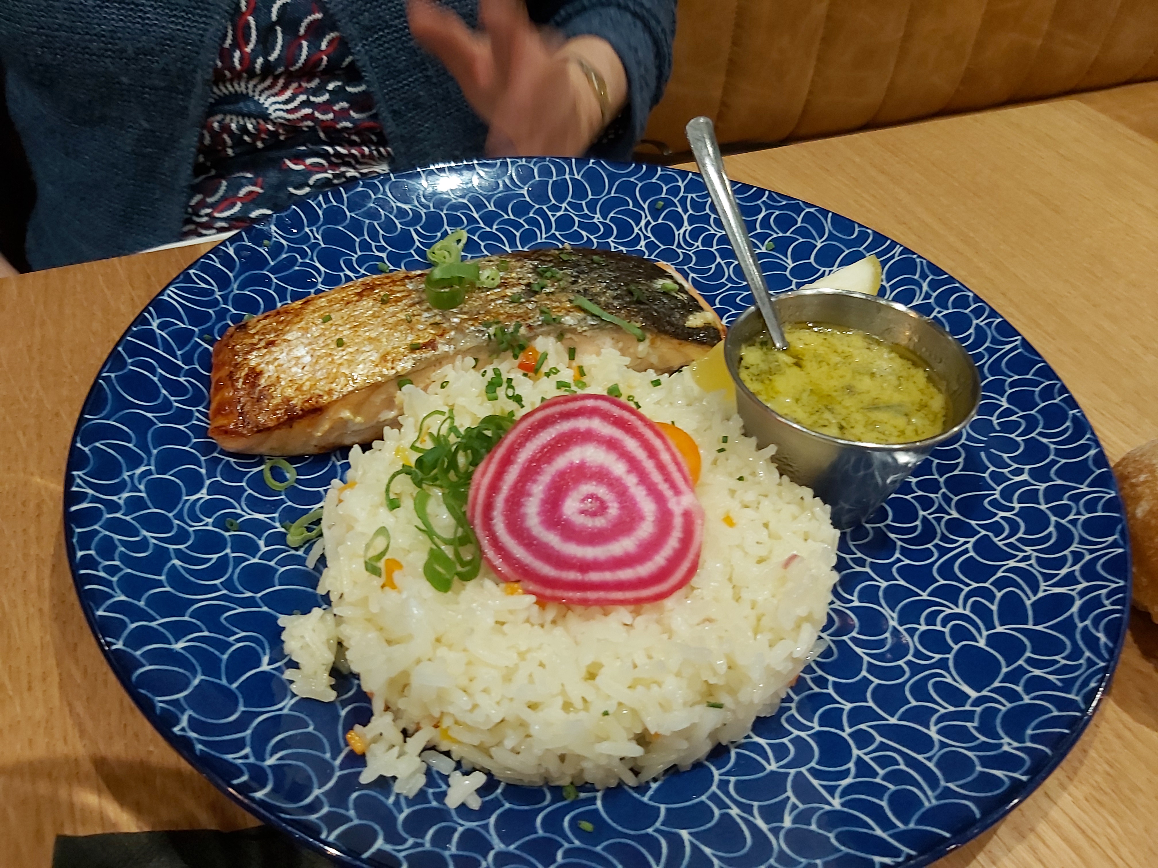 Grand restaurant spacieux. Décoration design chic. En ce qui concerne la carte des boissons et des plats il y a de nombreux choix. Saumon qui a nécessité une cuisson supplémentaire car arrivé tiède et peu cuit. Riz sec avec des légumes sans trop de goût. La sauce excellente avec une mayonnaise maison. Le desert RAS les quantités en général sont plus que suffisantes. En ce qui concerne le personnel, les serveurs sont disponibles et réactifs. Bémol pour les chiens acceptés ce qui est peu agréable d’autant plus quand il pleut..