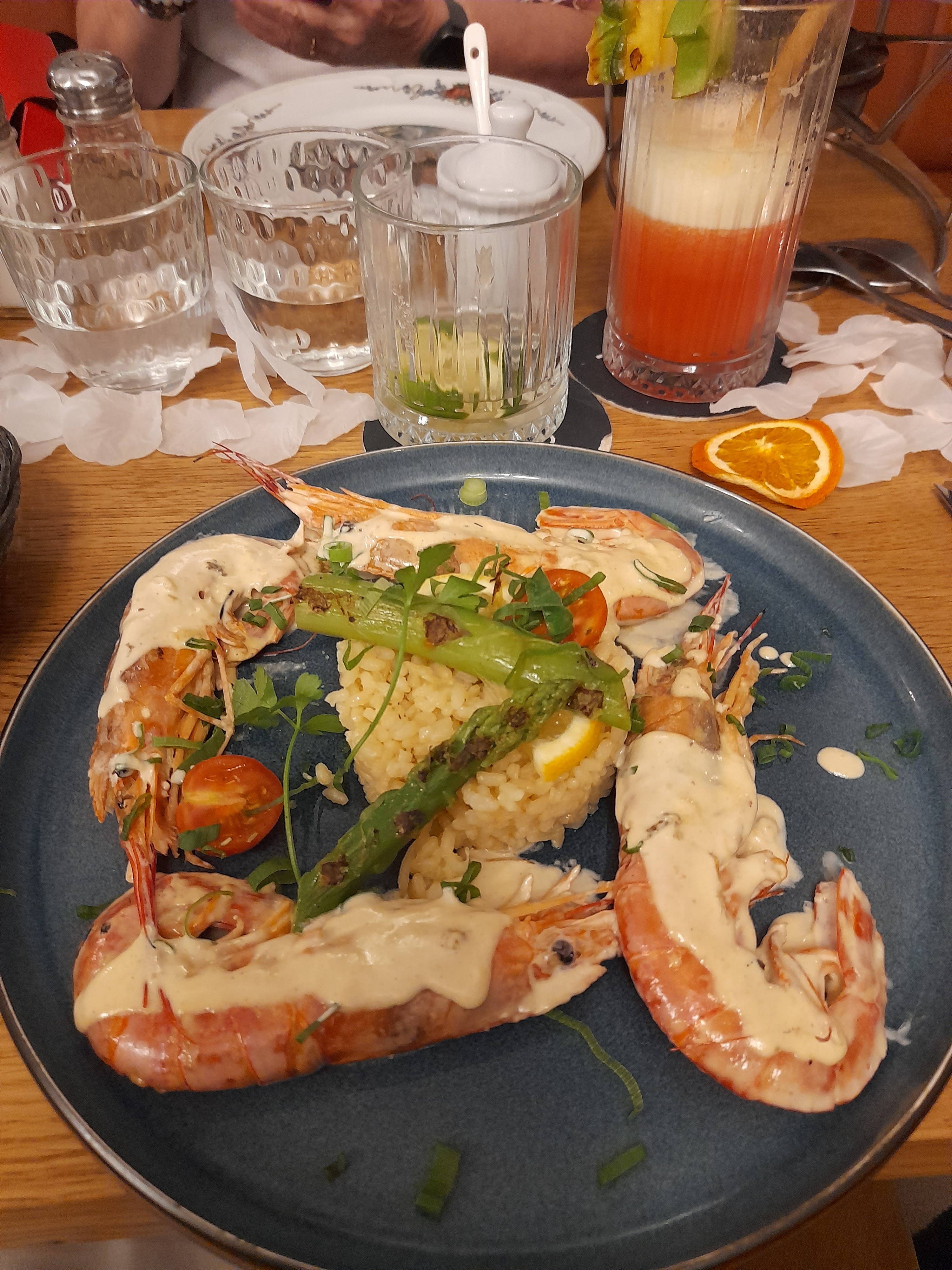 Plat spécial Saint Valentin. Bien, gambas 🦐 pas assez cuites à mon goût, et la sauce dessus, pas terrible pour les décortiquer. Sinon rien à dire.