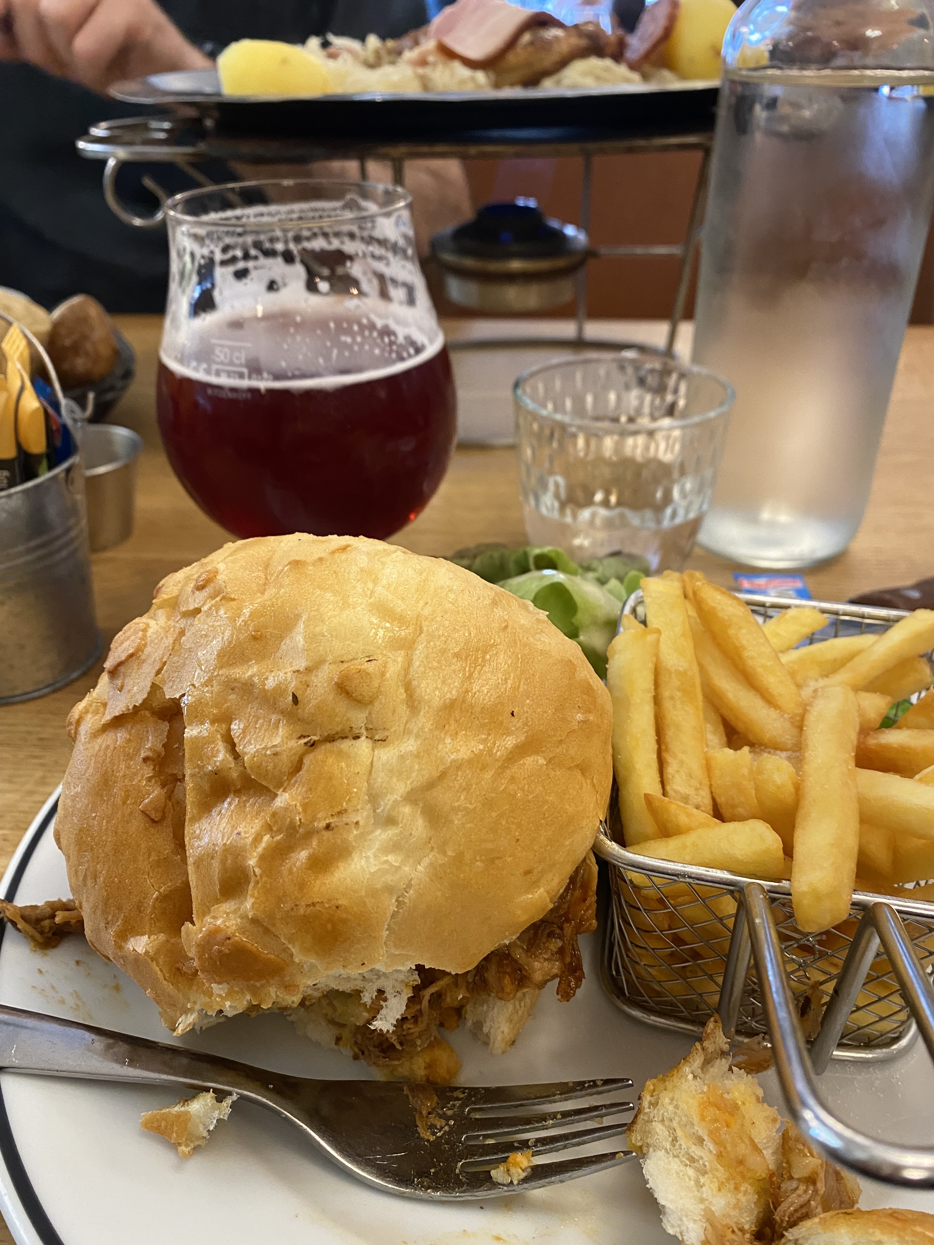 Cadre sympathique, typique d’une brasserie Visite le 1er novembre : carte réduite pour cause de jour férié Le burger pulled pork était vraiment très bon, la viande était goûtue et relevée. Les frites par contre n’ont rien d’exceptionnel. Après nous avoir donné la carte des desserts, il a bien fallu attendre 20 min pour qu’un serveur prenne la commande, après que nous lui avons fait signe. La crème brûlée était froide, or elle se mange tiède Le chocolat sur les profiteroles n’était pas chaud également, contrairement à d’habitude. Une qualité donc un peu dégradée par rapport à des venues précédentes