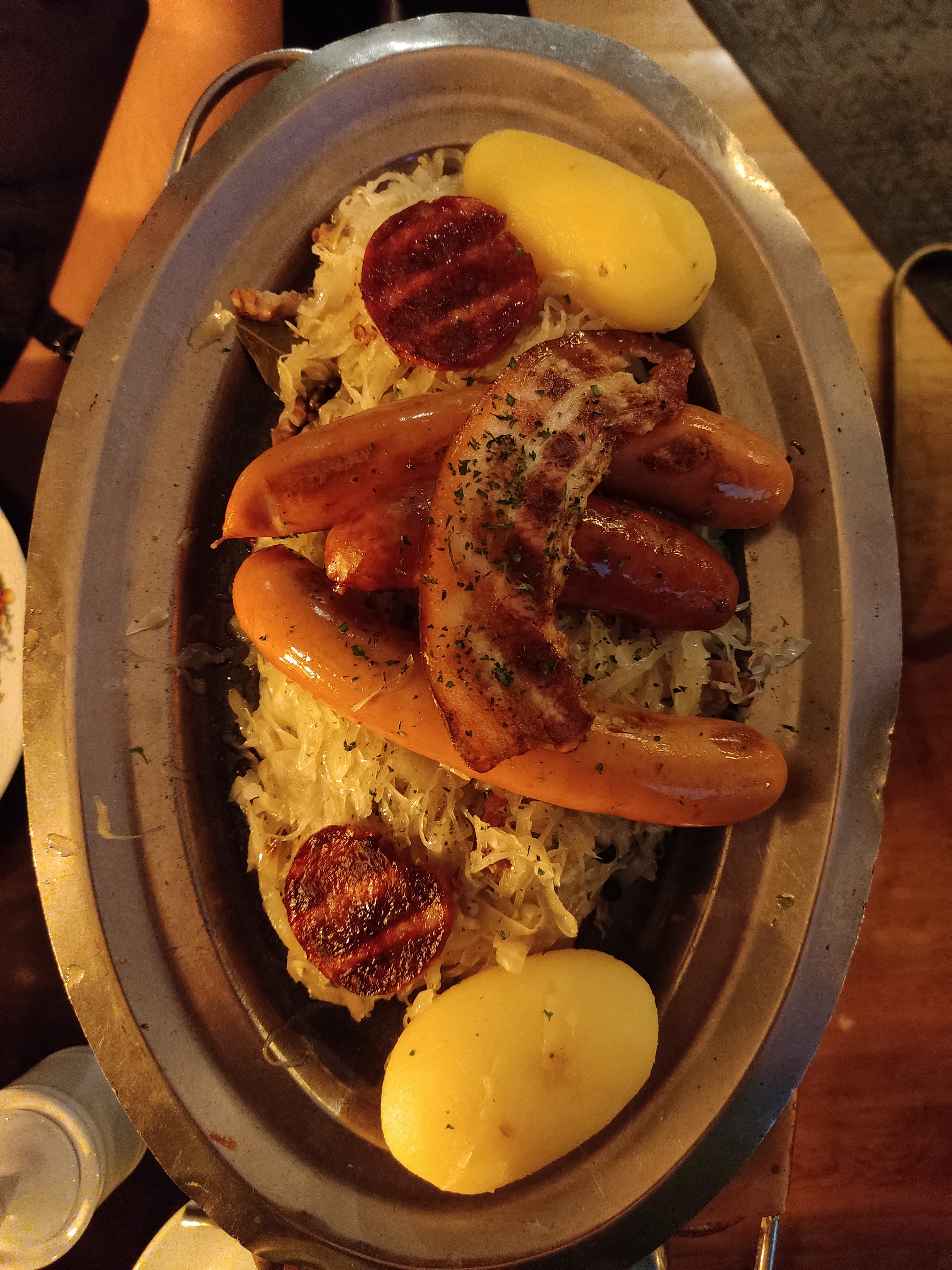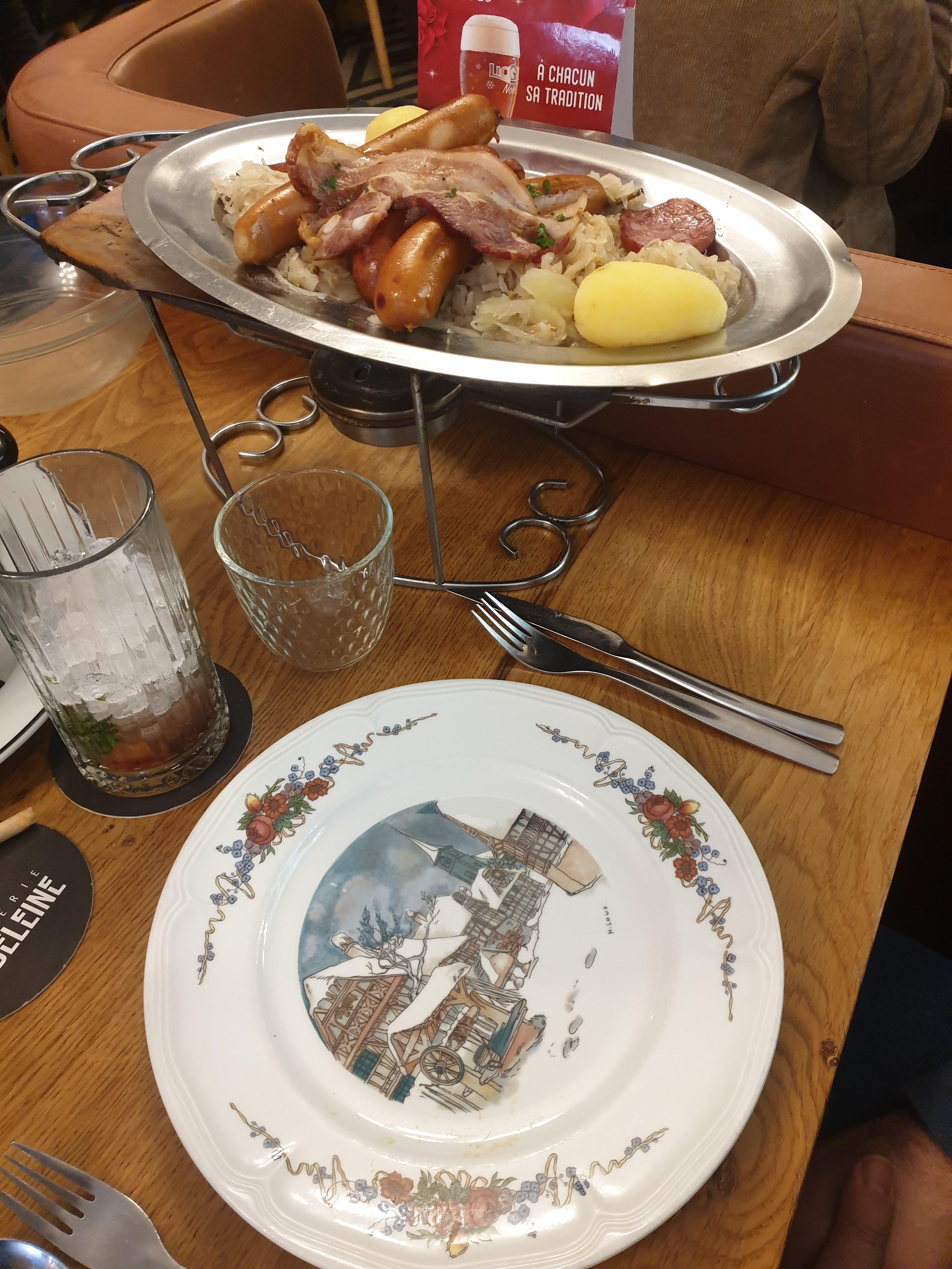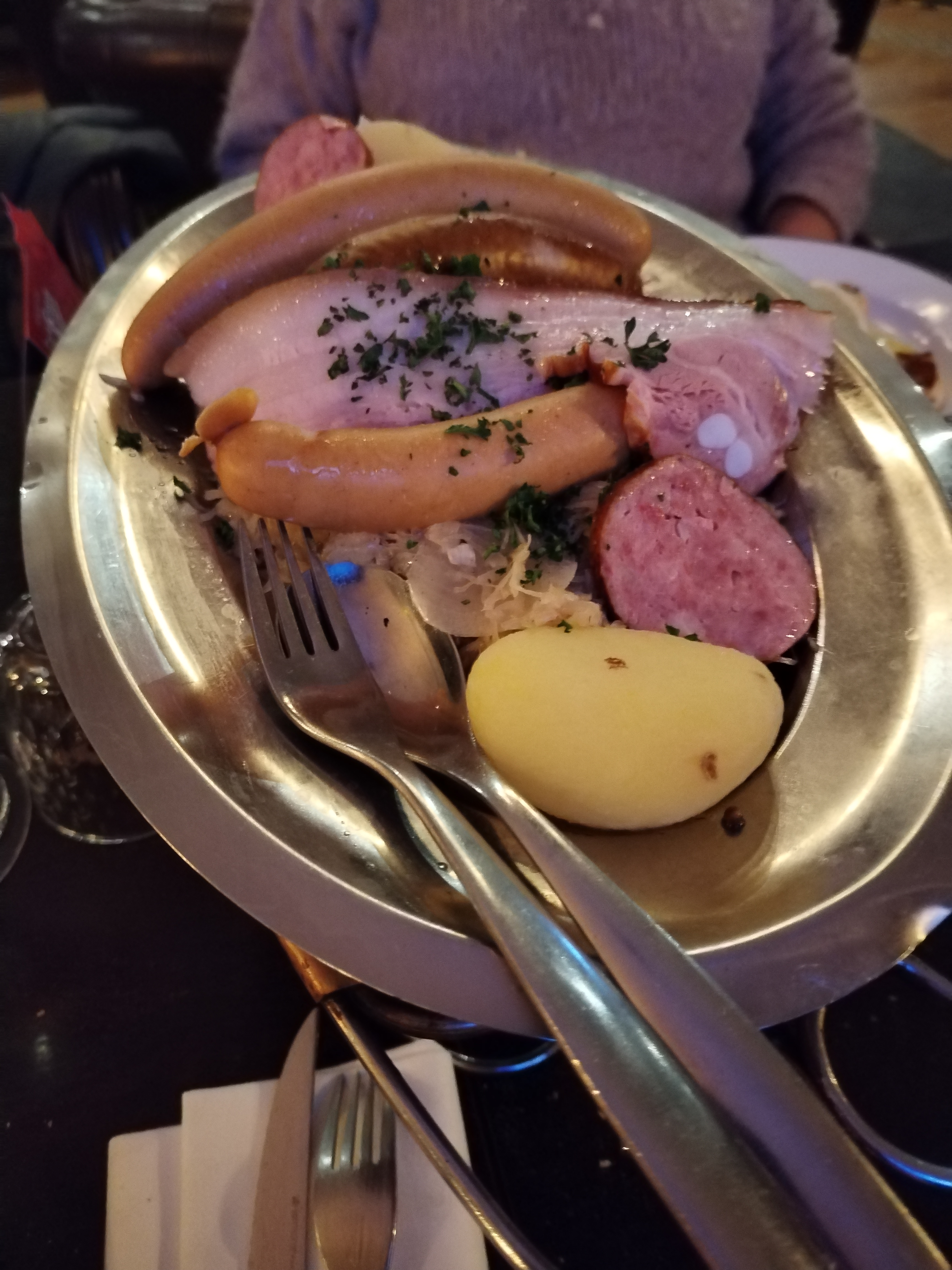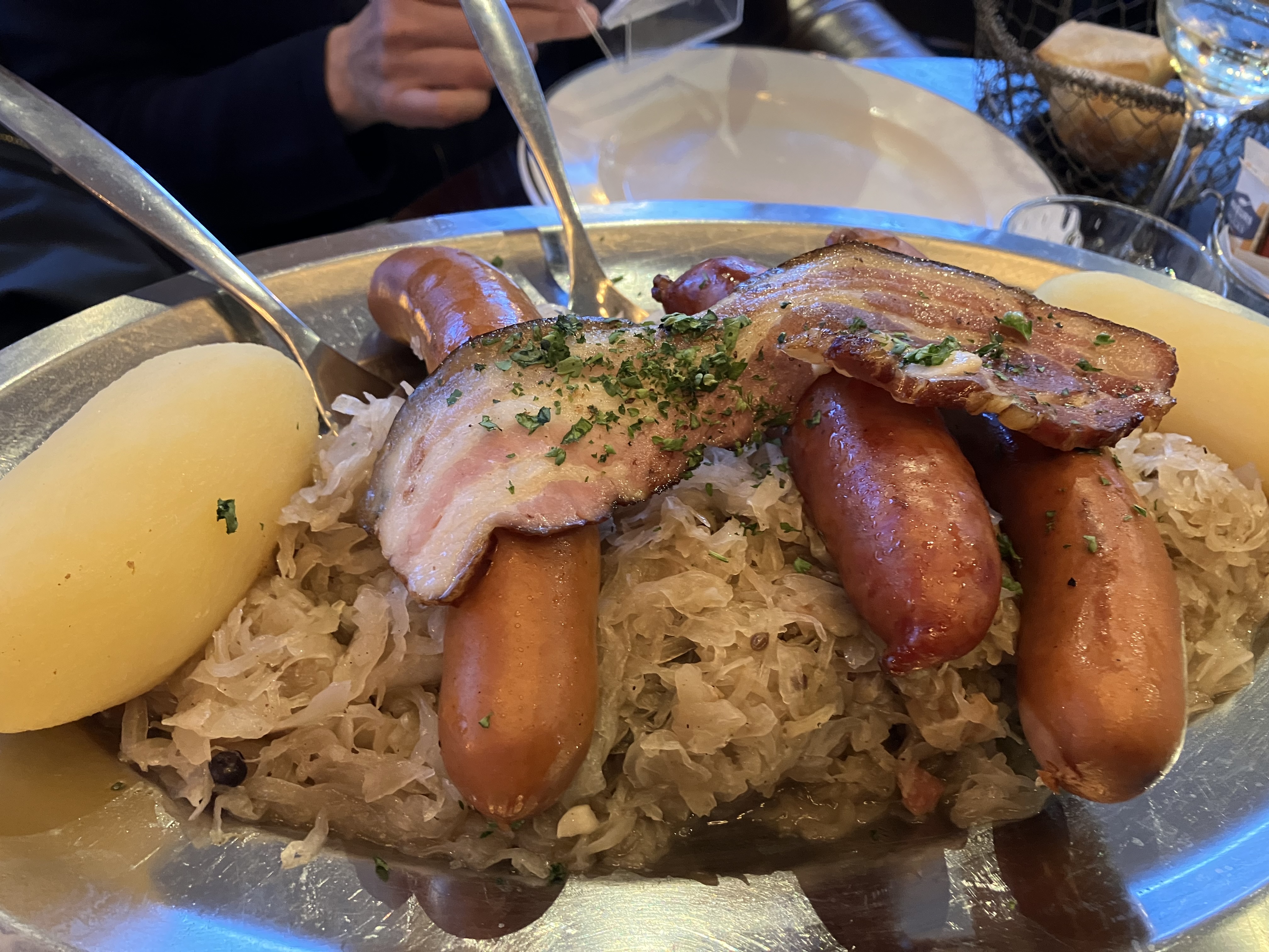 Bonjour nous etions venues entre amis partager ce repas. mon ami me dit prend donc la pomme de terre ainsi la choucroute pour la goûter suprise je nai pas pu en prendre!!!! le serveur avait deja enleve la cuilliere et pour finir je navais que la fourchette car deja il enleve le plat de choucroute cetait le chapeau franchement c.est pas le top