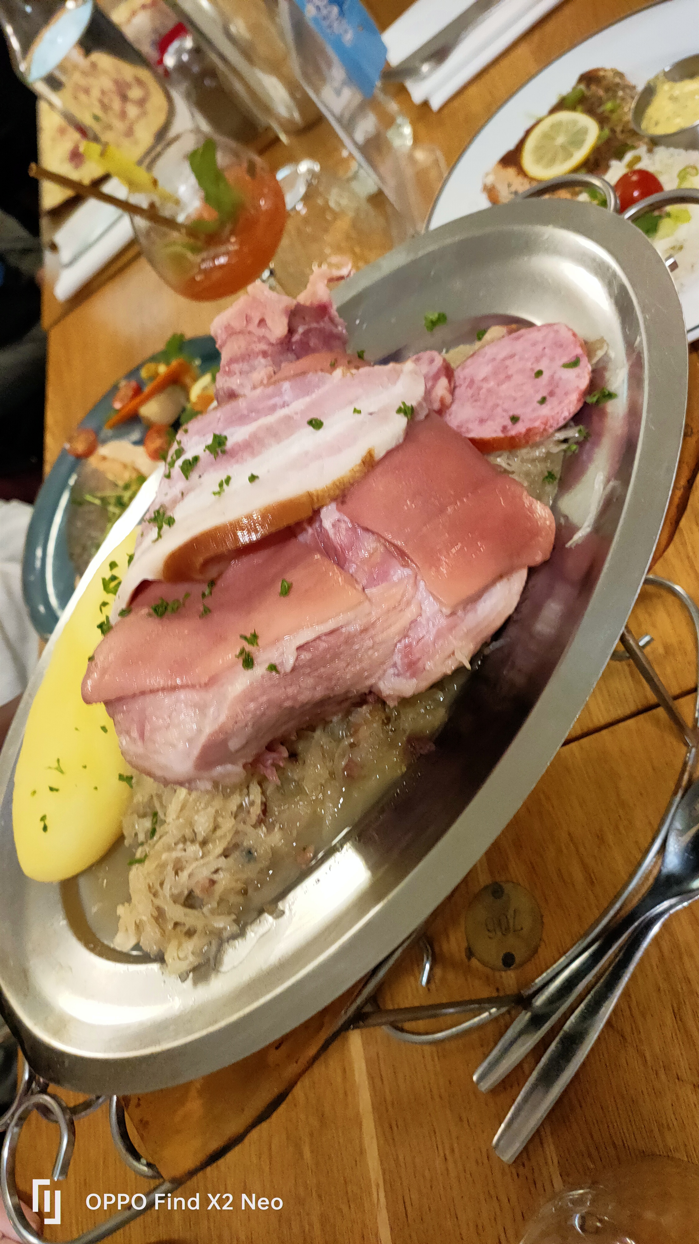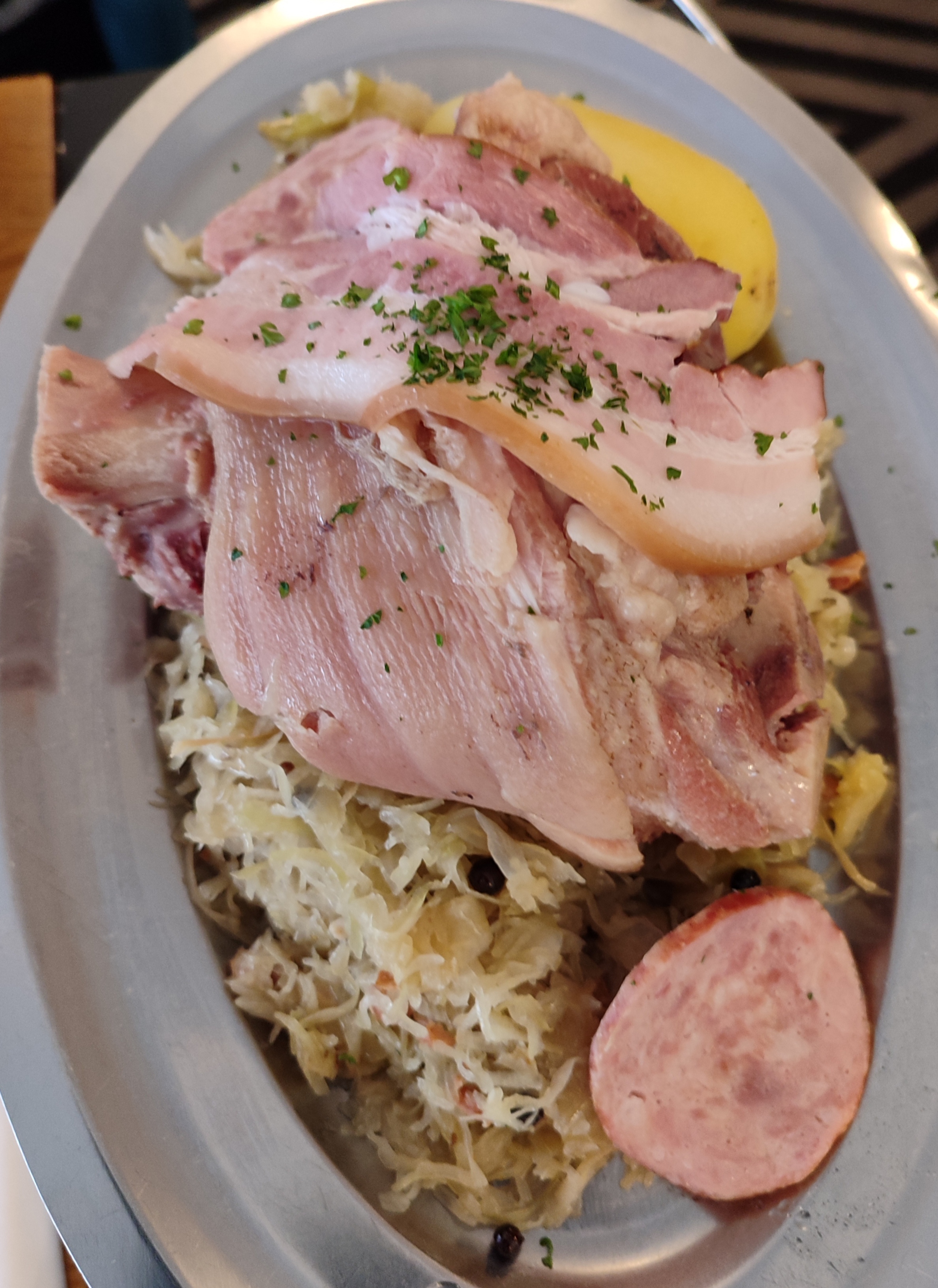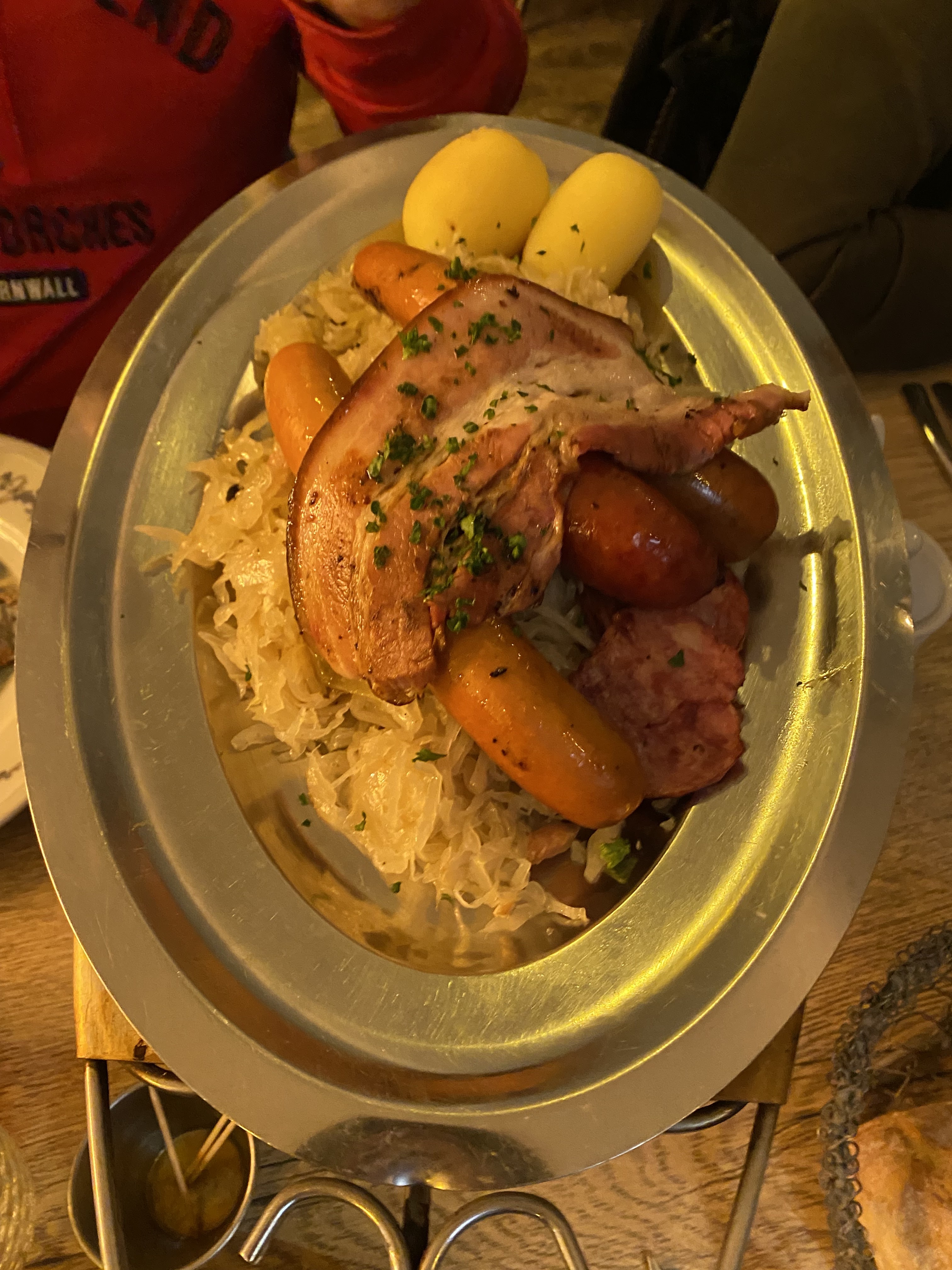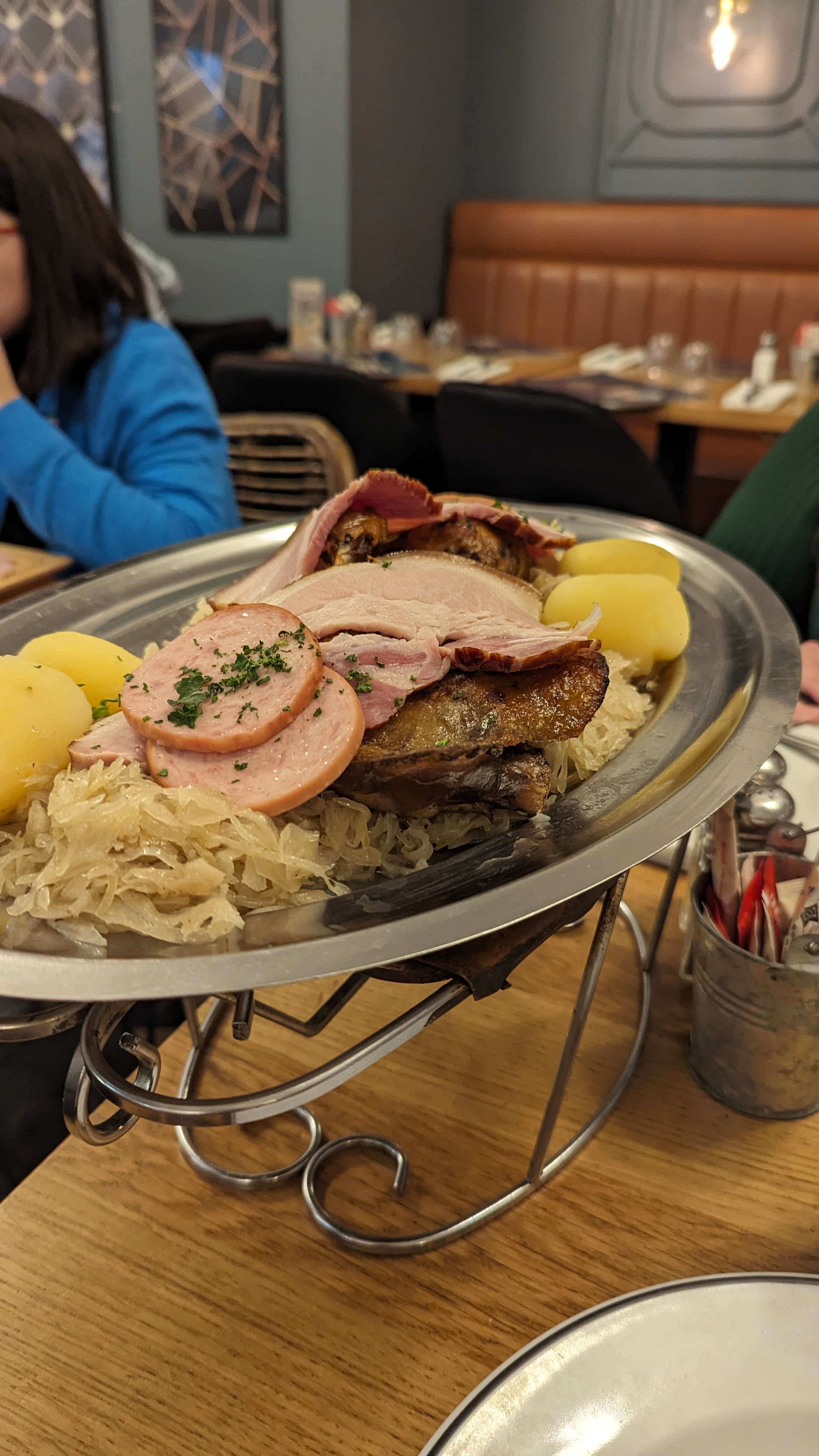 Bonjour nous etions venues entre amis partager ce repas. mon ami me dit prend donc la pomme de terre ainsi la choucroute pour la goûter suprise je nai pas pu en prendre!!!! le serveur avait deja enleve la cuilliere et pour finir je navais que la fourchette car deja il enleve le plat de choucroute cetait le chapeau franchement c.est pas le top