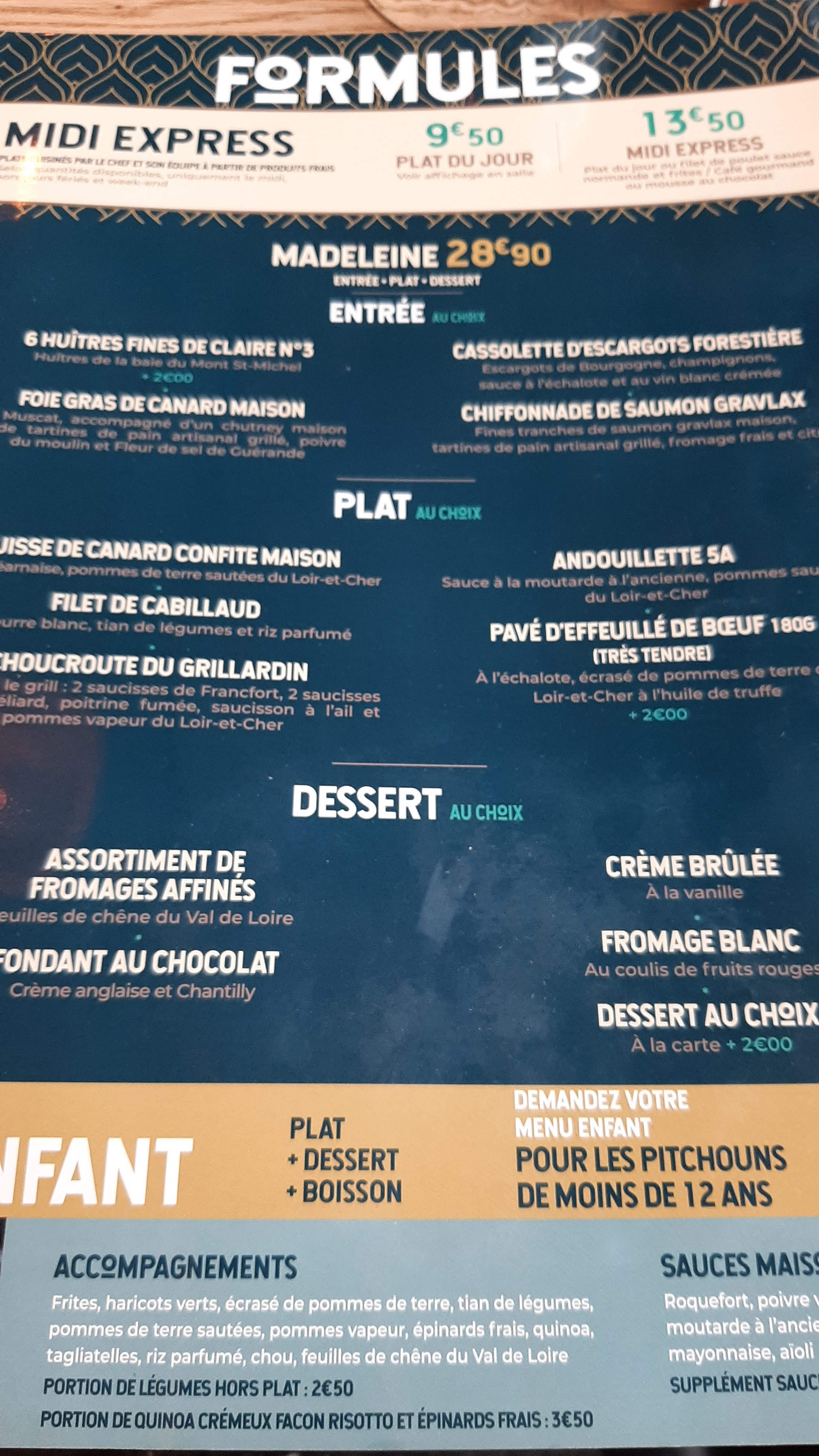 Belle brasserie tourangelle traditionnelle que j’ai connue naguère sous un autre nom. J’ai été comblé par une assiette de la mer : trois huîtres, crevettes roses et grises, bulots et bigorneaux, le tout servi avec deux petits pains de qualité et les traditionnelles mayonnaise et sauce aux échalotes. Un verre de Quincy, sauvignon blanc, sec et vif, aux arômes d’agrumes et légèrement fleuri. Une mousse au chocolat copieuse. Bon rapport qualité/prix, service rapide, aimable et soigné. Bravo et merci !