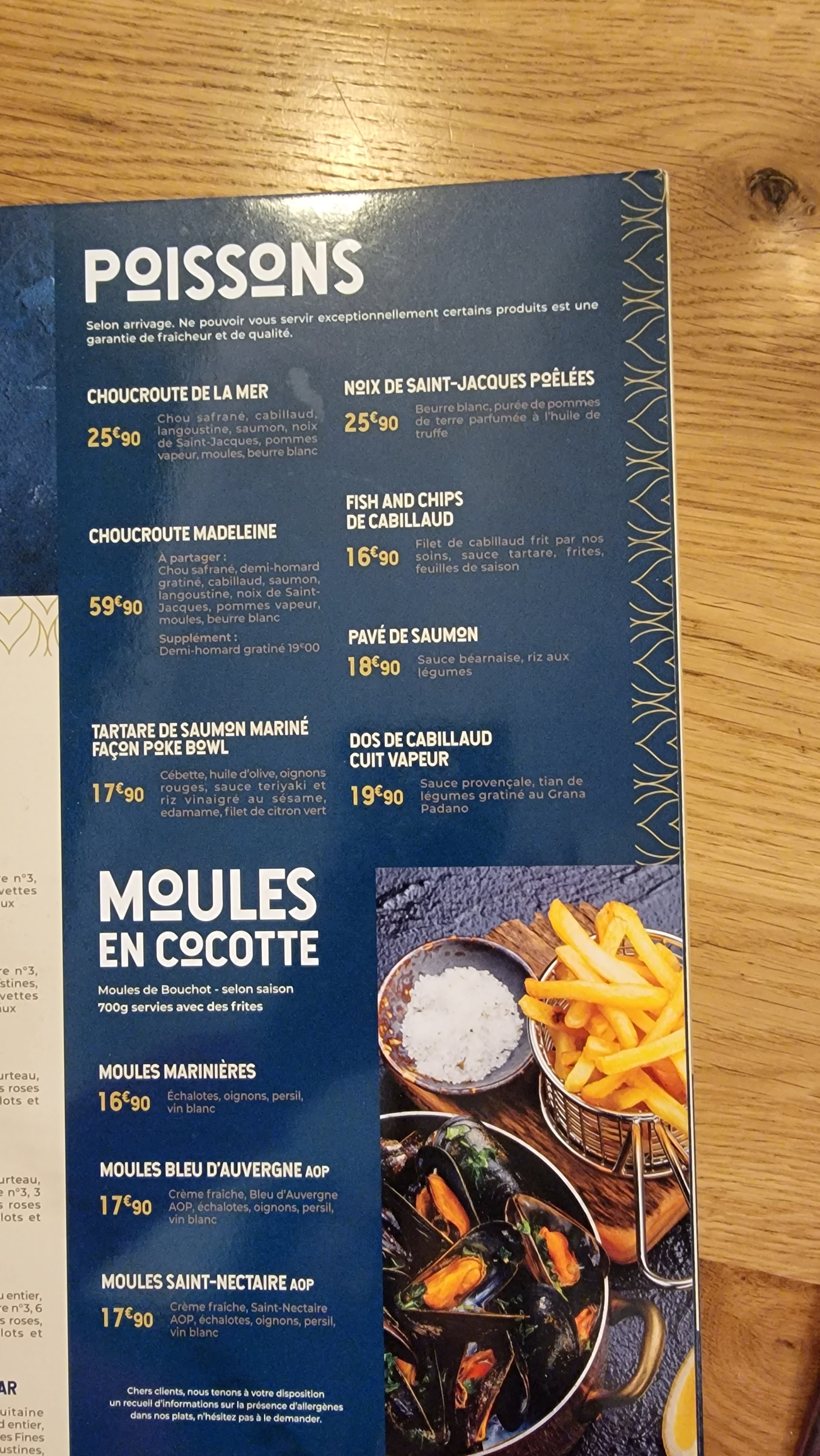 Nous étions venu manger des moules dans ce restaurant qui est spécialisé en fruits de mer. La serveuse nous a dit que ce n'était plus la saison et qu'ils en avait pas.. nous pensons que les frites sont congelés car pas exceptionnel. Concernant les crêpes elles sente le rhum et ce n'est pas préciser sur la carte. Quand on craint le goût d'alcool c'est pas tres honnete.... Concernant l'ambiance nous étions placer à coter d'un groupe qui fêter un anniversaire et ils faisait beaucoup de bruit. Ils aurait pu être placer à l'écart pour éviter de déranger les autre client. Sachant que deux personnes ont demander de changer de table.