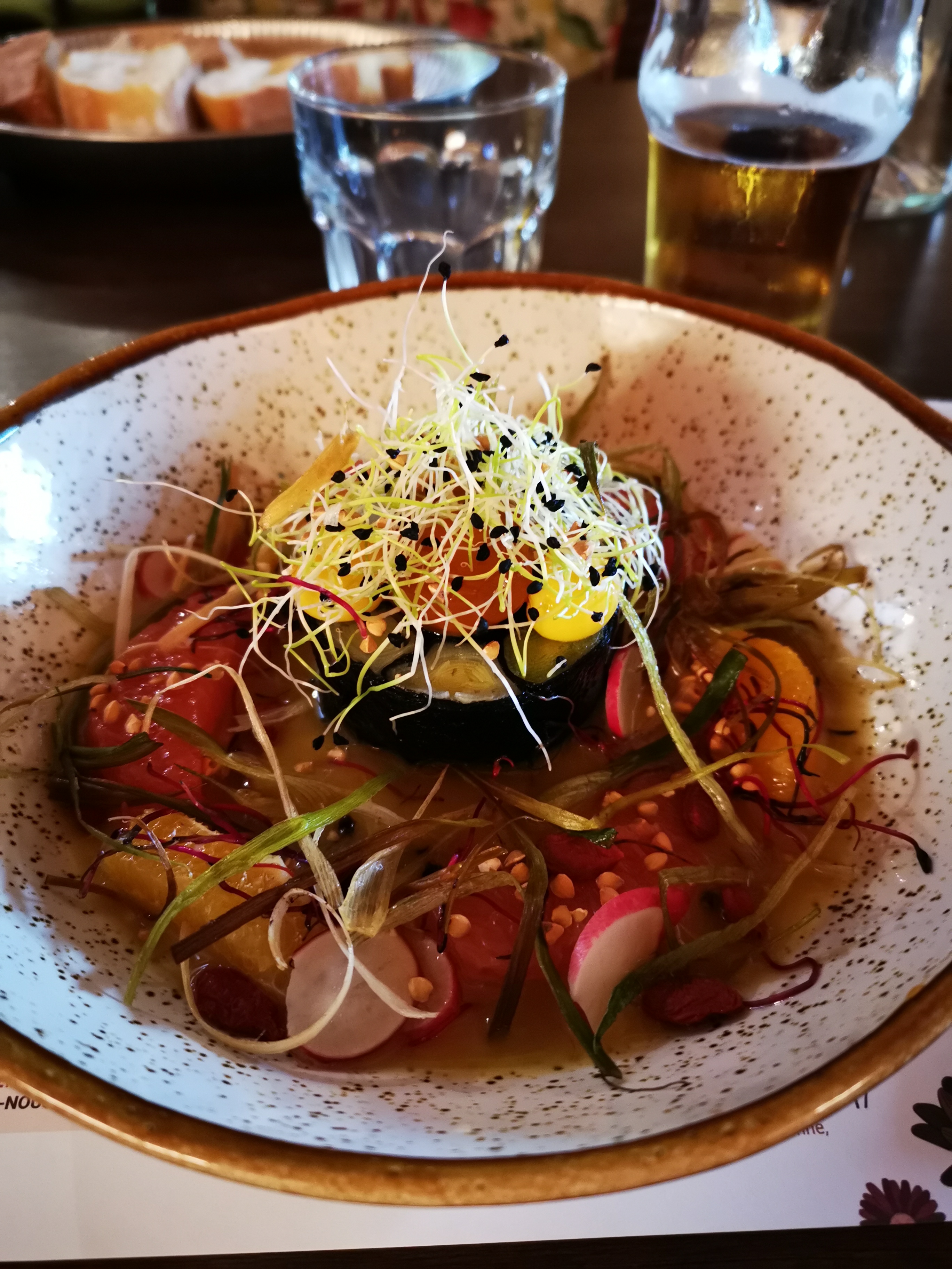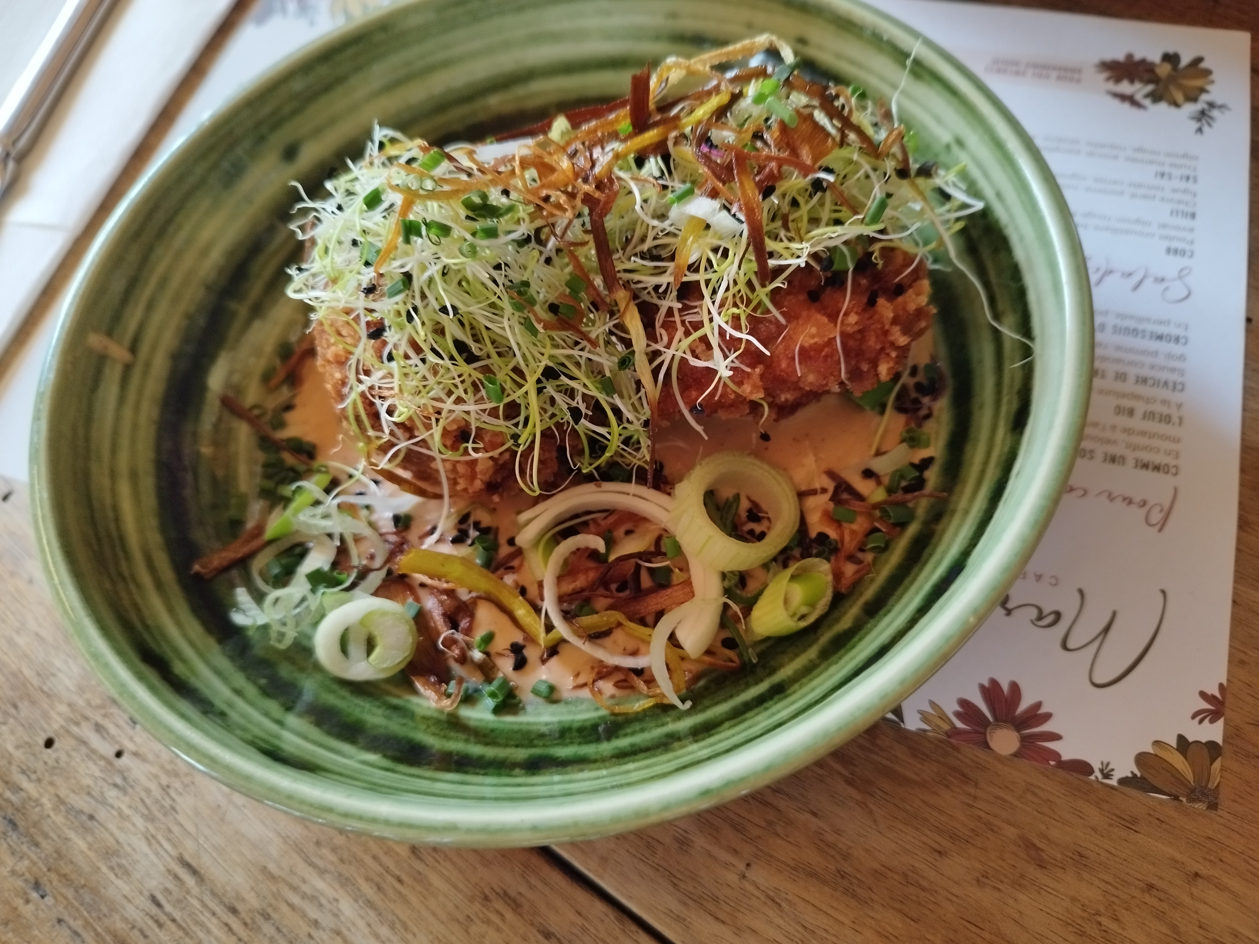 Repas en famille un dimanche midi. L'établissement est beau, le bois et la déco apportent un charme fou. Quant à l'assiette...bien présentée et très bien garnie. C'était un super moment et une superbe découverte. Il me tarde déjà d'aller goûter les autres plats. Merci et bravo !