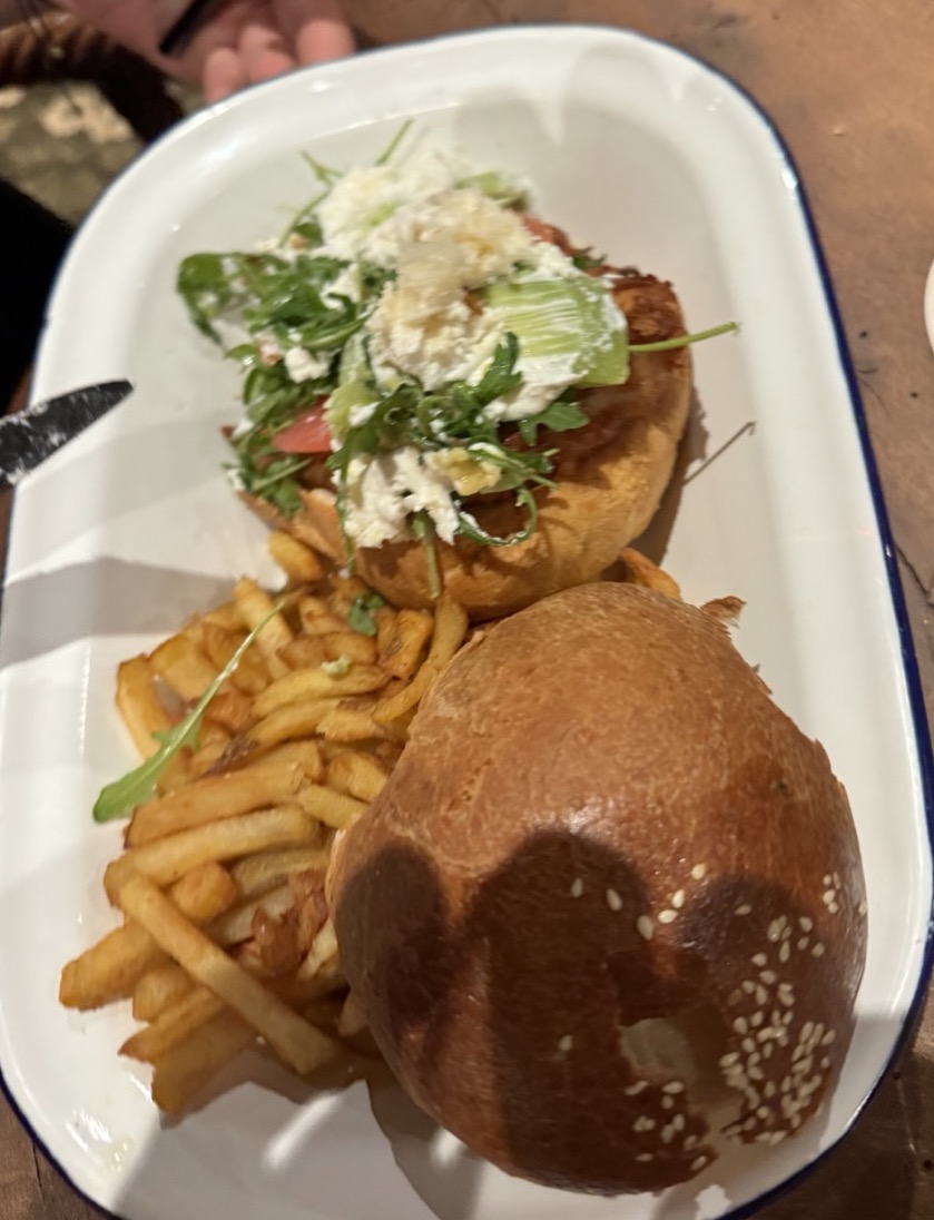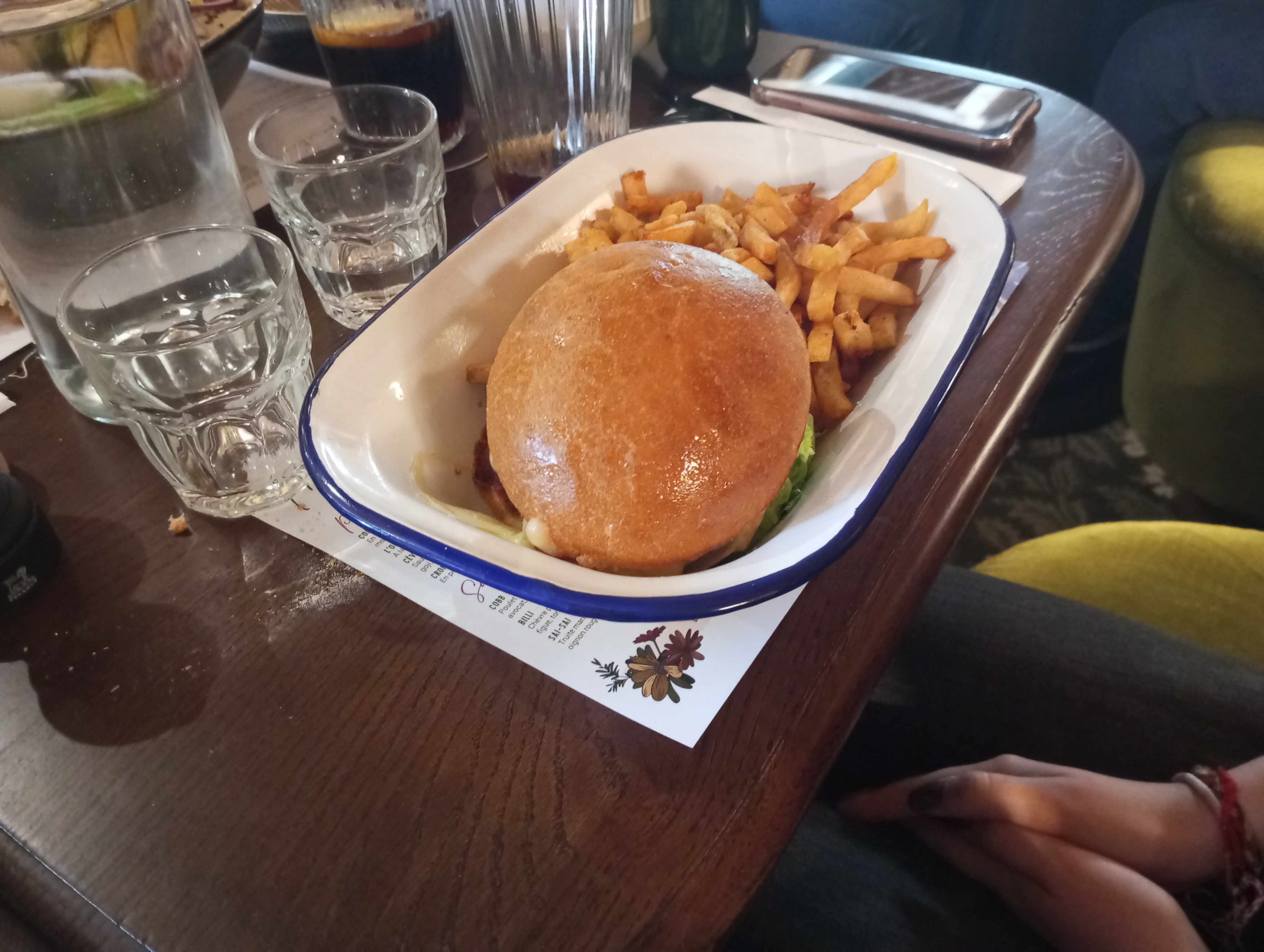 Décoration vintage et très jolie. Personnel charmant. Le burger et très simple, il ne nous a pas conqui surtout servi dans un plat en métal blanc à bord haut (pas facile pour couper le buger) cette assiette fait penser aux plateaux dont se servent les infirmières dans les hôpitaux ... je nai pas apprécié, dommage. J'y retournerai pour prendre un plat afin de me faire une meilleur impression. Svp changer les assiette blancs en métal.. et ce sera très bien pour mon .