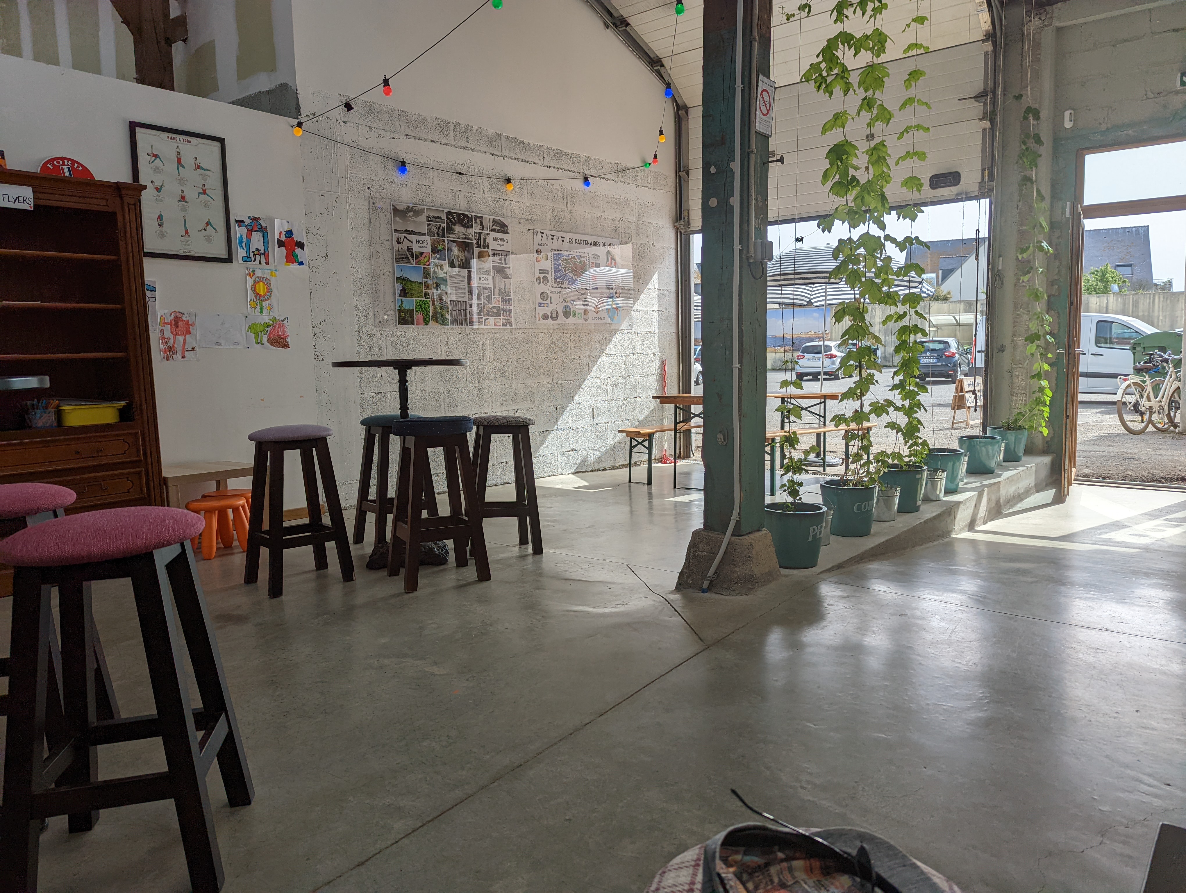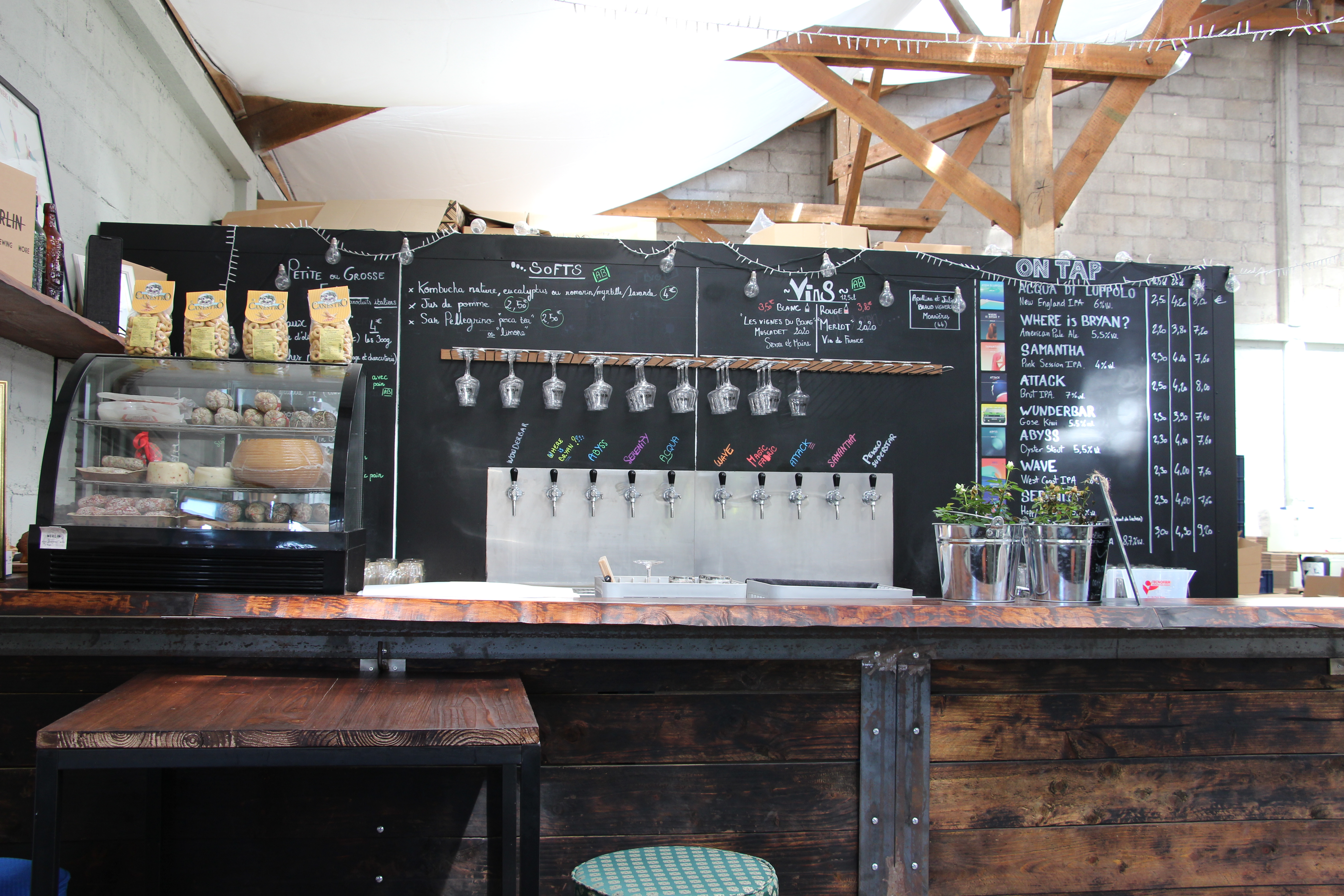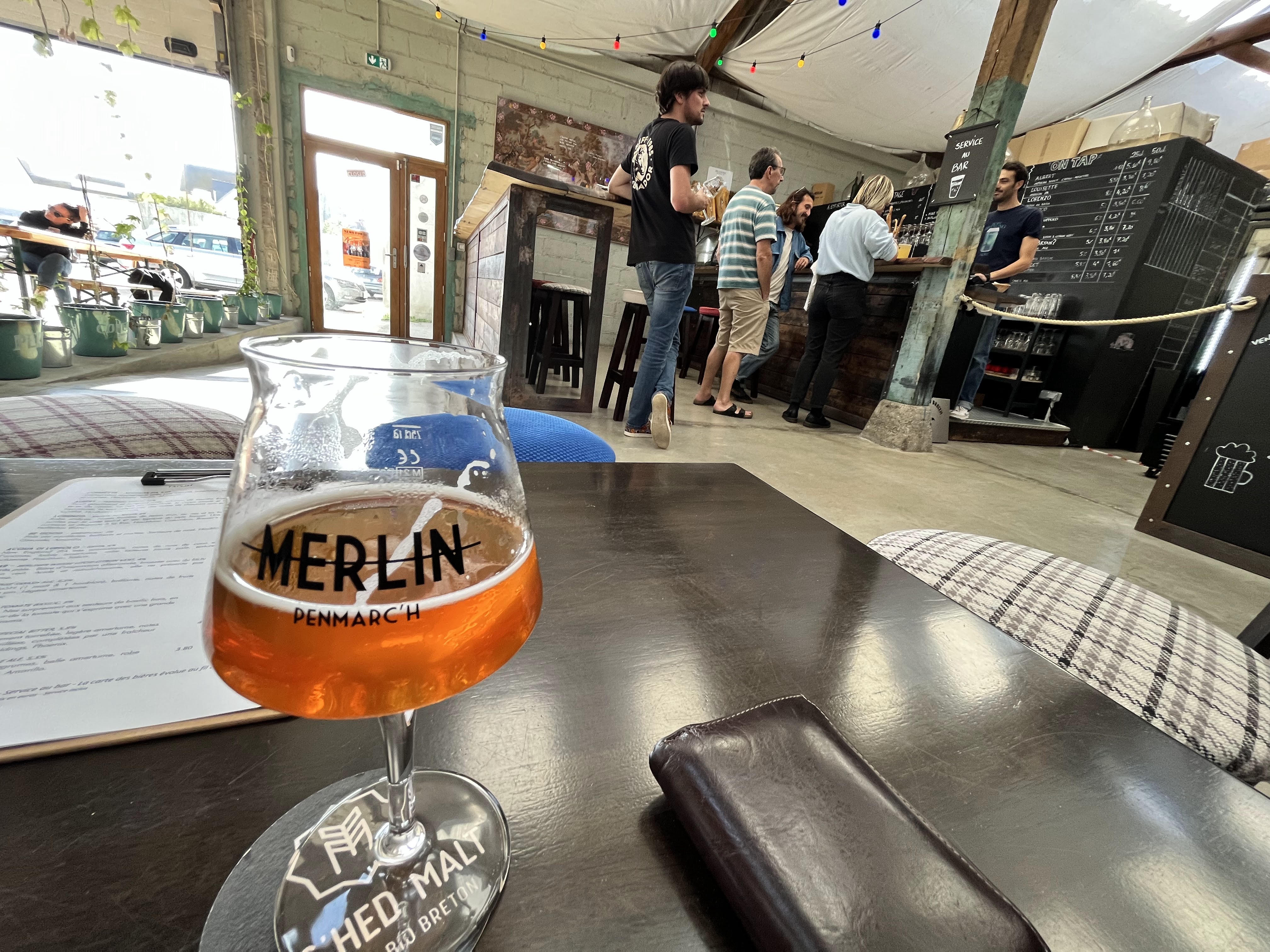 on se croirait un peu à Berlin avec ce côté indus' résume bien mon impression :) dans un grand hangar bien aménagé Merlin vous accueille, à grand renfort de bières maison variées et de planches très abordables. Lors de notre visite la Gose Kiwi, bière peu amère et infusée au kiwi, était dans la carte : si elle y est toujours lors de votre passage, je la recommande, surtout pour les gens qui craignent l'amertume de la bière justement.