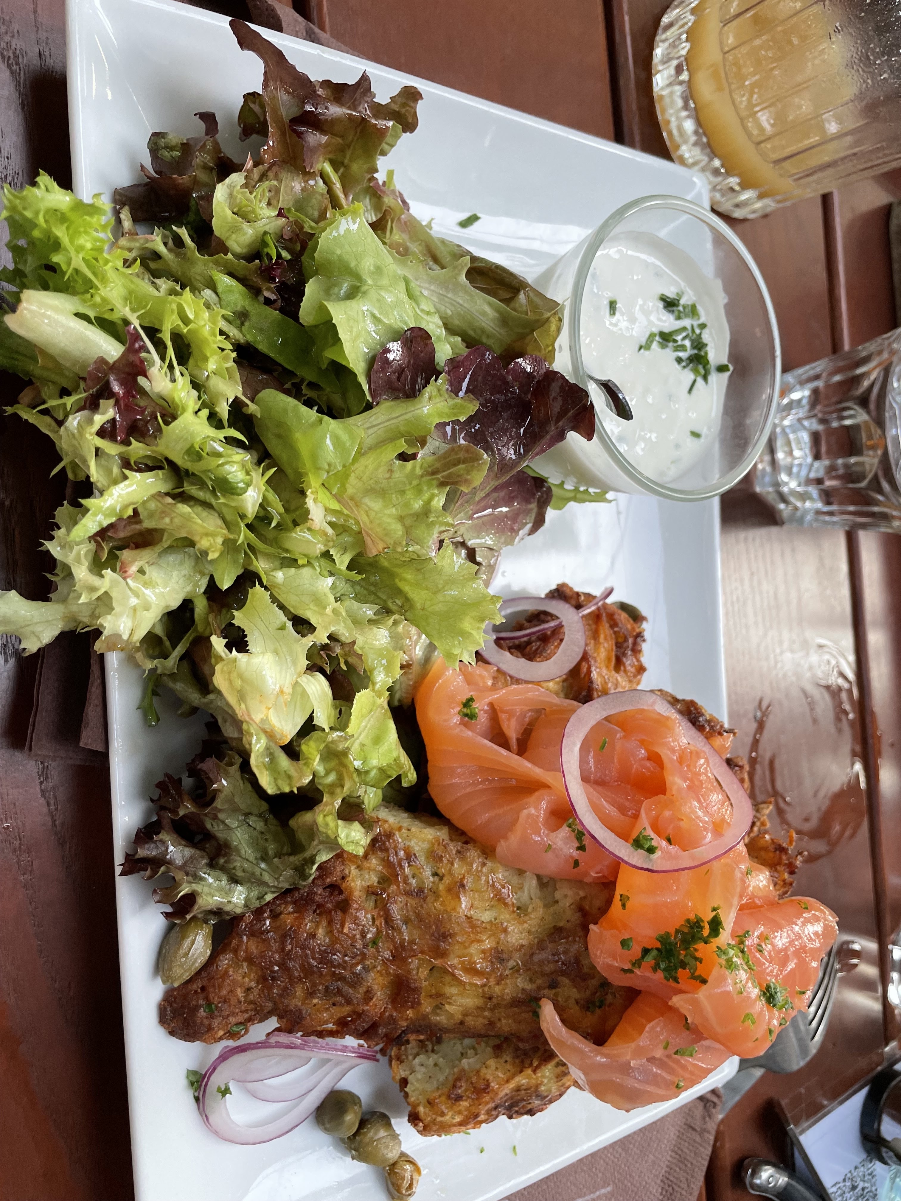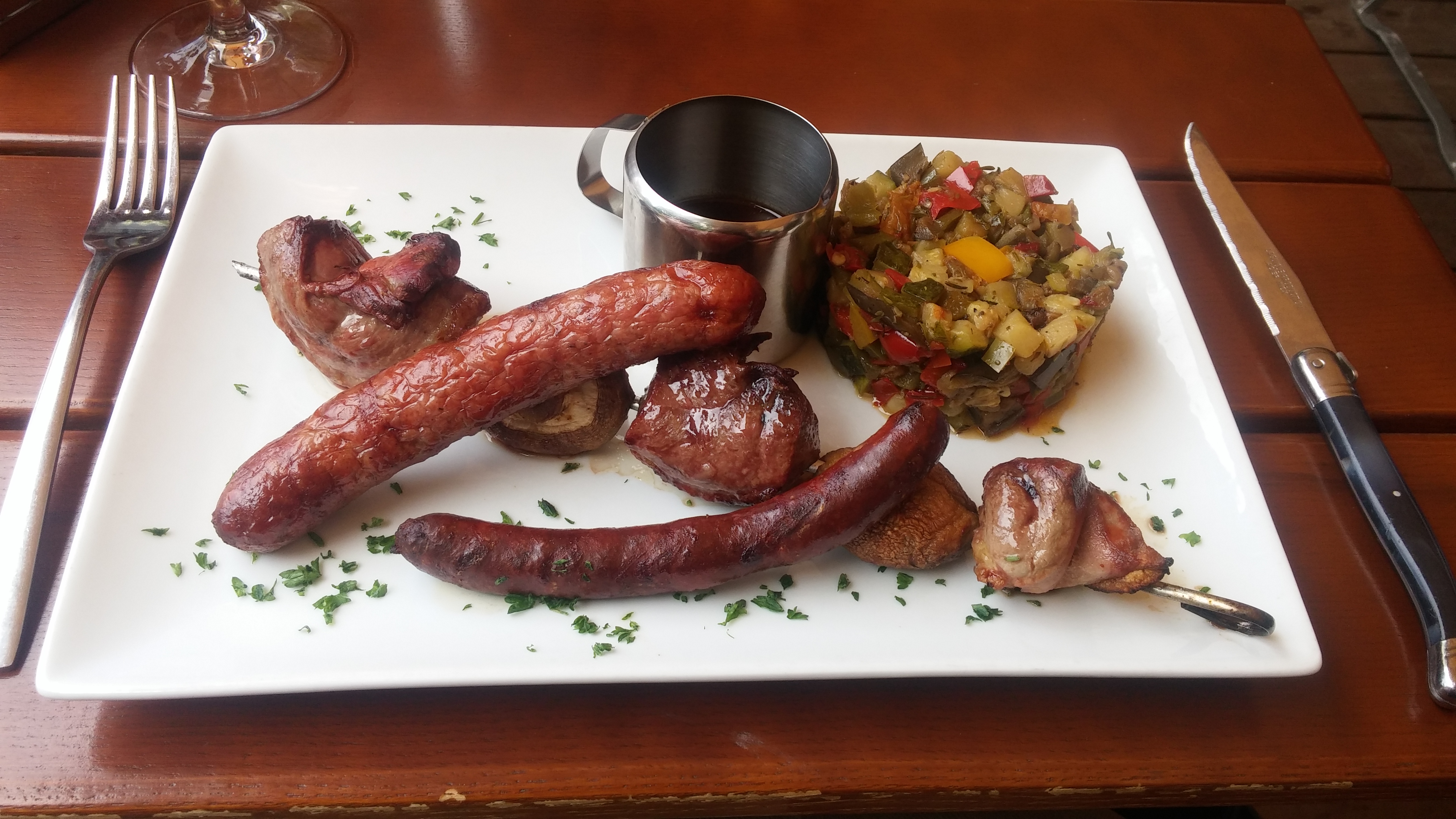 Cadre très sympathique et belle terrasse ombragée. Personnel sympathique. Galettes de pomme de terre pourraient être plus fines dommage
