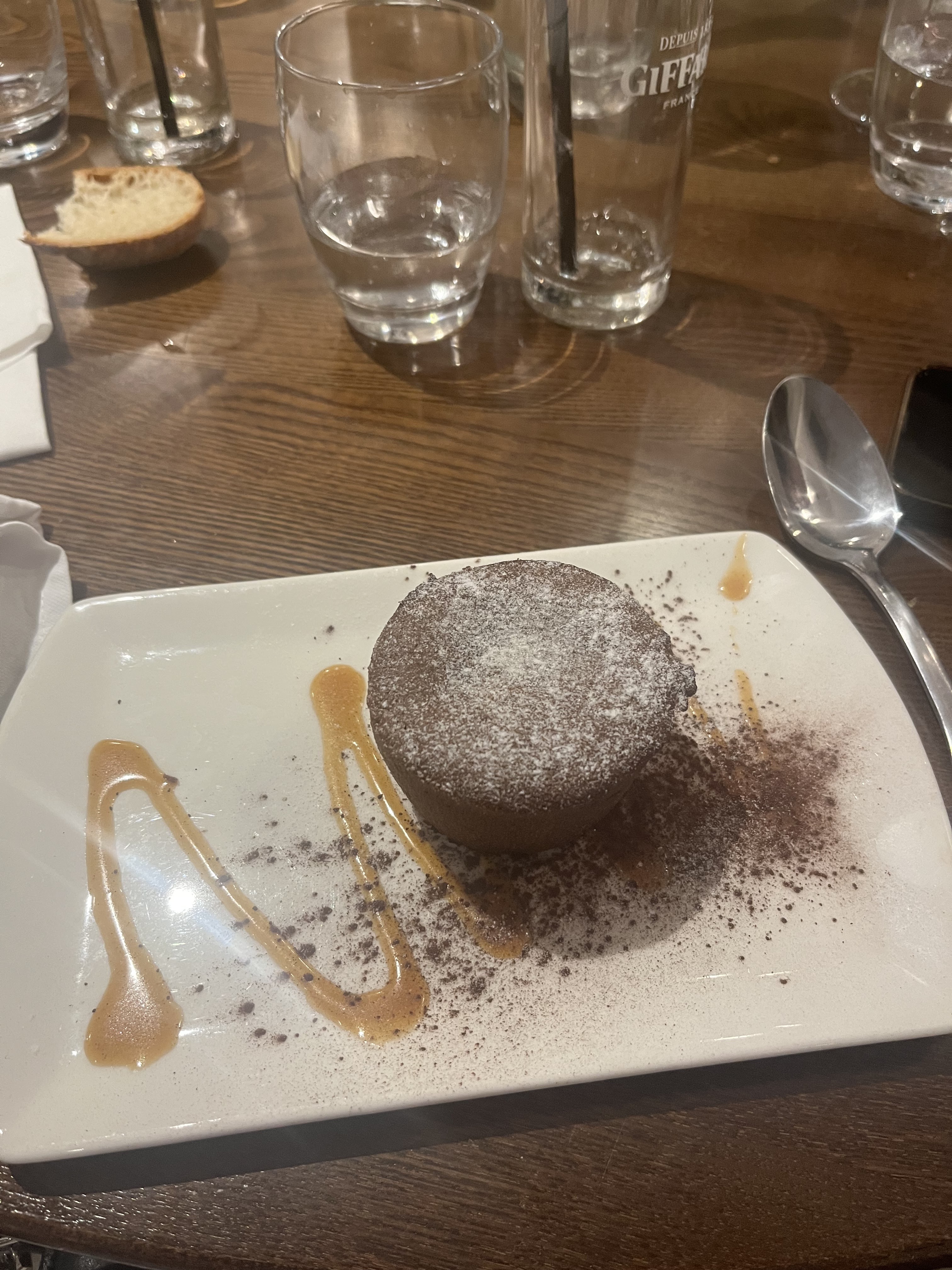 Avis mitigé. Le service est très bien avec des serveurs et serveuses souriants et à l'écoute. Le service est assez rapide. Pour ma part, j'ai pris un menu avec terrine des copains qui était bonne, un magret de canard confit avec une bonne sauce accompagné de pommes de terre sarladaises beaucoup trop cuites, sèches et dures, déception, ma belle-mère ne les as pas mangé, puis moelleux au chocolat qui était froid parce qu'industriel, déception (accompagné d'une boule de glace vanille, j'en ai 2, ma nièce n'aime pas la glace). Nous étions 10 un samedi midi et ceux qui ont pris la même chose que moi ont le même sentiment, pour les autres choix, ils étaient à priori satisfaits.