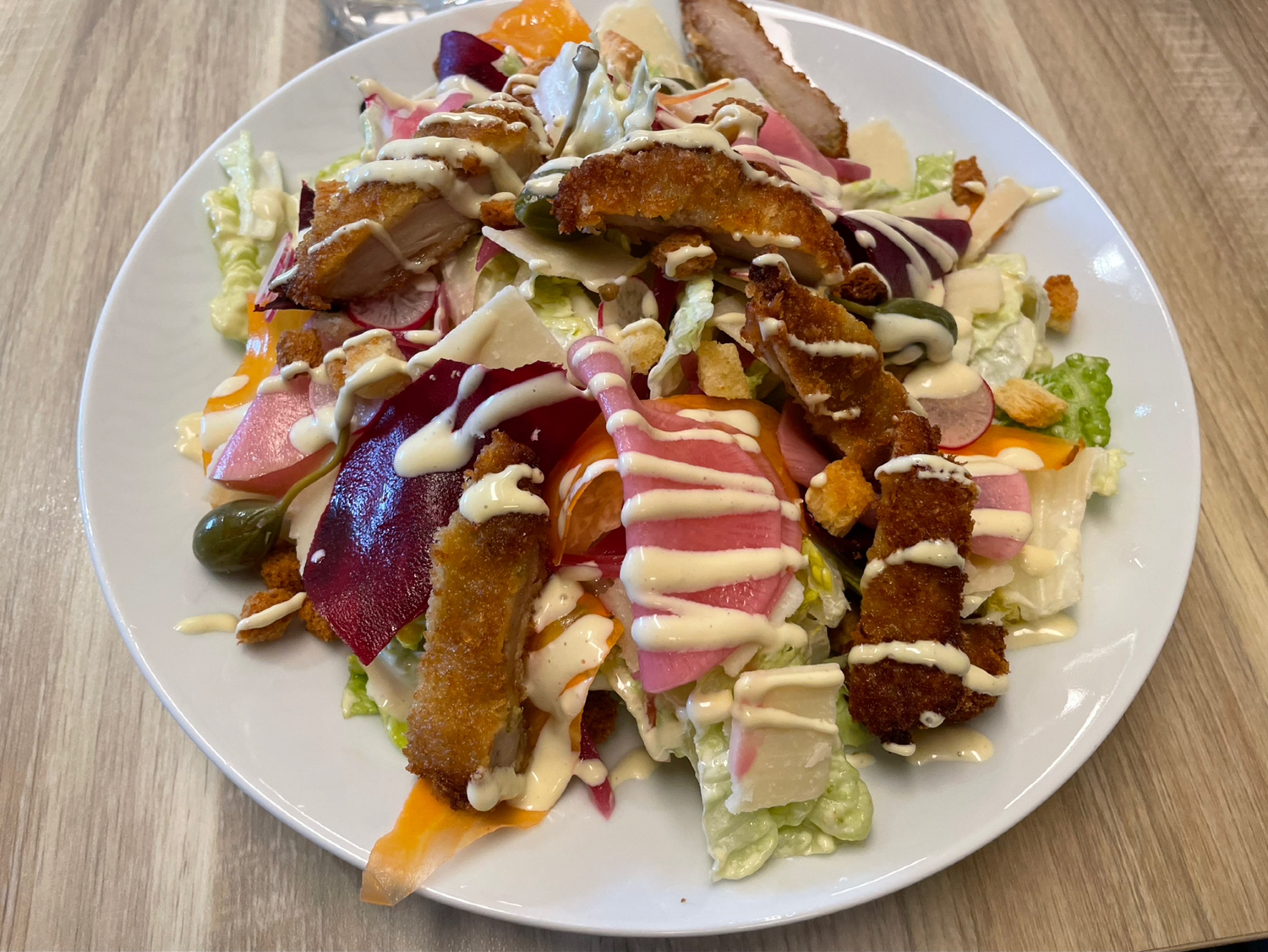 Très bonne salade caesar : le poulet pané est délicieux et les ingrédients sont top 👍🏾 Le pain est aussi très bon et le service est parfait 👌🏾