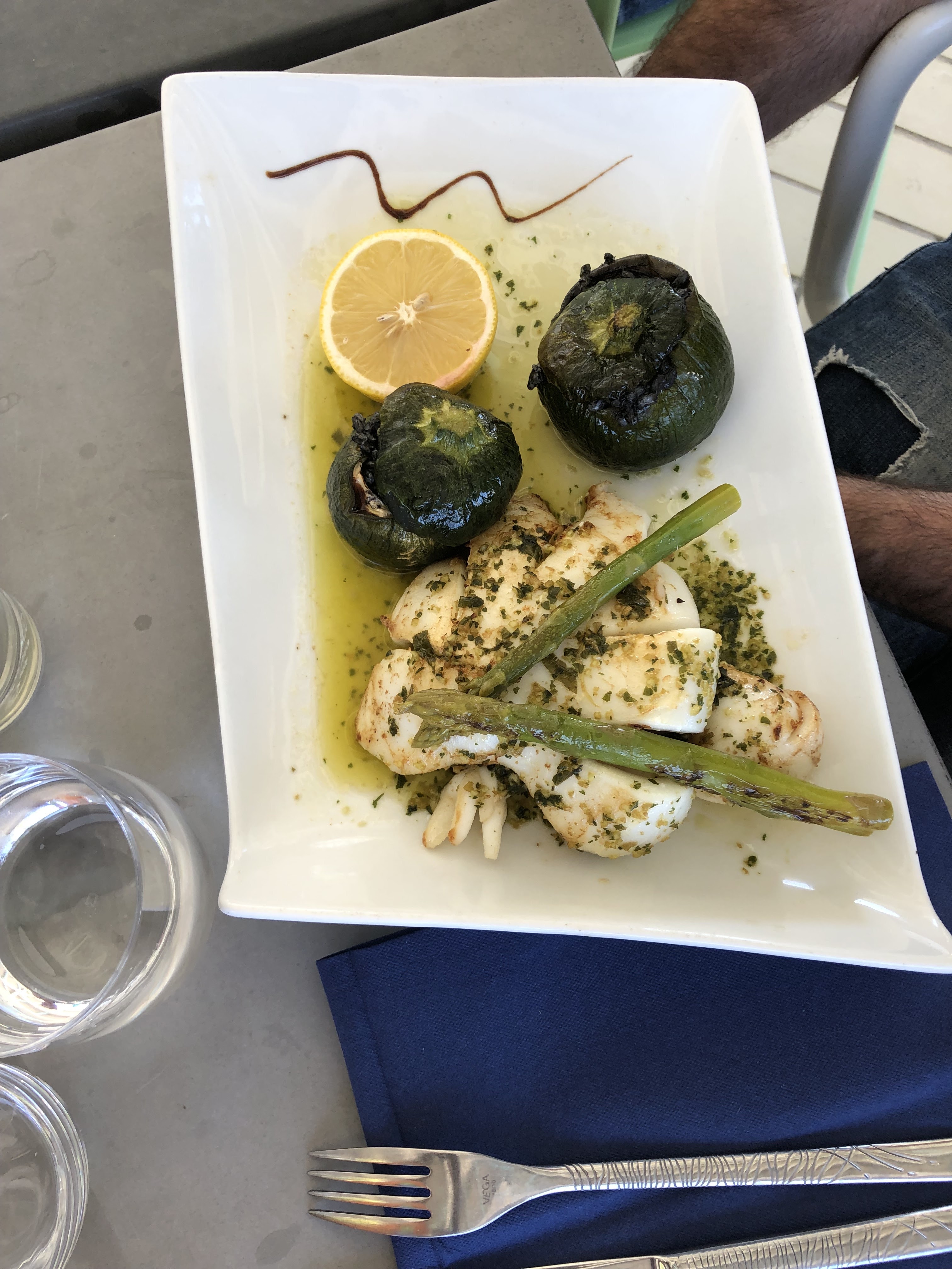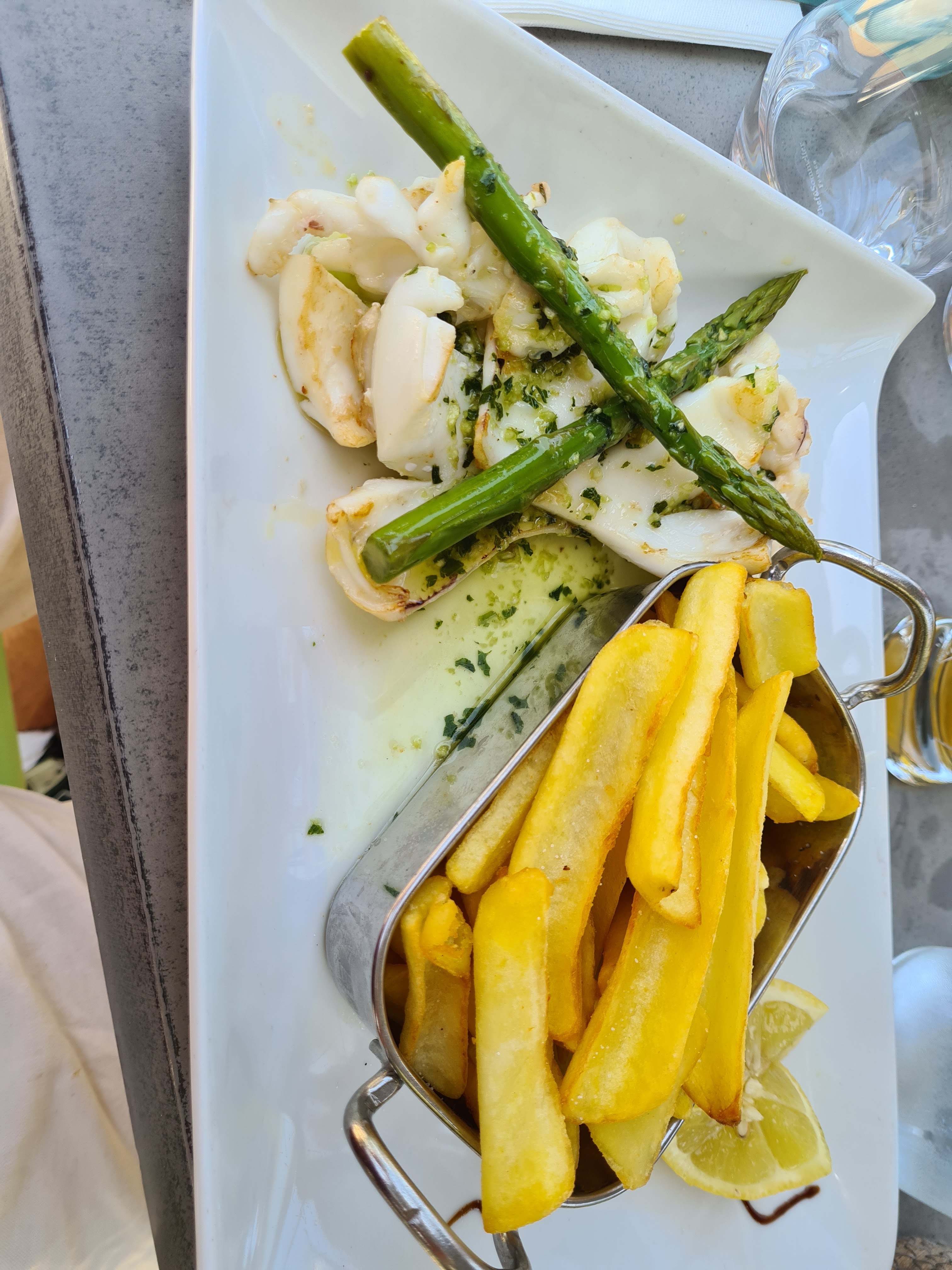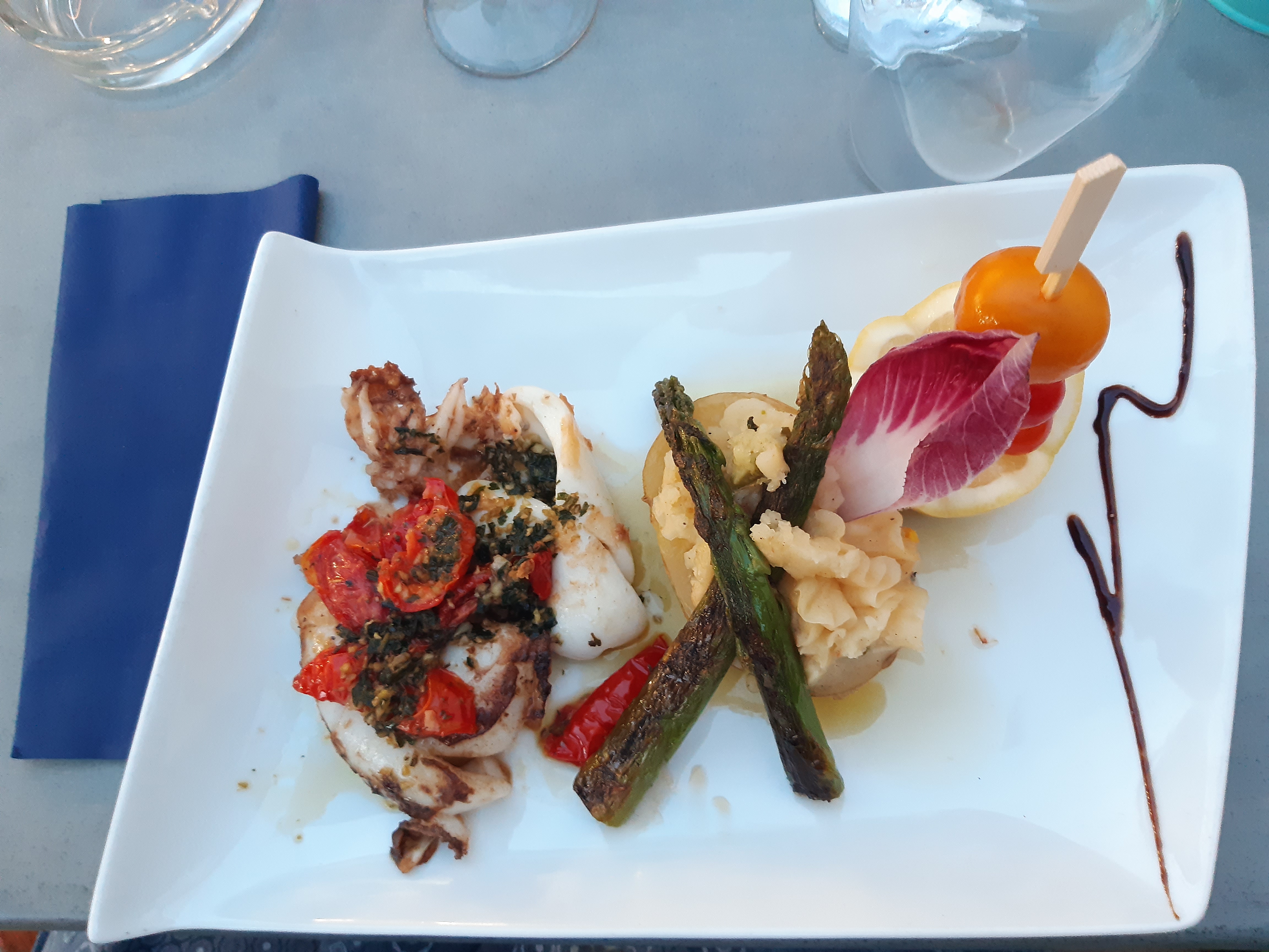 Délicieux repas. Seiche a la plancha accompagnée de légumes. Cuisson parfaite!