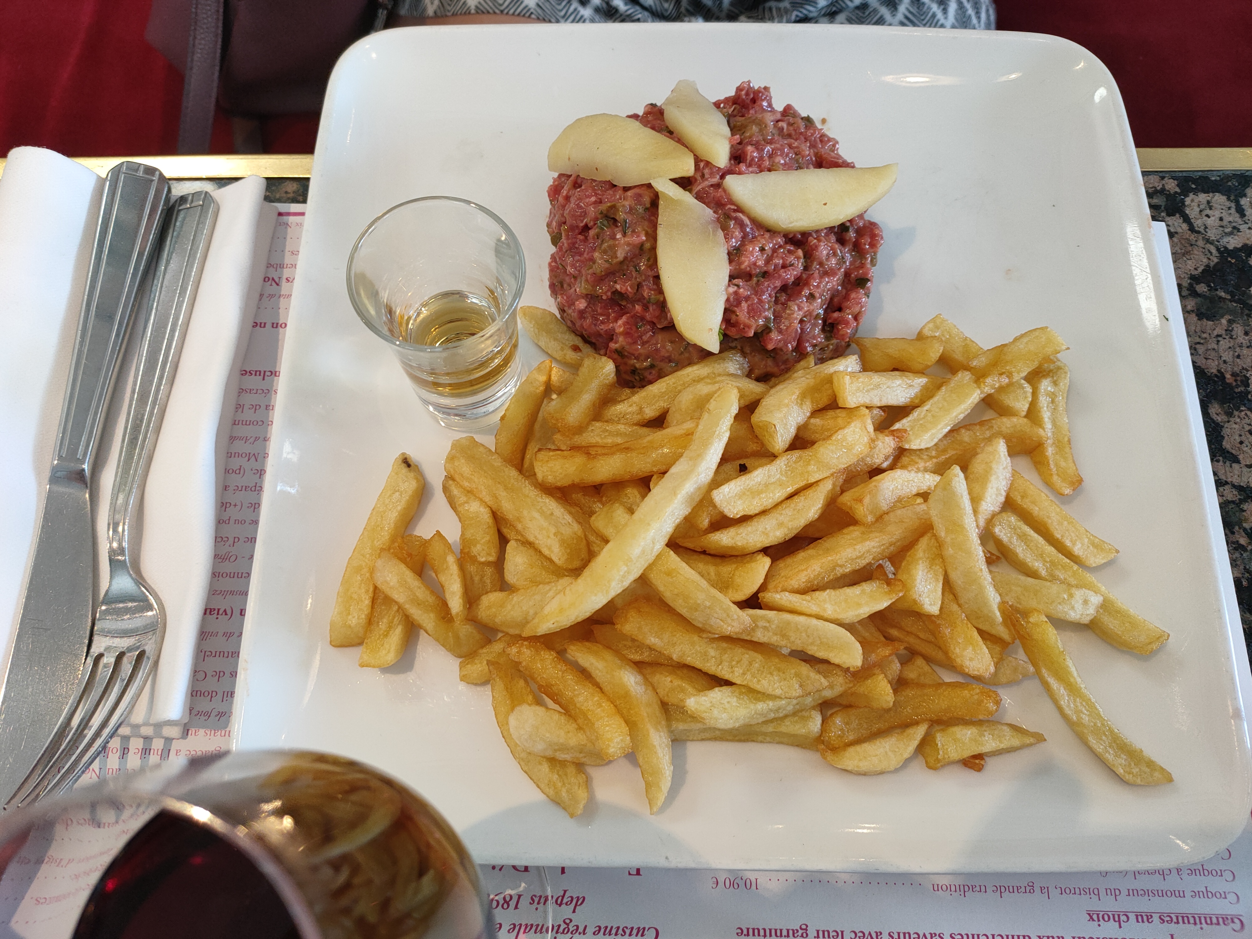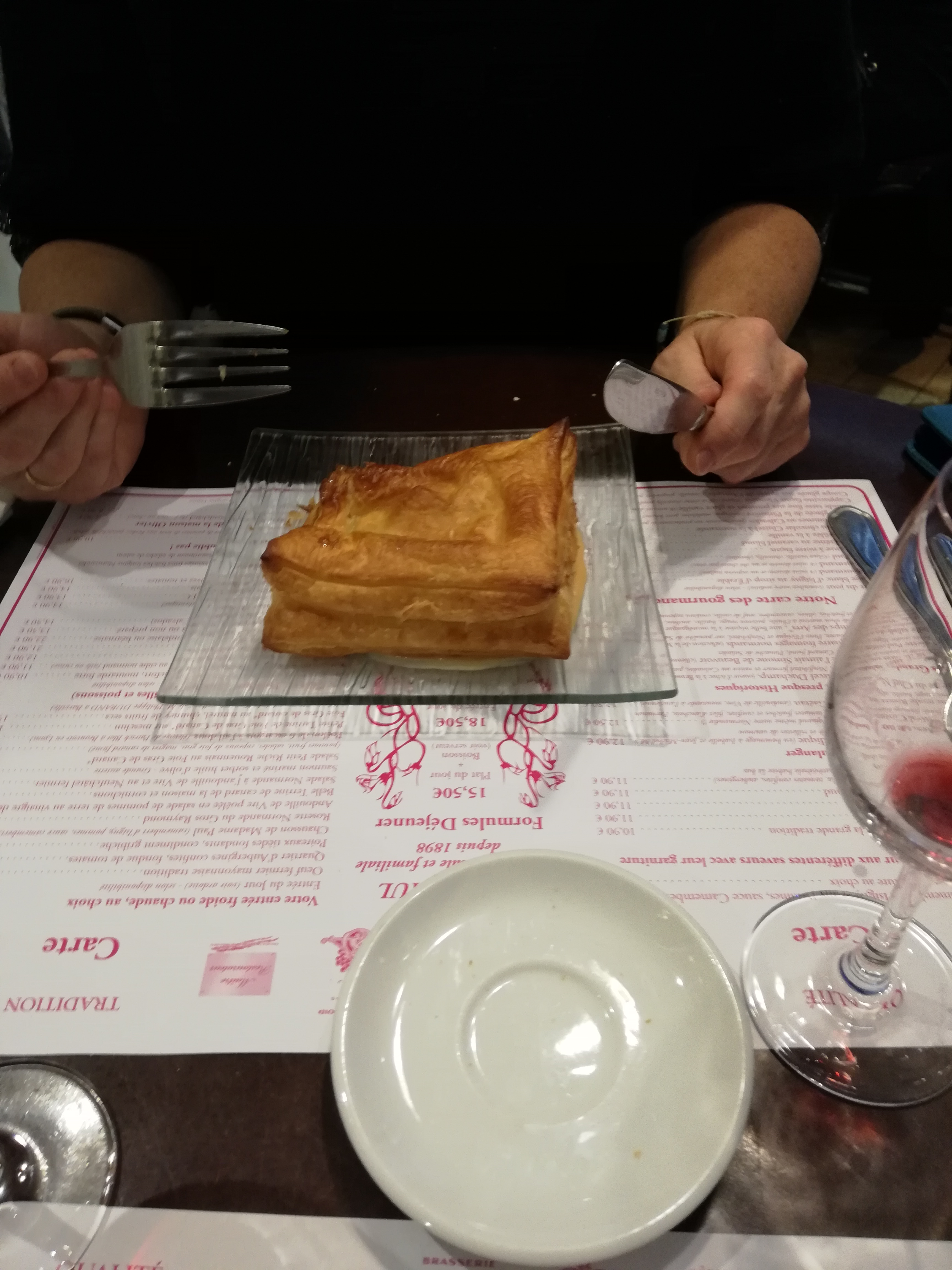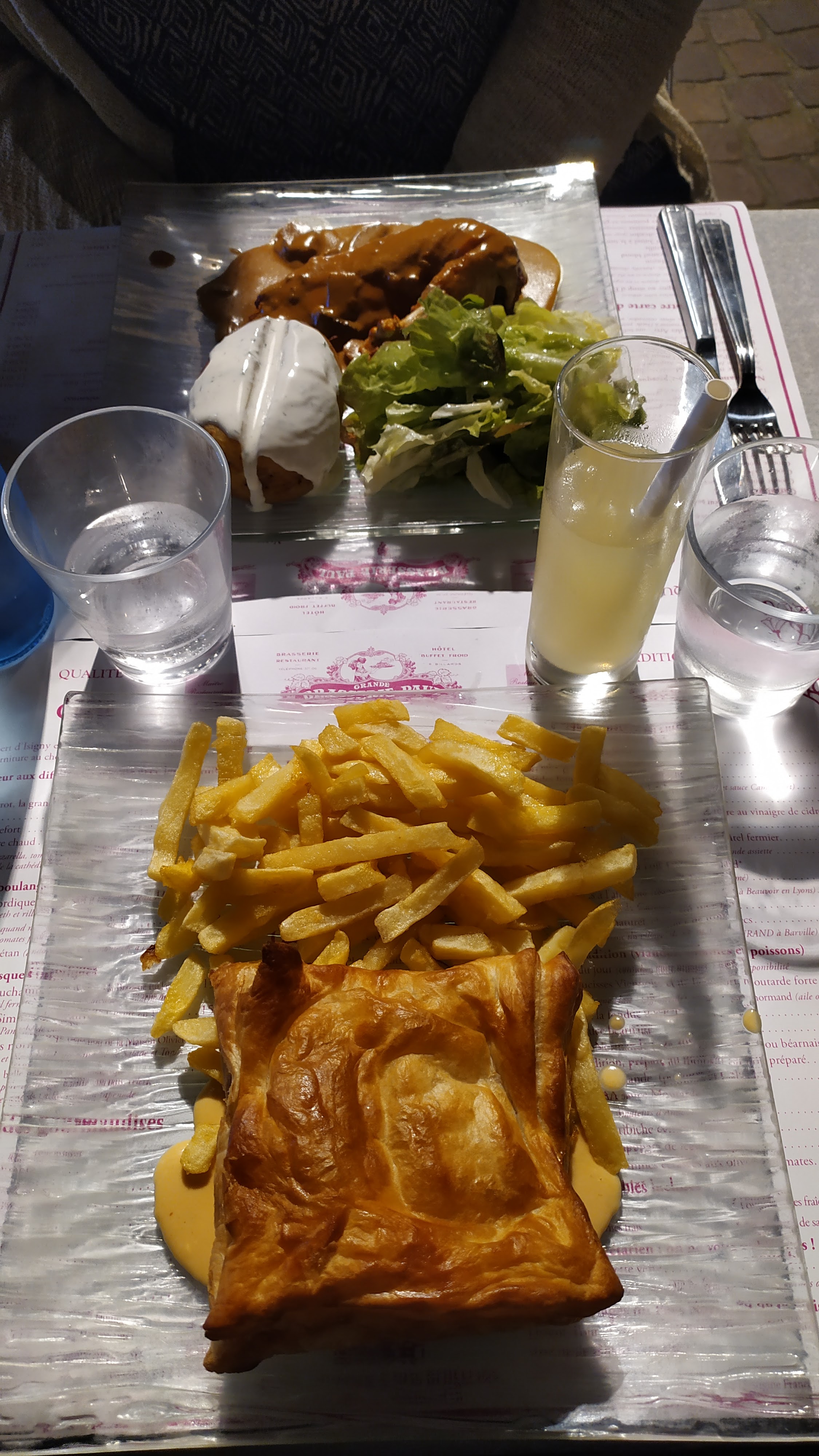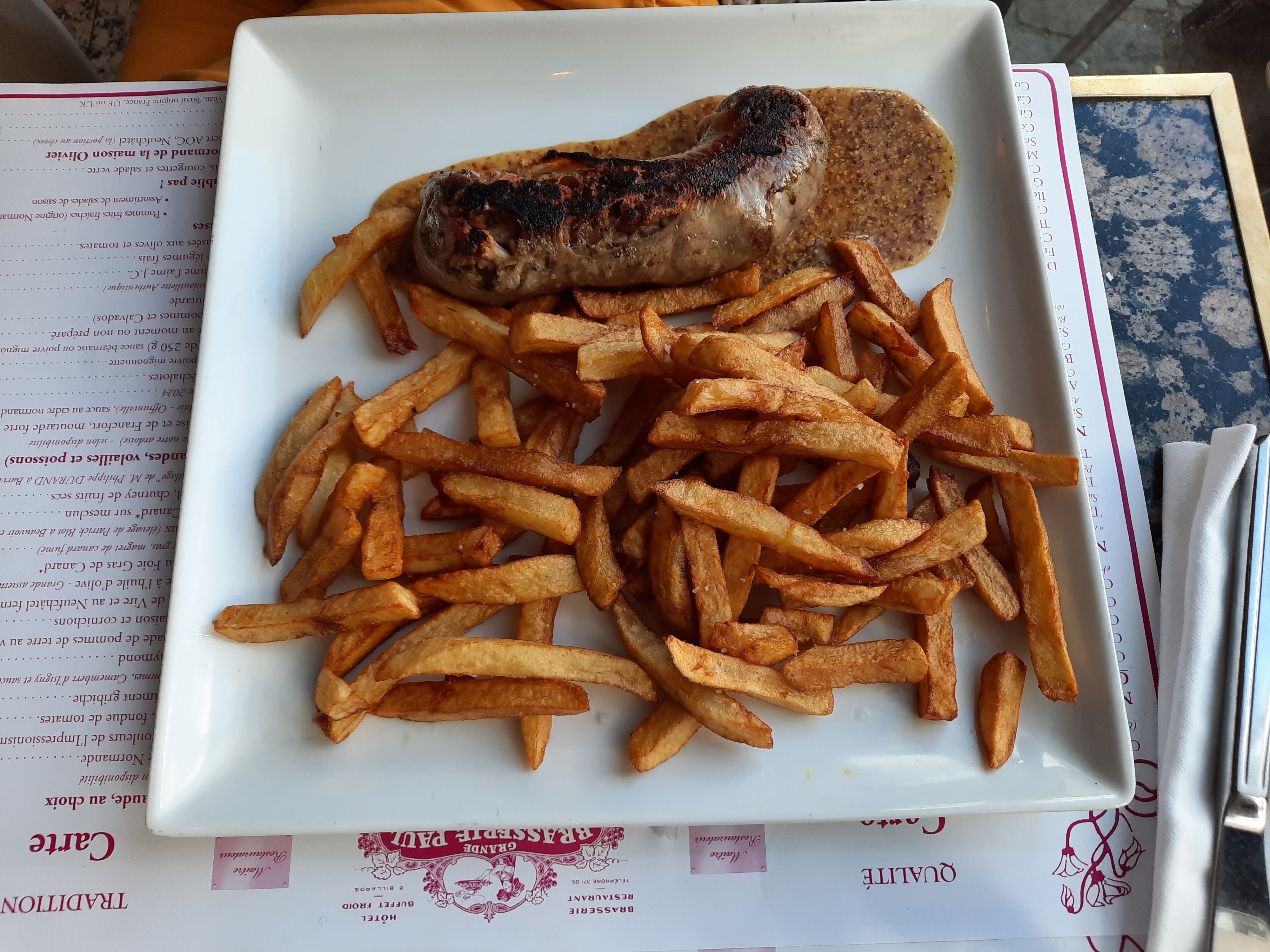 Diner Brasserie typique avec ses plats traditionnels. Décoration avec un mélange d'art nouveau et art déco (très sympa leurs couverts) et j'apprécie d'avoir une vraie serviette de table pour dîner. Entrée : Chausson de Mme Paul Jolie entrée normande. Le feuilletage manque de croquant mais comme j'arrive à l'entrée du service c'est normal. Un fort plus chaud et ça aurait été plus top. Cependant, c'est hyper bon. Le feuilleté repose sur une sauce camembert qui est onctueuse. Et le camembert à l'intérieur a du caractère ce qui m'a agréablement surpris. Les morceaux de pommes sont fondantes mais non caramélisées ce qui permet de ne pas contre balancer le bon goût du camembert. J'ai vraiment aimé cette entrée qu on trouve rarement à la carte. Plat principal : Andouillette AAAAA accompagnée d'une pomme au four et petite salade Enfin une andouillette bien grillée qui sent bon (boyaux bien nettoyés) et bien croquante à l'extérieur mais fondante à l'intérieur ! A l'intérieur ce sont de vrais morceaux, pas le truc bizarre et gras qu'on trouve dans les AAAAA de contrefaçon. Fromage livarot Bon mais pas assez fait. Comme j'avais pris du cidre fermier bio, le goût de ce bon fromage n'a pas été suffisamment relevé. En même temps, il faut vraiment être amateur de fromage goûtu pour le manger bien fait. Mais bon... Je conseille et reviendrai dans cette brasserie lors de mon prochain passage sur Rouen.
