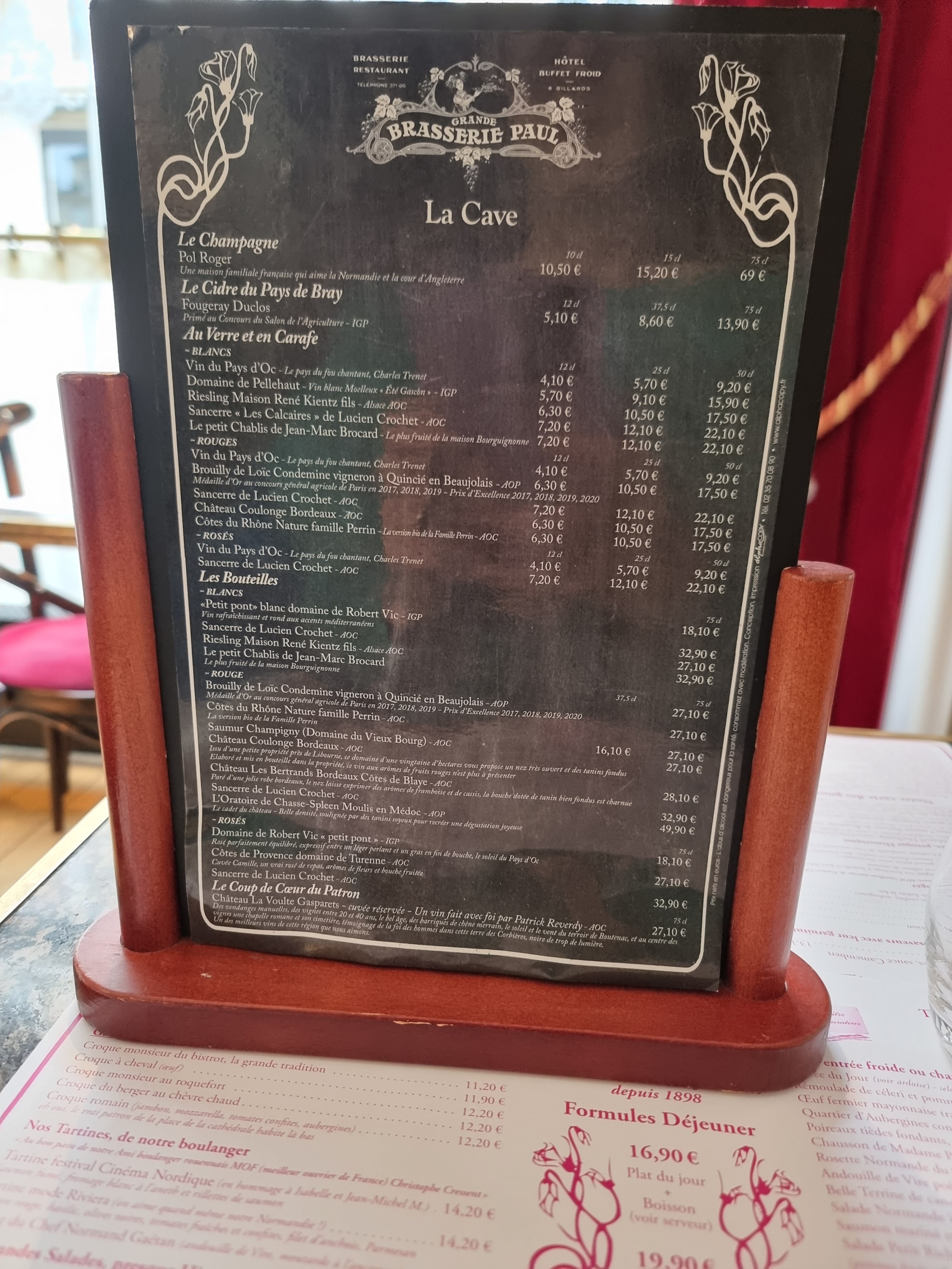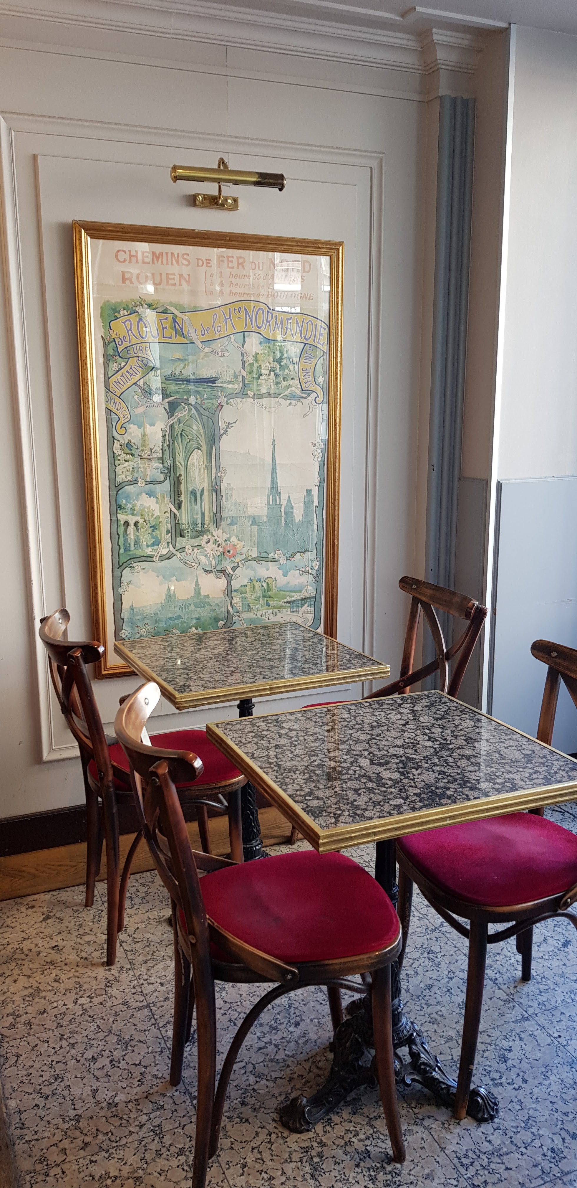 Maison fondée en 1898, cette institution rouenaise a eue comme client: Marcel Duchamp, Simone de Beauvoir, Phillipe Delerm ou encore Guillaume Apollinaire... Cette brasserie au chic très sage est idéalement située près de la cathédrale Notre-Dame de Rouen ou, aux beaux jours, la grande terrasse offre une vue imprenable sur cette dernière. Certains produits sont issus de producteurs locaux, le poulet vient du domaine de Longuehaie Offranville et les escargots de Patrick BLOT, éleveur à Beauvoir-en-Lyons leurs donnent une valeur ajoutée en terme de goût et vous ferons apprécier la cuisine normande. L' accueil est aimable, le service est rapide et efficace, les plats sont copieux et le rapport-qualité-prix est appréciable au vue de la qualité des produits proposés et en n' abusant pas de leur proximité vis à vis de la cathédrale. A découvrir en décalé après 13h, le service est plus détendu sinon, le week-end, pensez à réserver, c' est la rançon du succés! Une rareté en terme de brasserie à Rouen et je le recommande vivement.