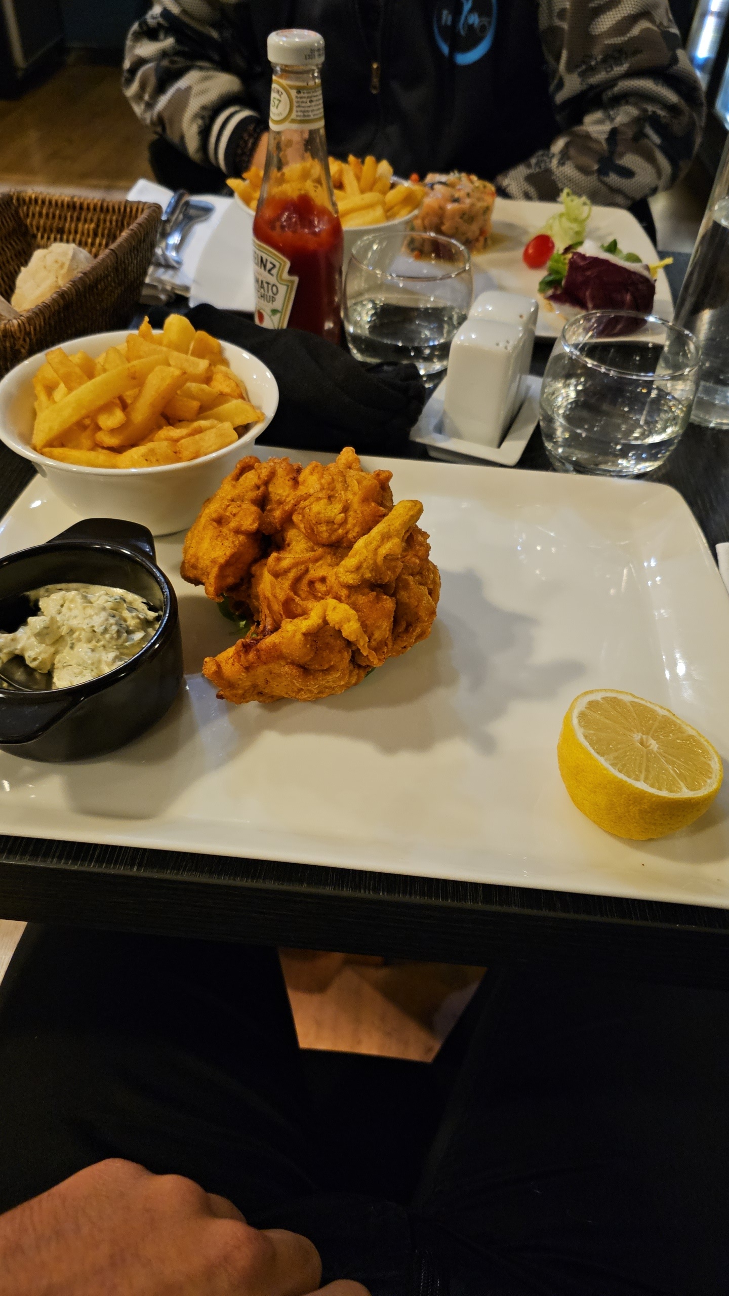 Terrasse agréable personnel sympathique moules au gorgonzola petites mais bonnes fish and chips délicieux sauce tartare très bonne