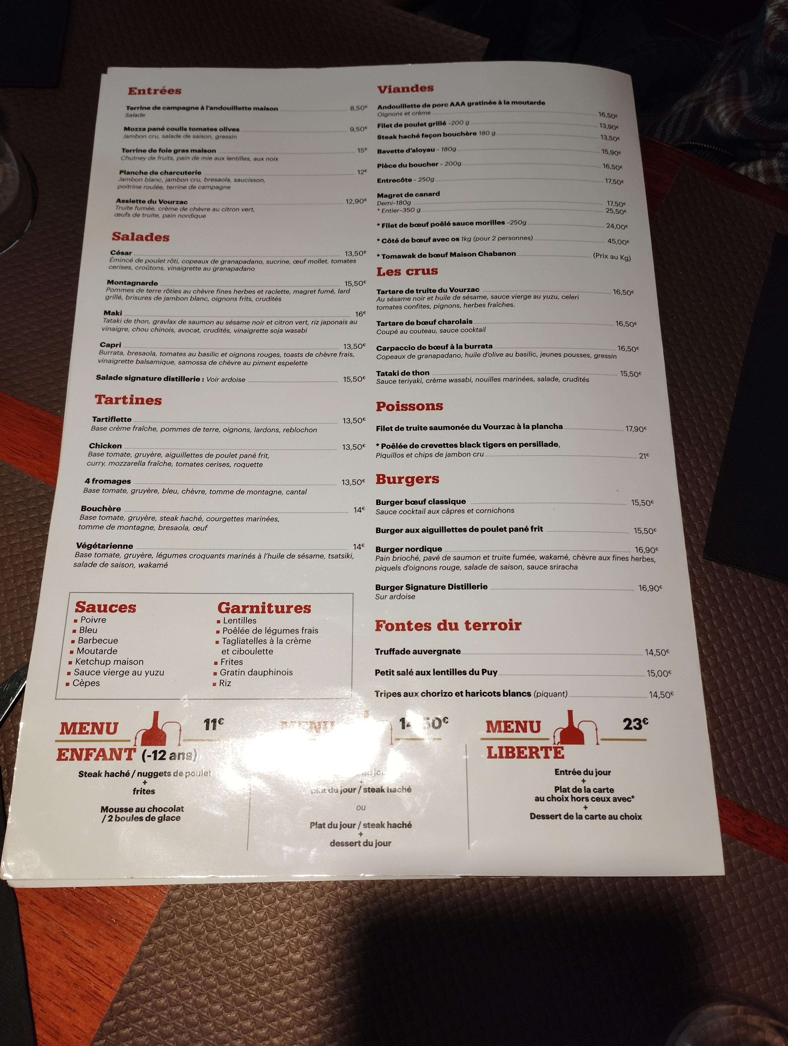 Habitant du Puy depuis peu, j'ai découvert La Distillerie en arrivant et que dire de ce lieu si ce n'est WAOUH, on parle la d'un lieu vivant, parfaitement situé et très agréable quand on découvre la ville. En premier lieu, l'accueil est fort sympathique, avec une réservation en amont c'était comme à la maison, très efficace, un personnel souriant et à l'écoute dès notre arrivée, ce qui change par rapport à certains établissements voisins !! Ce genre de savoir-être procure à cet établissement un avantage concurrentiel. De plus, impossible de faire abstraction du décor, on est emmené dans cet univers de Pub tout à fait chaleureux qui je dois le dire m'a fait pensé à mon séjour en Irlande, un excellent point ! Le plus important, le repas, je recommande pour les plus gourmands la TRUFFADE AUVERGNATE, un plat délicieux et copieux qui mettra tout le monde KO de bonheur culinaire. En accompagnement, j'ai opté pour un petit verre de blanc qui encore une fois m'a agréablement surpris, très doux, rien à dire. Concernant le dessert, leur tarte tatin est parfaite pour couronner ce repas de seigneur, léger et savoureux, MIAM MIAM comme a dit ma femme. Les prix sont très abordables, on se régale pour moins de 20 euros, je recommande fortement LA DISTILLERIE.