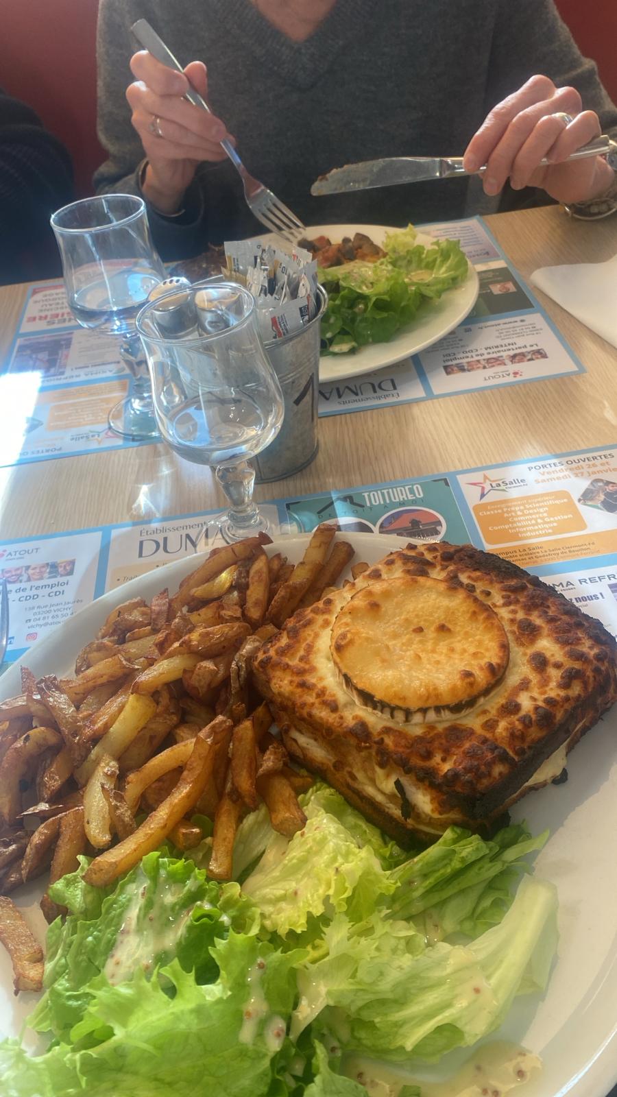 Vraiment déçue, commandée croque Mr qui normalement est accompagnée de frites et salade, problème technique pas de frites et remplacé par rien !! et la salade manquait vraiment d'assaisonnement ,(Par contre, le prix était le même) ... ma fille a pris un tiramisu au café, on l'a tous goûter et personne n'a trouvé le goût du café ! Ni le goût d'un tiramisu d'ailleurs mais plutôt une crème très sucrée avec biscuits à la cuillère non aromatisés ..