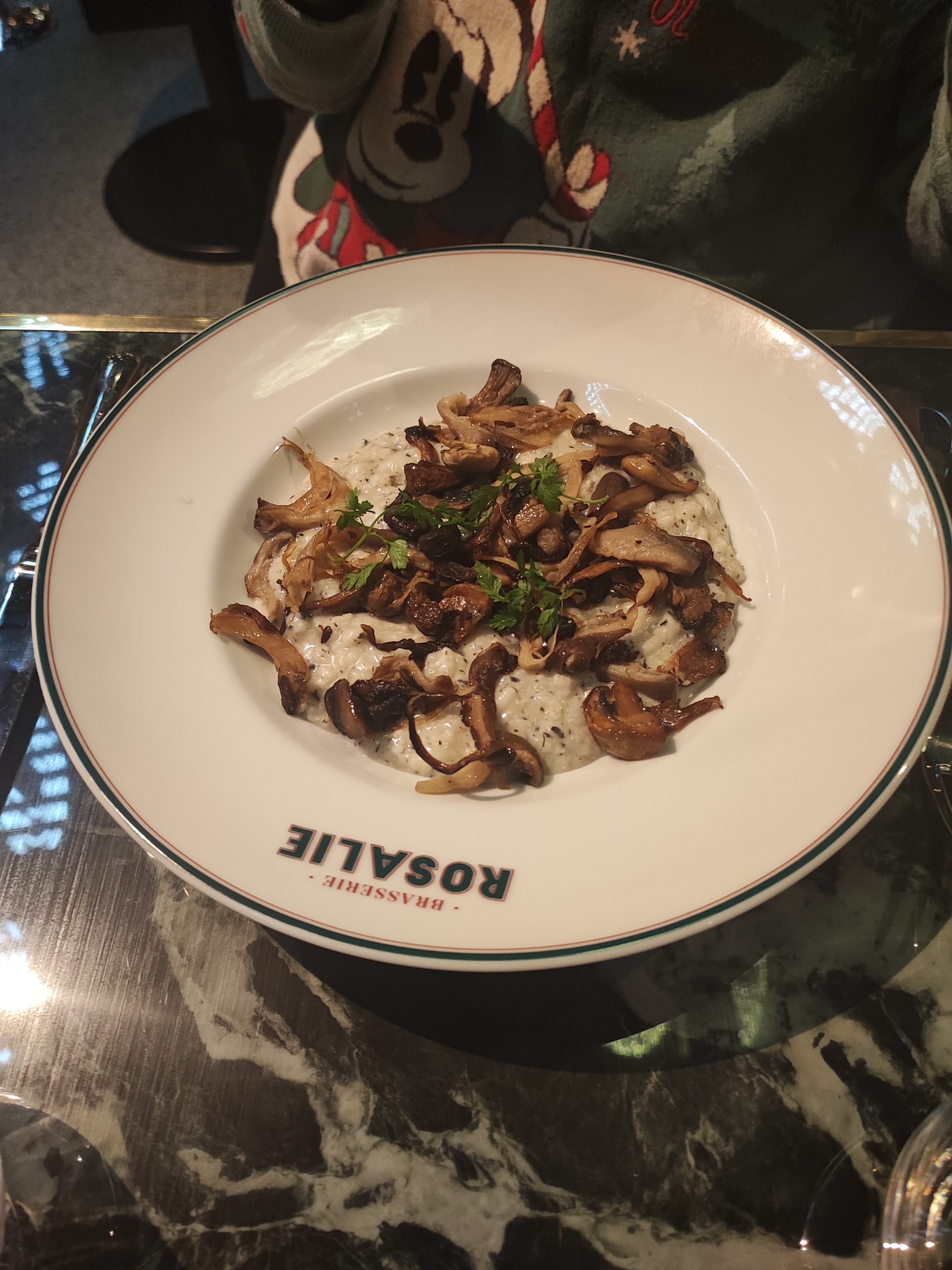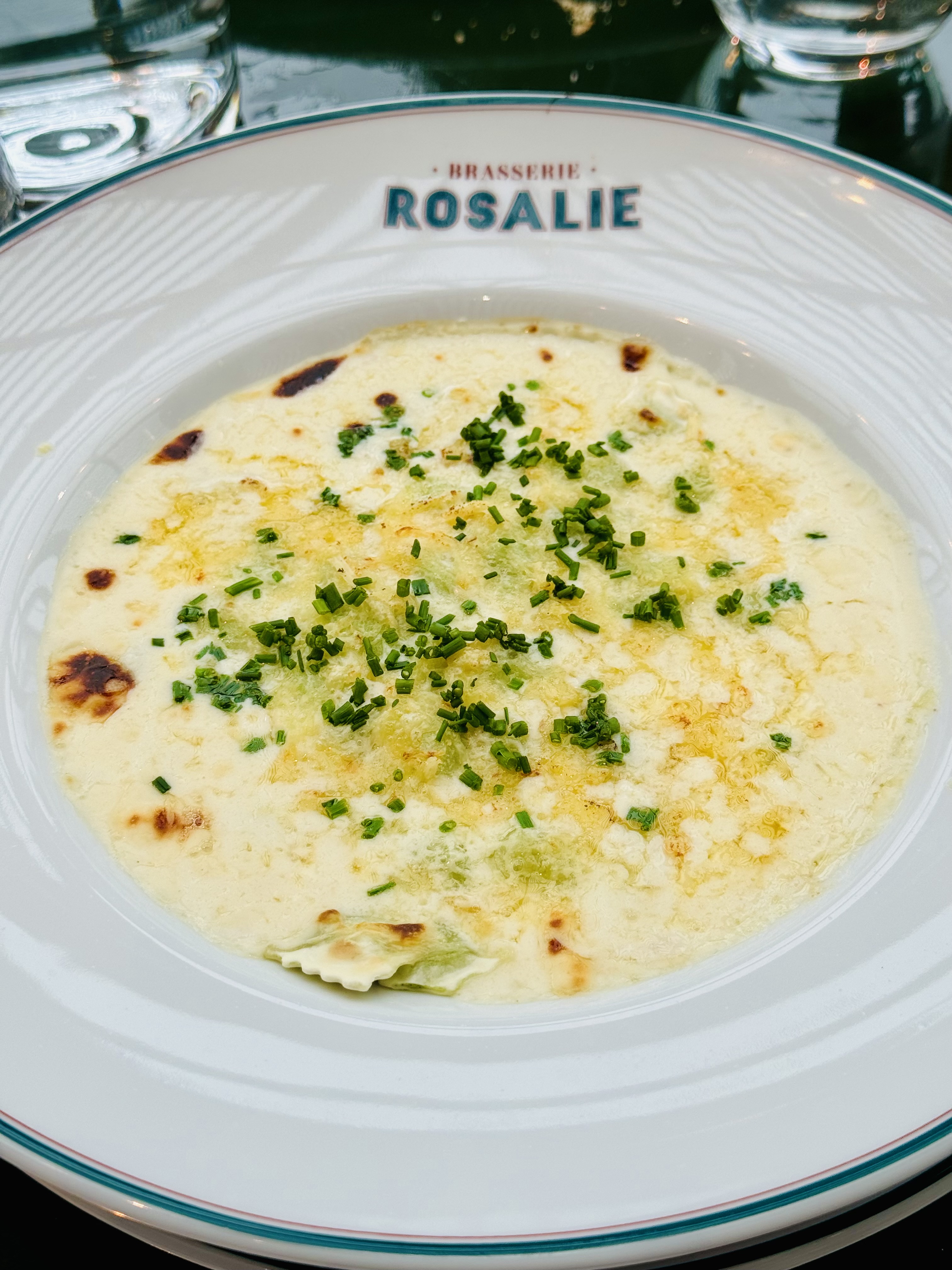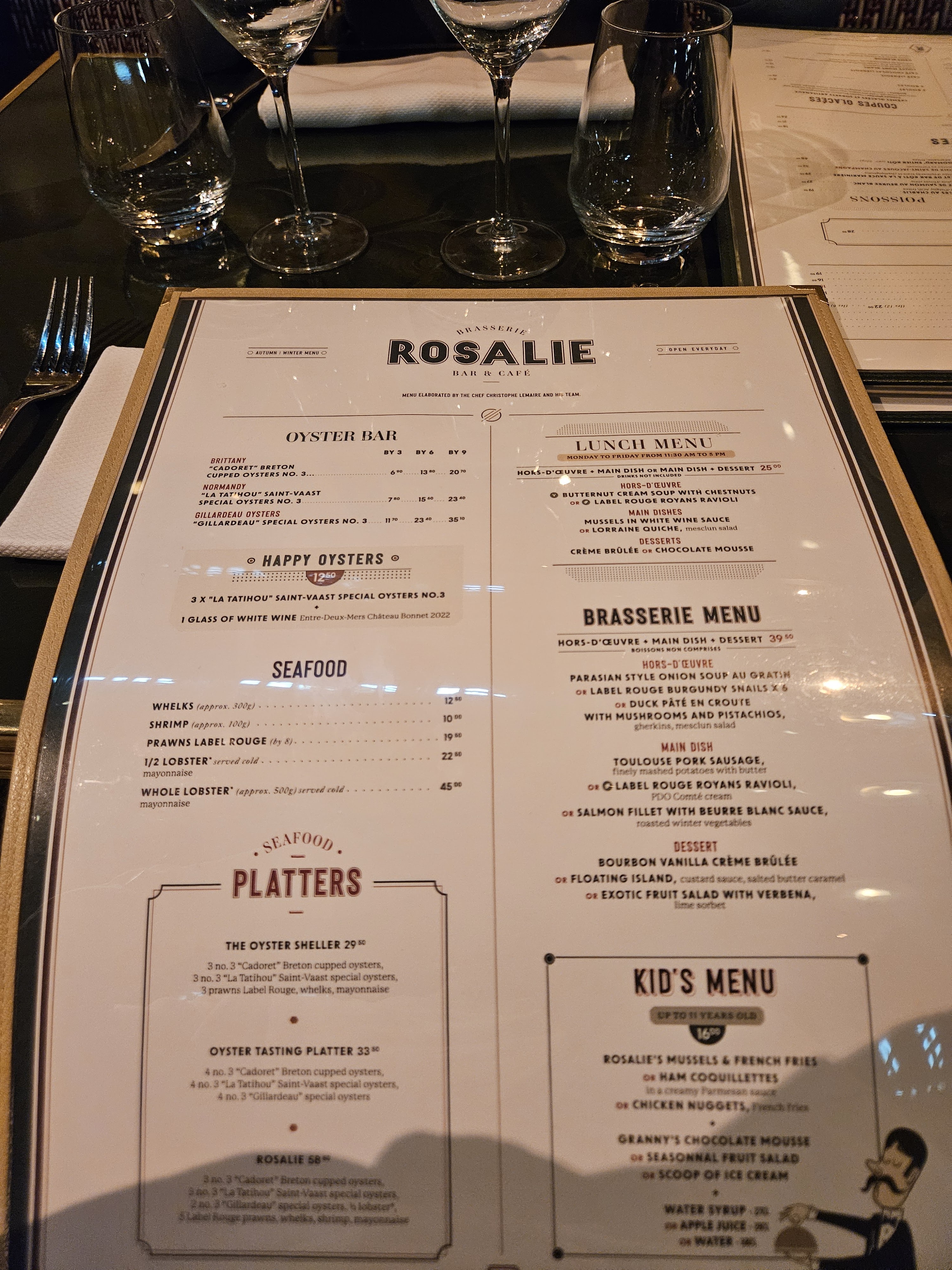 Nous sommes venues déjeuner en famille le lundi 15 janvier 2024. Nous avions réservé préalablement sur Google. La situation géographique de l'établissement est idéal, située en face de la montgolfière dans le Disney village. Le cadre est très joli, brasserie parisienne, typiquement chic. Nous avons été accueillis par le directeur de salle, je pense qui nous a proposer de choisir l'emplacement de notre table. Nous avons été servis par une charmante jeune femme, qui semblait prendre ses marques, mais qui était vraiment très agréable et souriante. La carte est vraiment parfaite, le choix est varié, poisson, menu enfant, viande, dessert, carte des vins. Mention spéciale pour les ravioles qui étaient divines, cependant, j'ai trouvé les moules sans plus. Le rapport qualité prix est très correct, surtout au vu de l'emplacement. Les restaurants du parc Disney sont relativement chers, donc la brasserie Rosalie est un excellent deal (service à table) personnel aux petits soins. Nous avons déjà prévu de revenir vous voir l'année prochaine pour notre séjour annuel dans le parc. Merci brasserie Rosalie, pour ce moment passé chez vous.