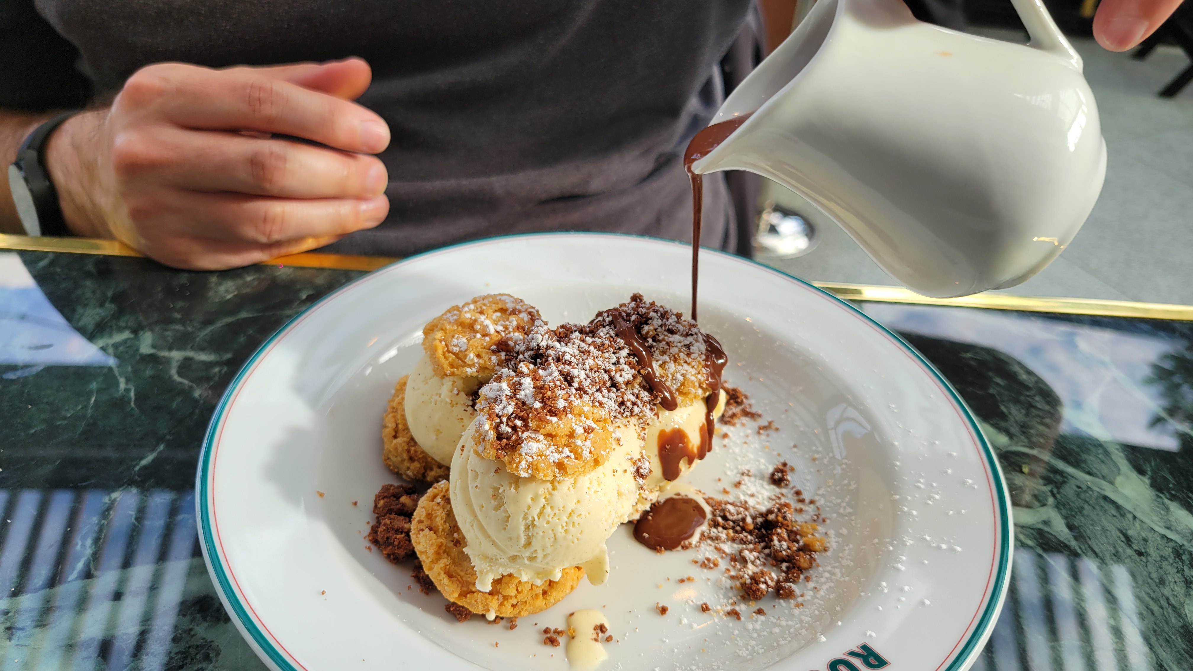 Nous avons dîné à la Brasserie Rosalie deux fois la semaine dernière. J'aurai un article complet sur mon propre site Internet, mais Disneyland Paris devrait suivre l'exemple de la Brasserie Rosalie en matière de cuisine excellente à un bon rapport qualité-prix. Toute la nourriture que nous avions était très bonne, y compris du homard, du bœuf braisé et du poulet. Et commandez définitivement les profiteroles, celles-ci semblaient être l'article le plus populaire ! Nous avons également commandé un sandwich, du vin chaud, du chocolat chaud et un gâteau aux carottes depuis la fenêtre et tout cela était également bon. Le chocolat chaud chez Rosalie vient d'Angelina (c'est la même entreprise qui gère les emplacements).