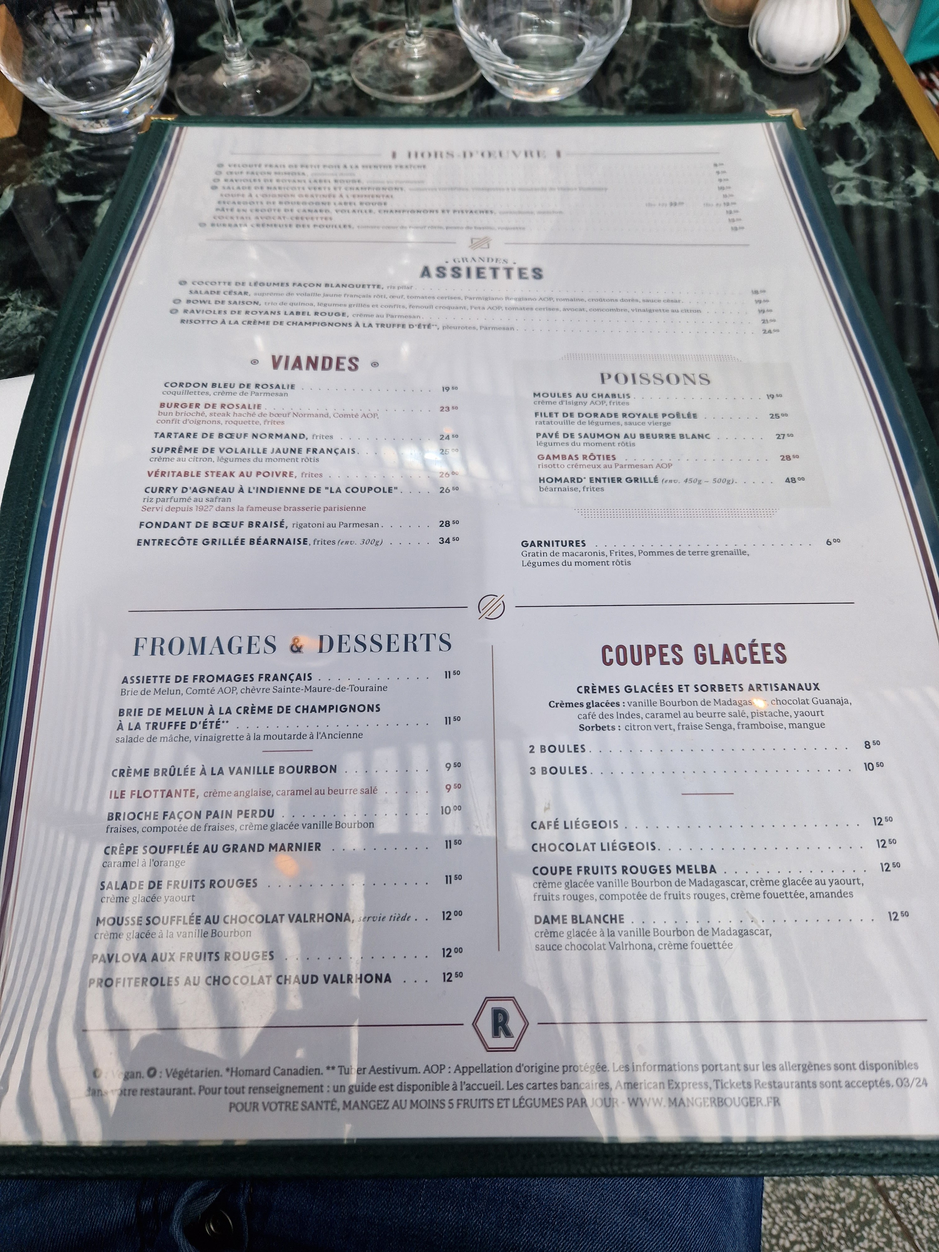 La carte donne envie mais nous avons été déçu par les plats les 2 fois où nous sommes venu. Les serveurs n ont pas le temps d être présent à leurs tables dû au monde donc pas d interaction. C est une brasserie Parisienne quoi ... Petit + pour le menu enfant qui arrive dans les 5 min qui suivent la prise de commande !