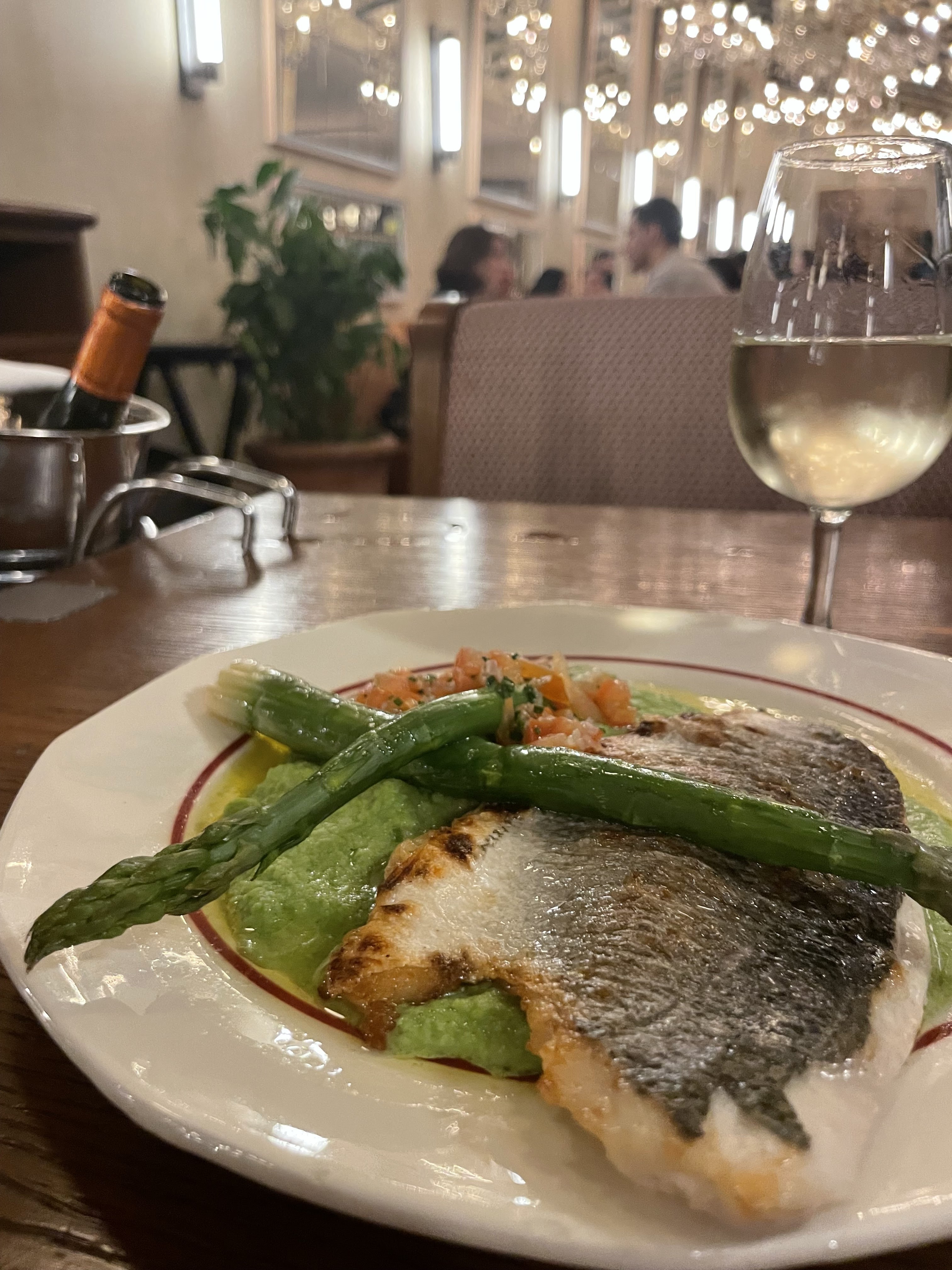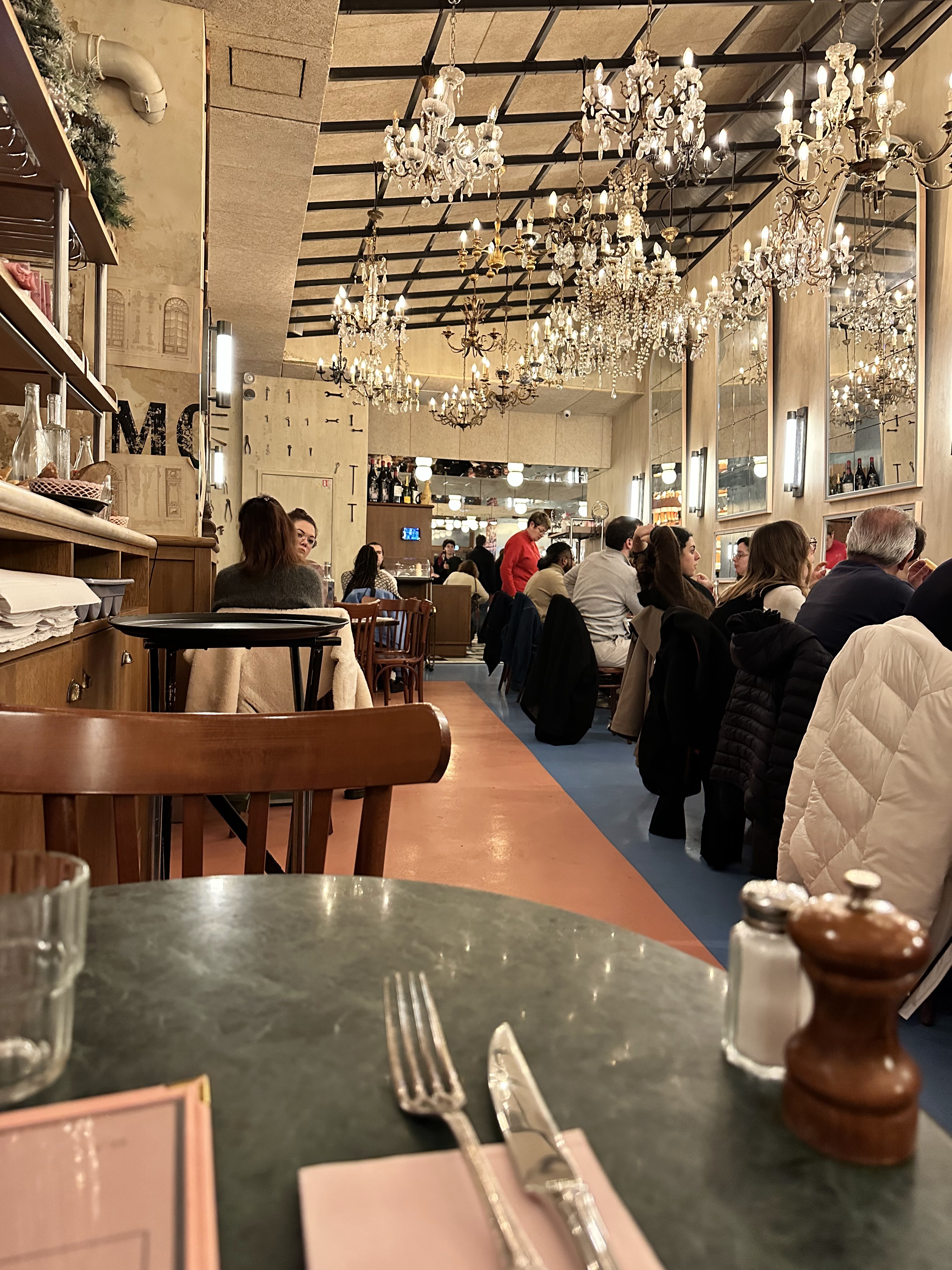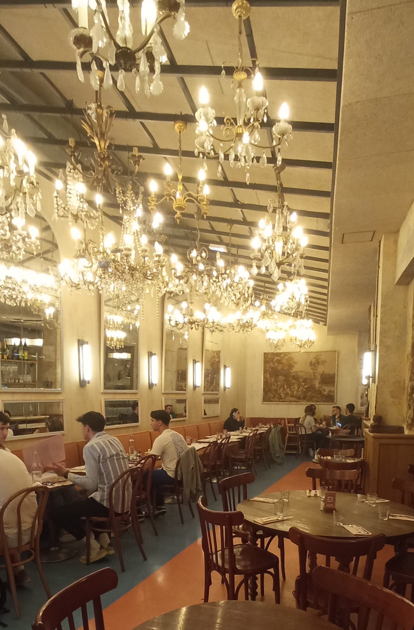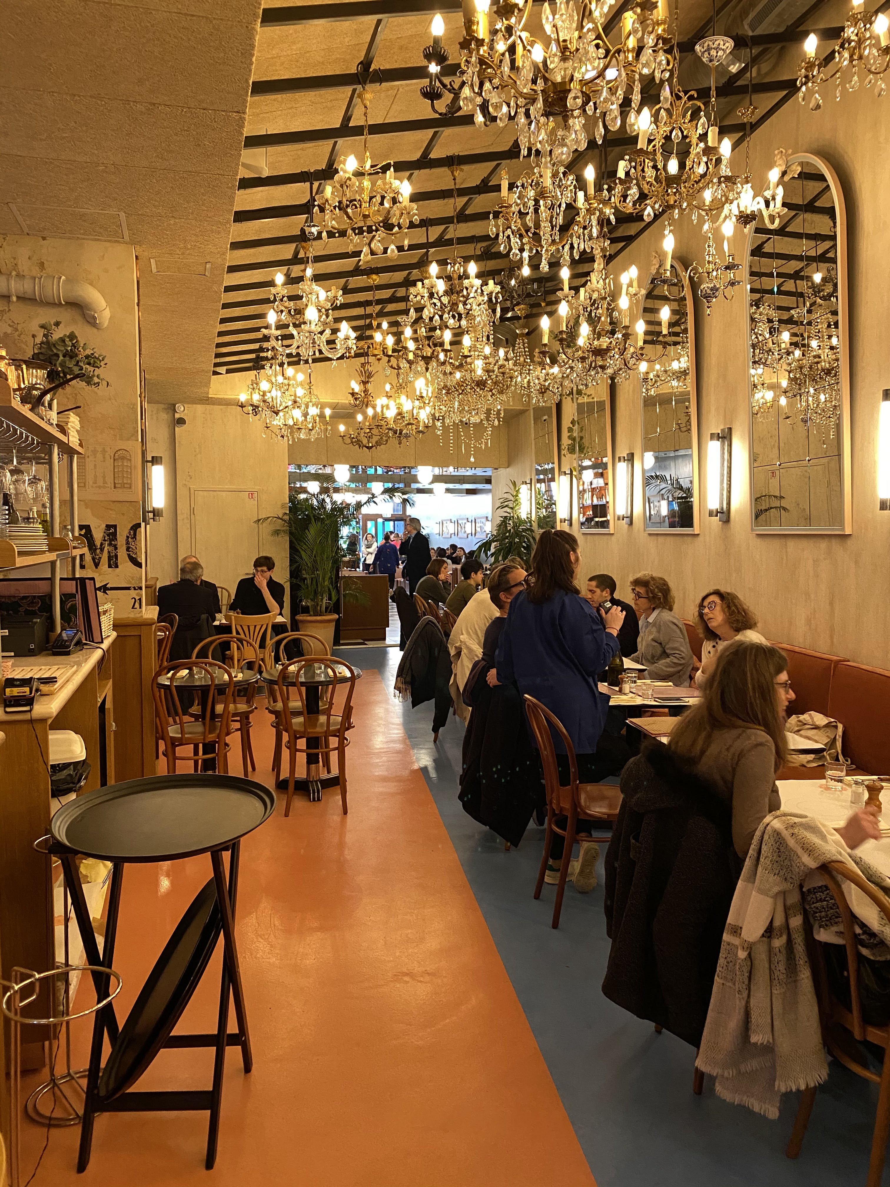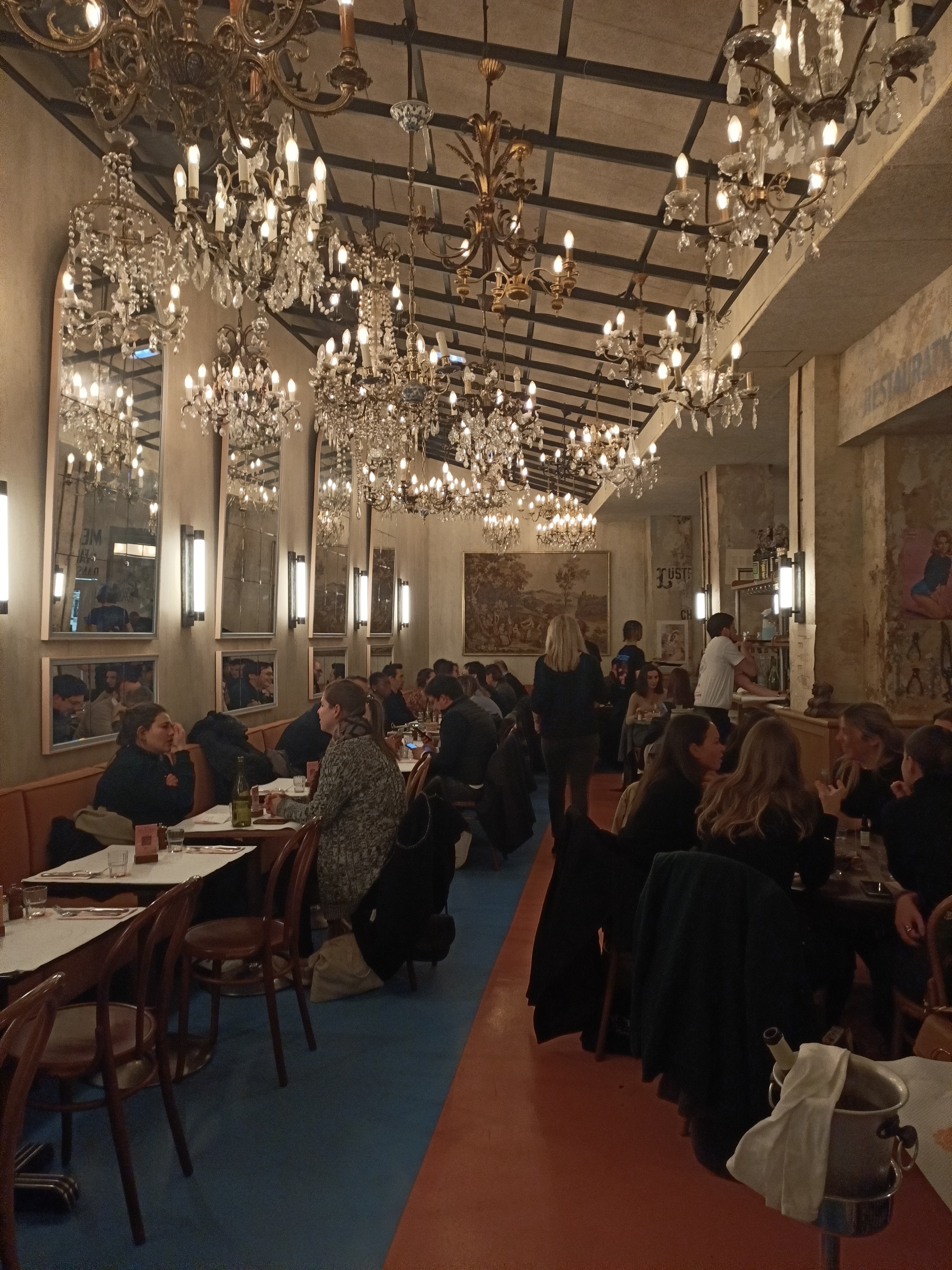 Lieu très sympa et convivial. La déco de la salle du fond est particulièrement jolie avec l’enfilade de lustres. Personnel très agréable et serviable. Côté nourriture les pâtes à la truffes sont bonnes et équilibrées, la purée saucisse aussi apparemment… en revanche dommage le plat de poisson du jour que j’ai pris: daurade royale, purée de petit pois et asperges croquantes était un peu décevant. Ce n’était pas « pas bon » mais juste sans grand intérêt. Le vin blanc était bon.