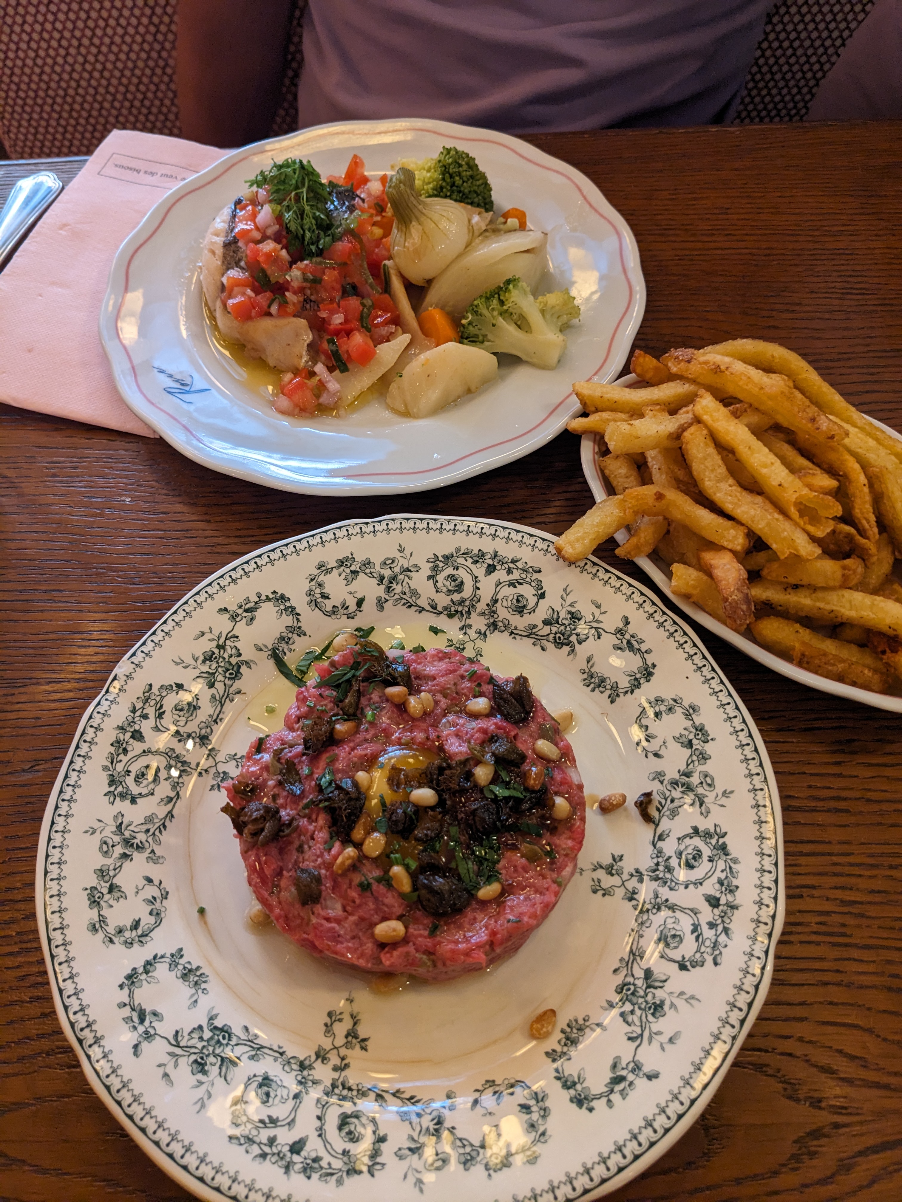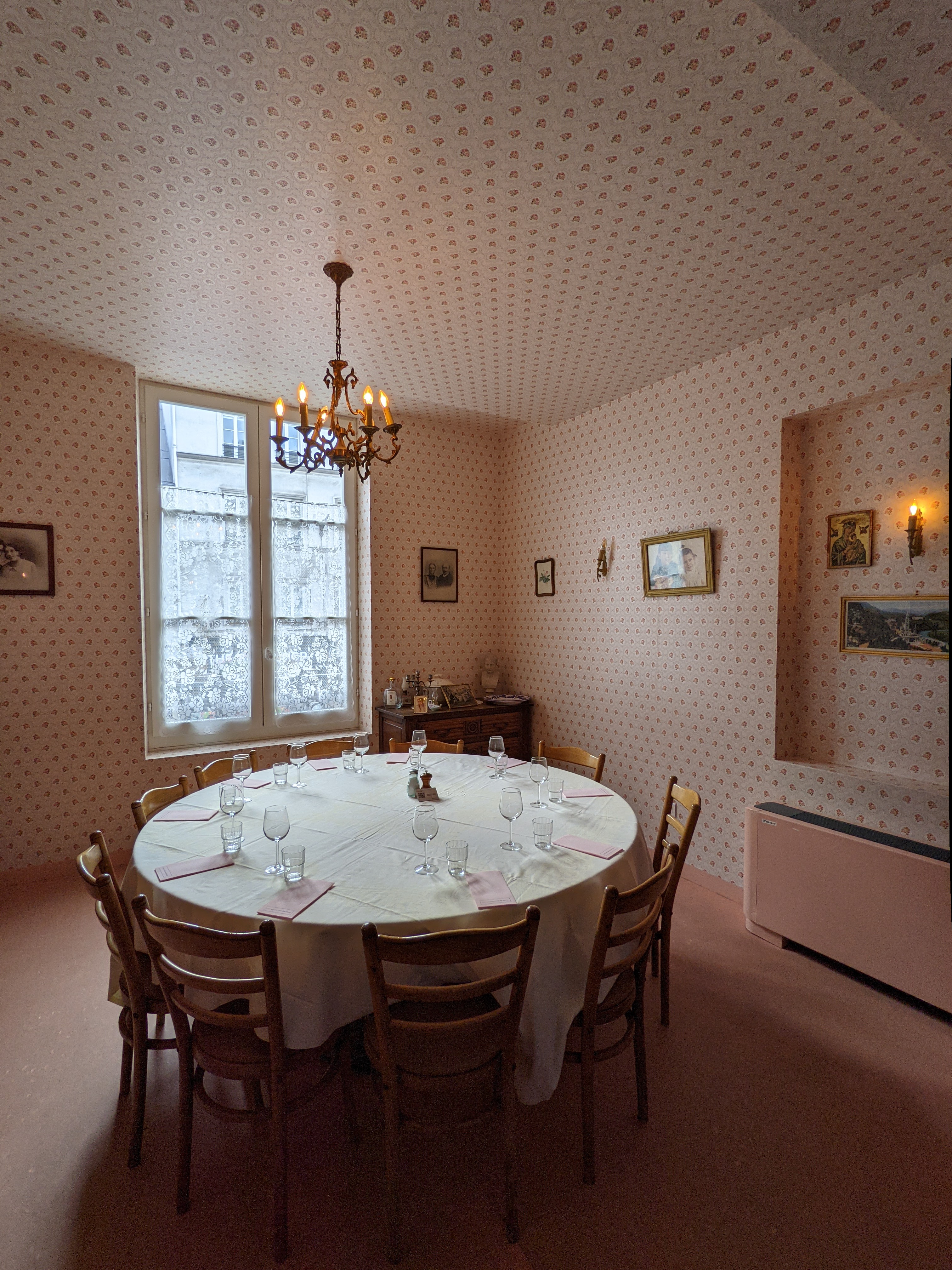 Nous avons bien mangé malgré que nos plats soient arrivés froid mais ceci a été vite rectifié grace au personnel professionnel et réactif. Les plats étaient bien cuisinés, les desserts très bien également mais tout de même un peu déçu qu'il n'y avait pas de choix pour le menu enfant. Cadre atypique qui nous renvoit a l'époque de nos grands mère . Nous avons passé un agréable moment et recommandons ce restaurant.