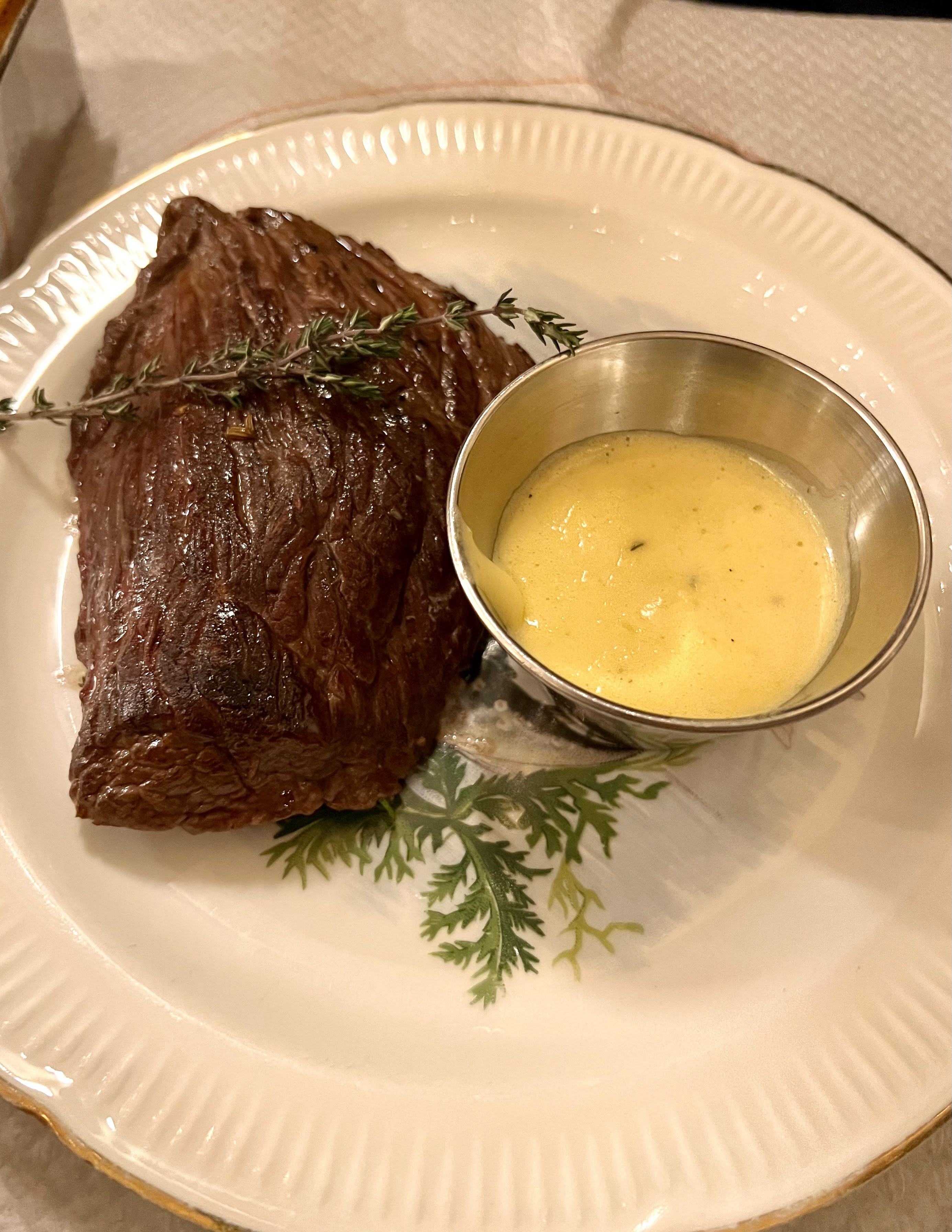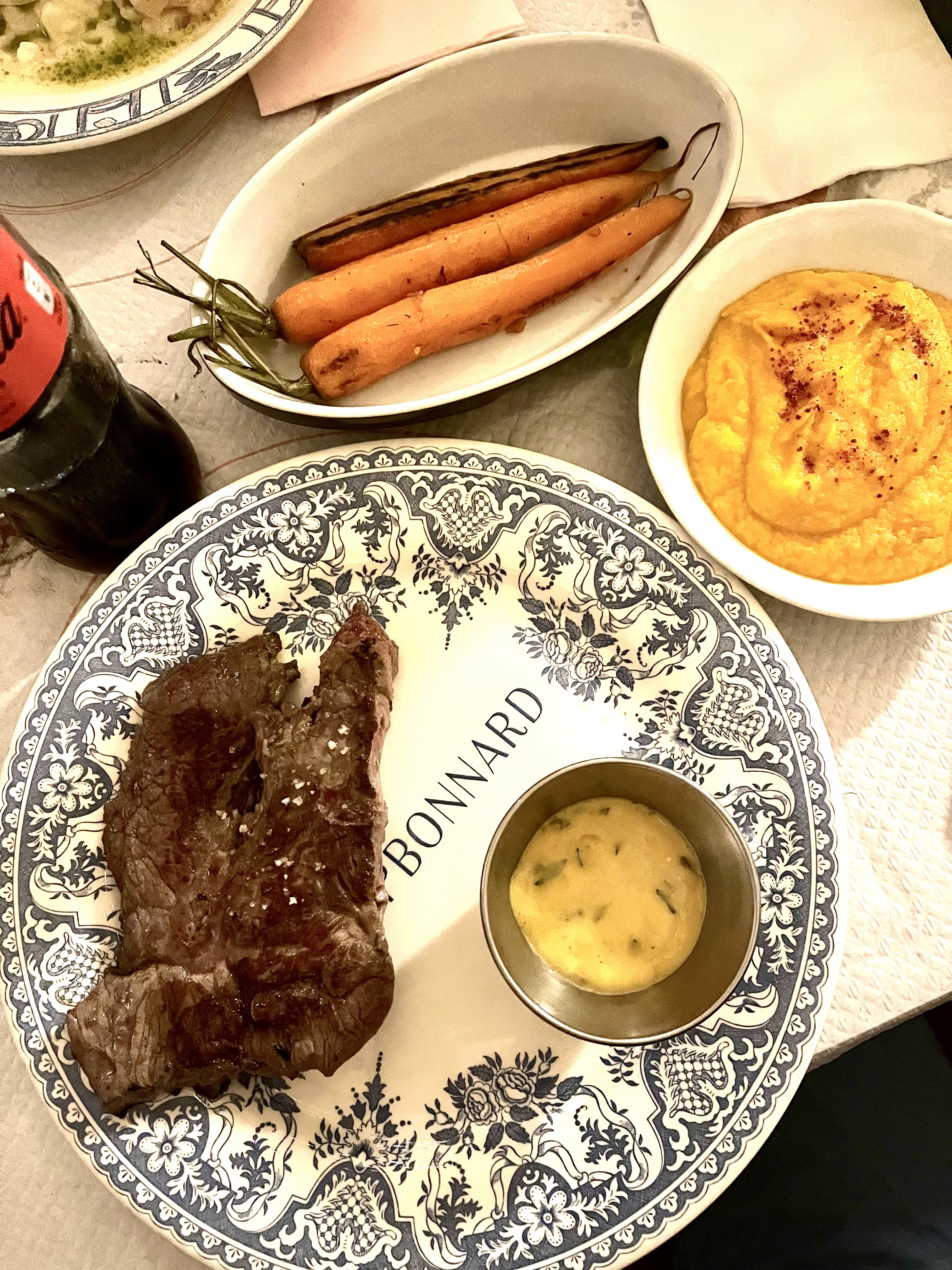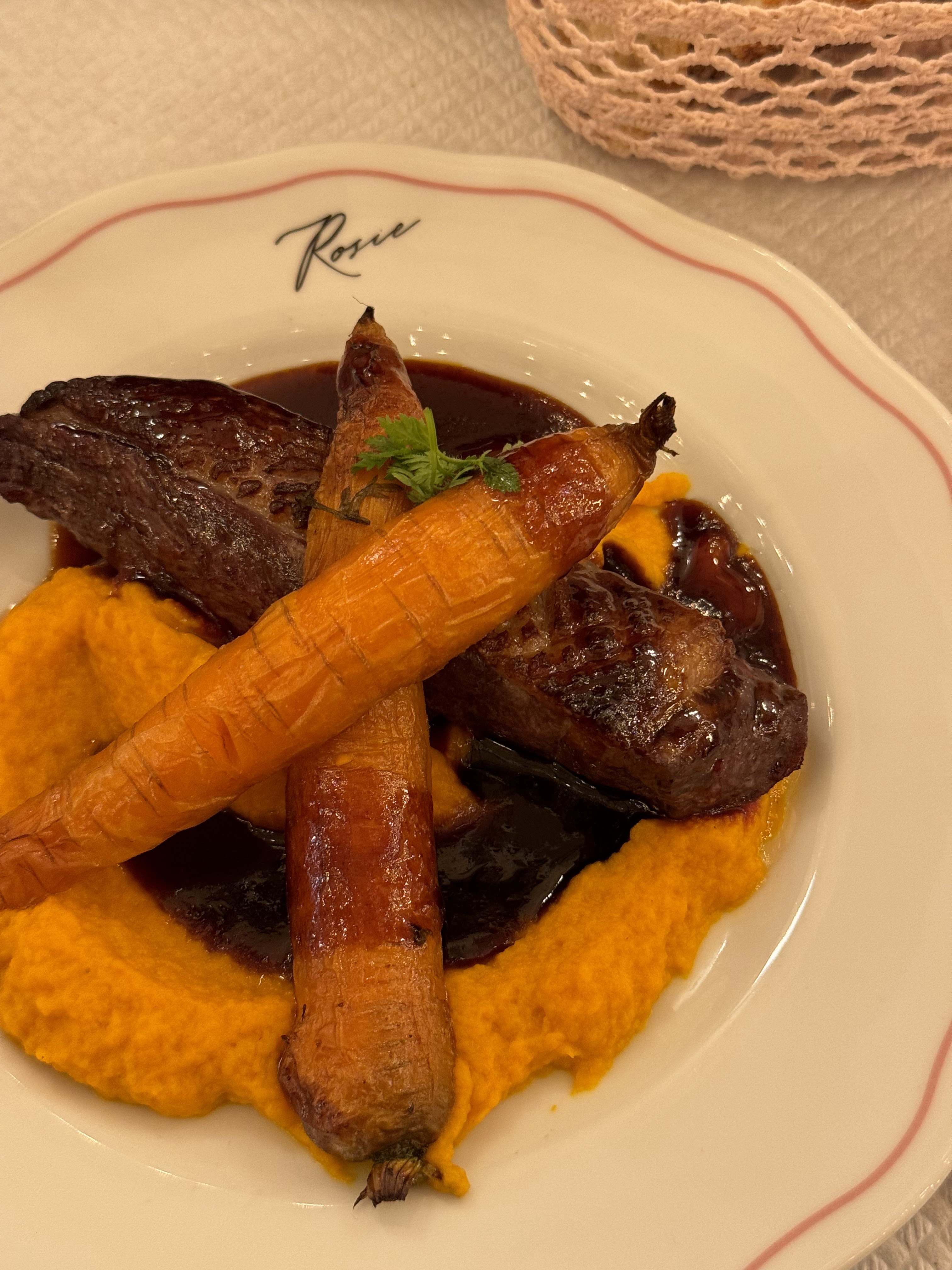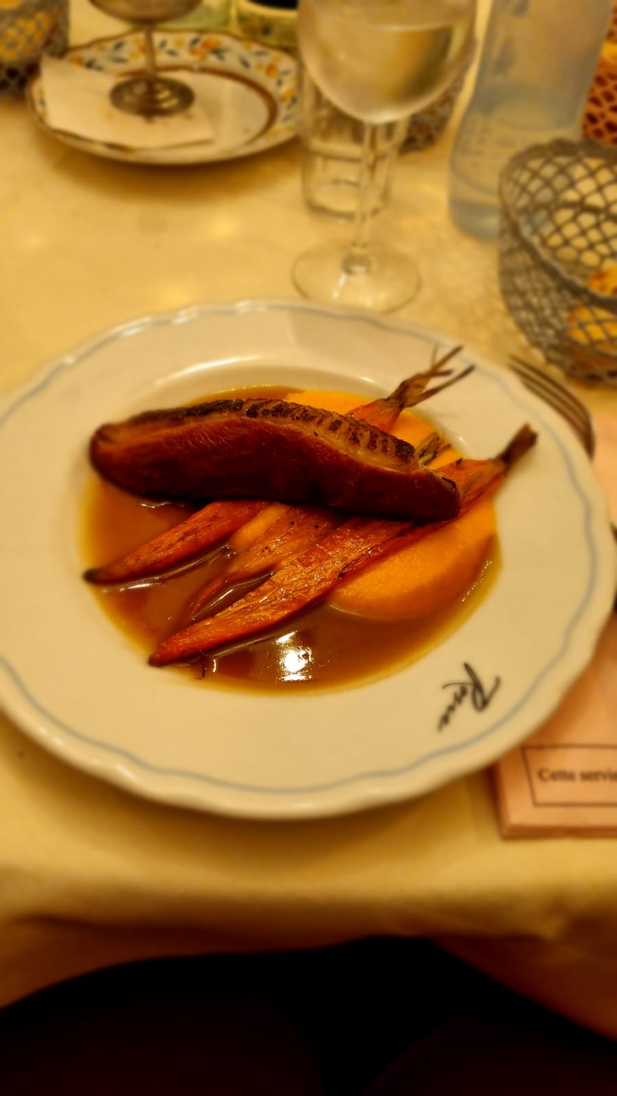 Un magret de canard exquis, accompagné d’une douce purée de carottes légèrement sucrée. Je recommande totalement.