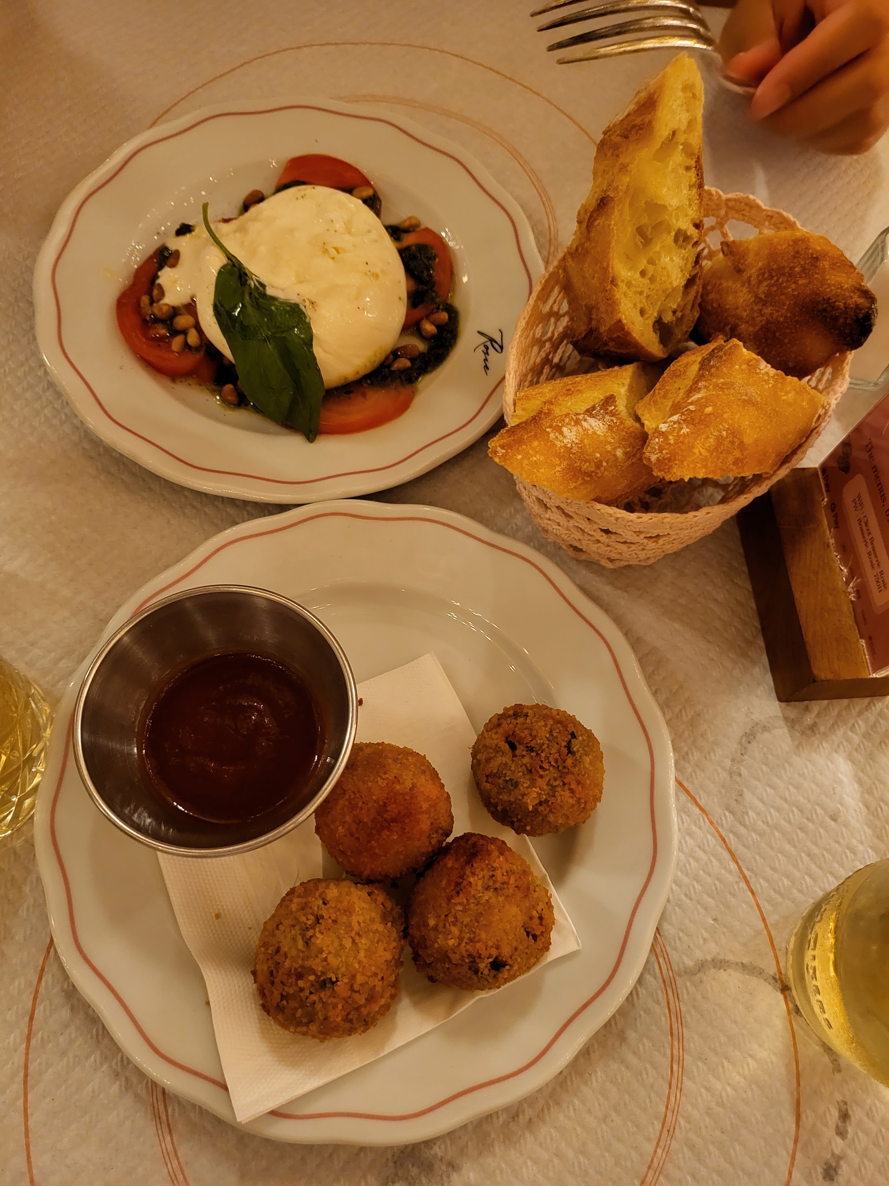 C'est un endroit agréable et confortable. Nous avons été accueillis et assis. Nous avons eu notre apéritif composé de camembert frit et de cromesquis d'épaule de cochon (porc effiloché frit), qui était super. quand nous avons fini, ils nous ont ramené le même plat car ils avaient un dysfonctionnement dans le système mais cela ne nous a pas dérangés. Quand nous avons eu notre plat principal, tout était légèrement chaud. les frites étaient musclées et le poulet n'était pas salé. quand nous avons voulu payer, le serveur n'avait pas de monnaie pour nous et a donc oublié de nous rendre 10 €. J'ai vérifié et les critiques négatives sur cet endroit disent que la nourriture était froide. Je ne recommande pas cet endroit si vous voulez essayer de la cuisine italienne typique.