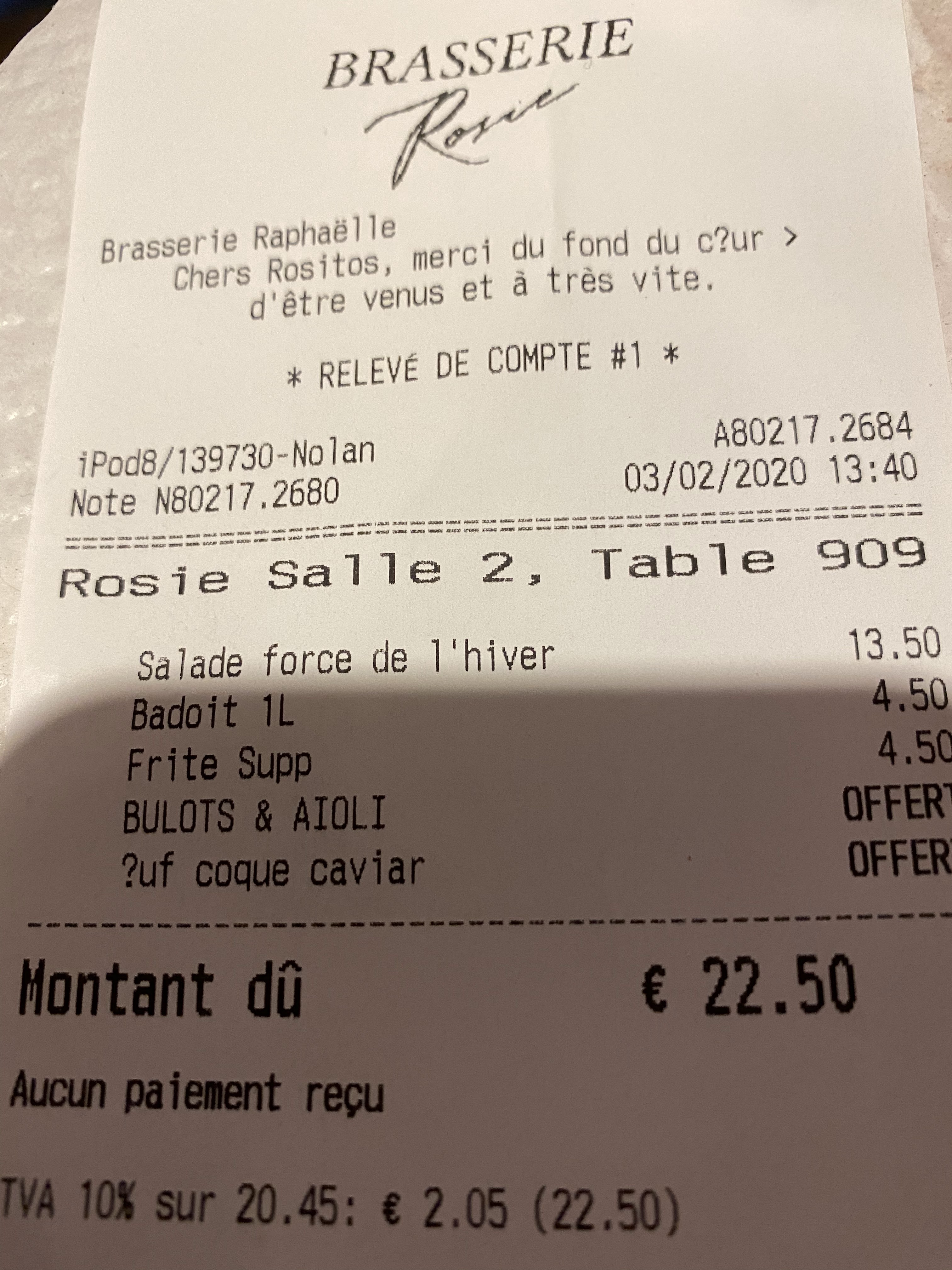 Cette brasserie était dans ma liste de restos à faire depuis bien trop longtemps pour ne pas l’avoir testée plus tôt, et nous reviendrons rapidement avec plaisir ! Aucune déception, que ce soit sur les entrées, plats, desserts ou sur les cocktails, tout était excellent. Les coquillettes à la truffe valent leur réputation notamment, et le moelleux abricot recommandé par le serveur très bon aussi :) Merci encore au serveur qui était adorable et a rendu ce premier repas à la Brasserie Rosie d’autant plus chouette ! Je recommande donc, bien entendu
