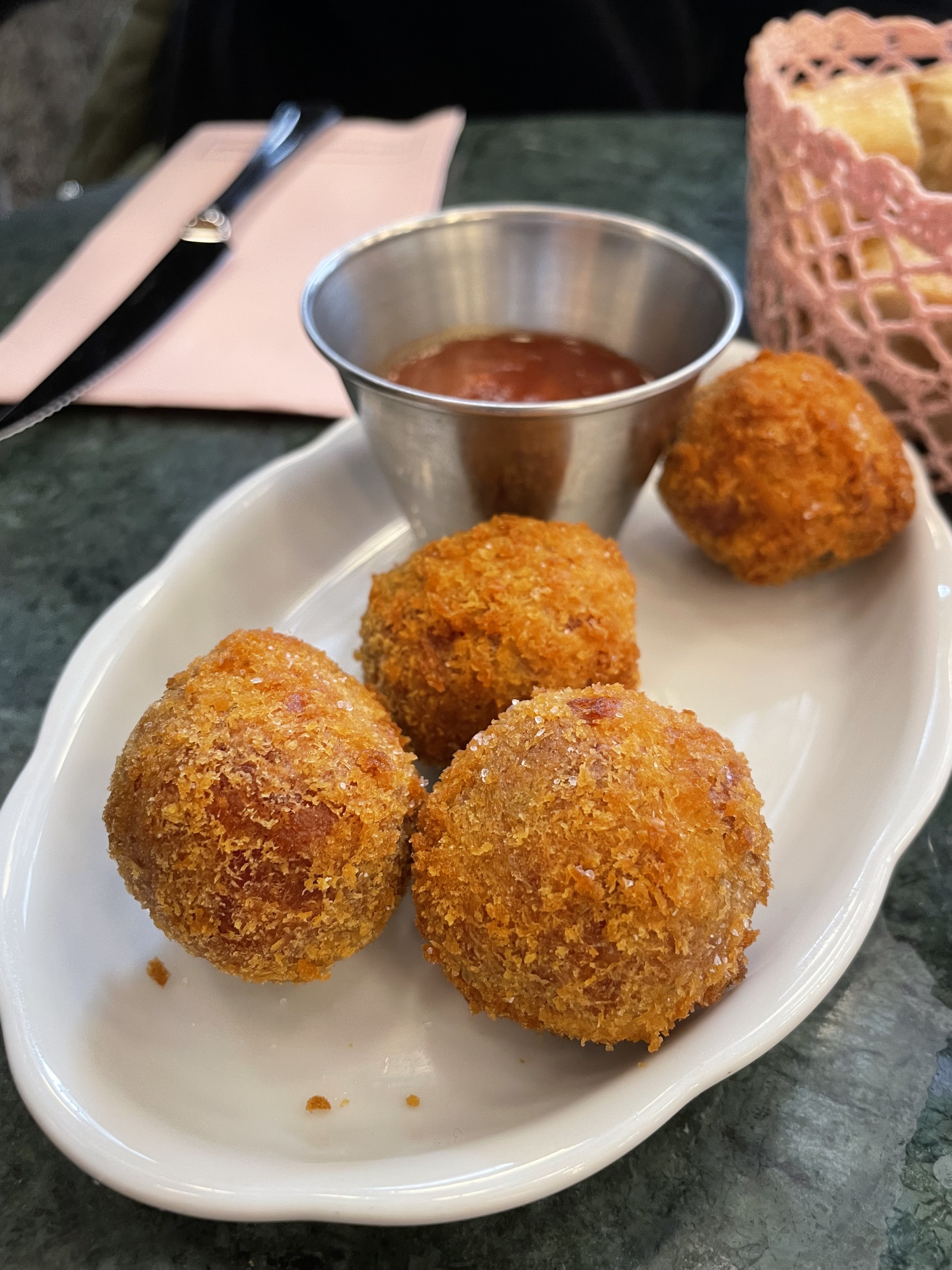 Brasserie contemporaine servant une cuisine française classique. Dans l'ensemble, la nourriture était très bien exécutée. Le Cromesquis d'épaule de cochon était croustillant et très juteux - m'a surpris. Les tomates et la burratina étaient également très bonnes. Rien de spécial, mais ce sont des saveurs classiques qui fonctionnent. Les moules étaient parfaitement cuites, mais les frites étaient malheureusement légèrement détrempées à mon goût. Le pain était également légèrement sec. Heureusement, l'Épaule d'agneau du Limousin était absolument spectaculaire. Agneau braisé d'agneau super tendre, avec une croûte croustillante, et les pommes de terre et la sauce en faisaient un plat si luxueux. Le service était généralement solide. Notre serveur nous a tout expliqué et était sympathique. Il avait l'air légèrement pressé, ce qui a fait tomber quelques couverts sur le sol. L'intérieur était magnifique. Tout simplement magnifique, et la vaisselle correspondait également à l'environnement. Si vous voulez une cuisine de brasserie française classique mais avec un intérieur moderne, Rosie est l'endroit idéal.