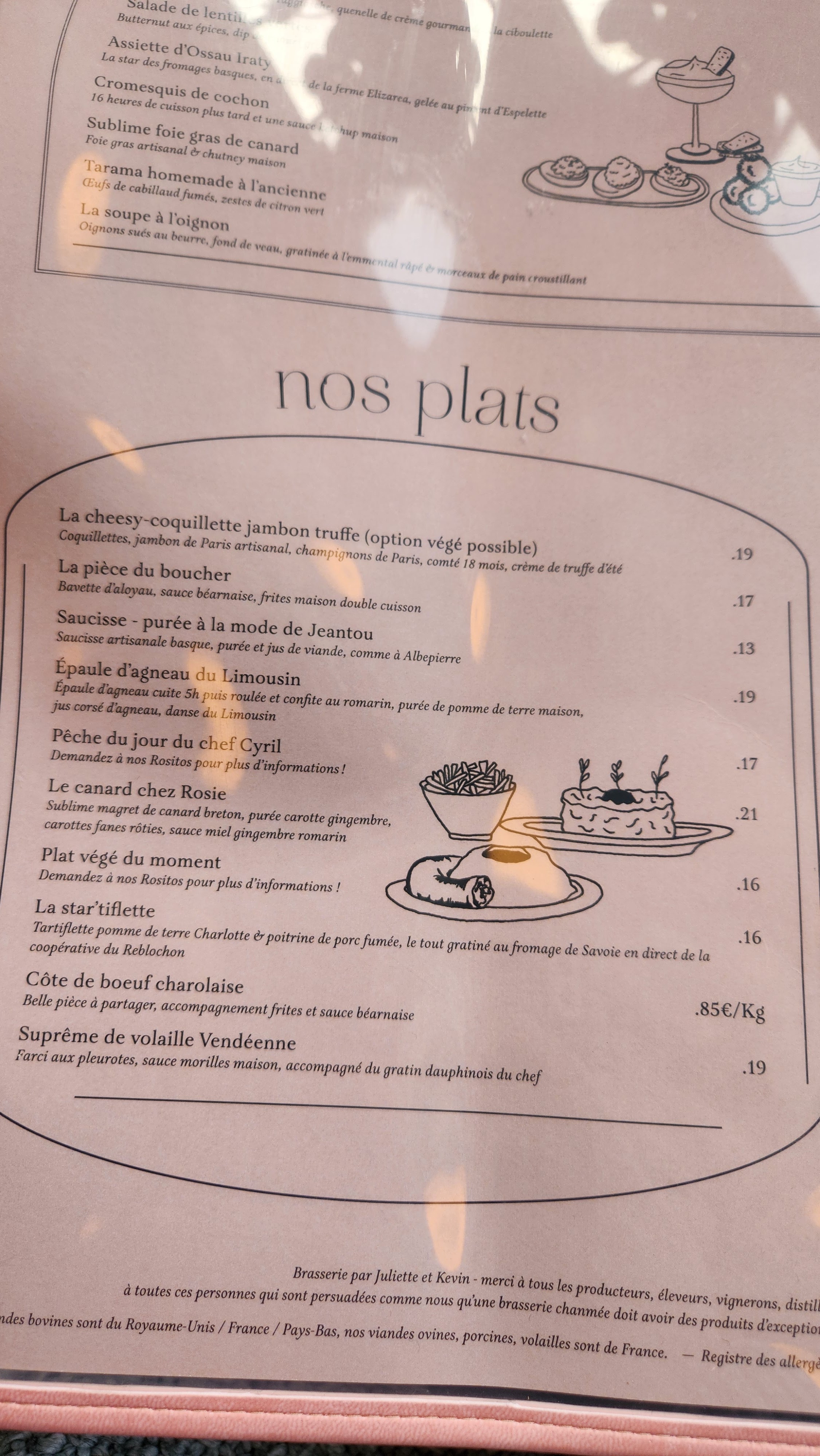 Beau choix de plats à la carte, portions généreuses et plats savoureux. J'ai pour ma part choisi les coquillettes à la truffes, je vous recommande donc tout particulièrement ce plat☺️. La salle est typique des bistrots parisiens. Le service est rapide, le personnel est souriant et très attentionné. Mention spéciale pour Joséphine qui s'est occupée de nous à merveille 🤝🏻 Je reviendrai très certainement pour me laisser tenter par la pièce de boeuf ou la saucisse/purée. (Pensez à réserver à l'avance, car les places sont chères et les clients viennent en nombre pour tester cette brasserie.)