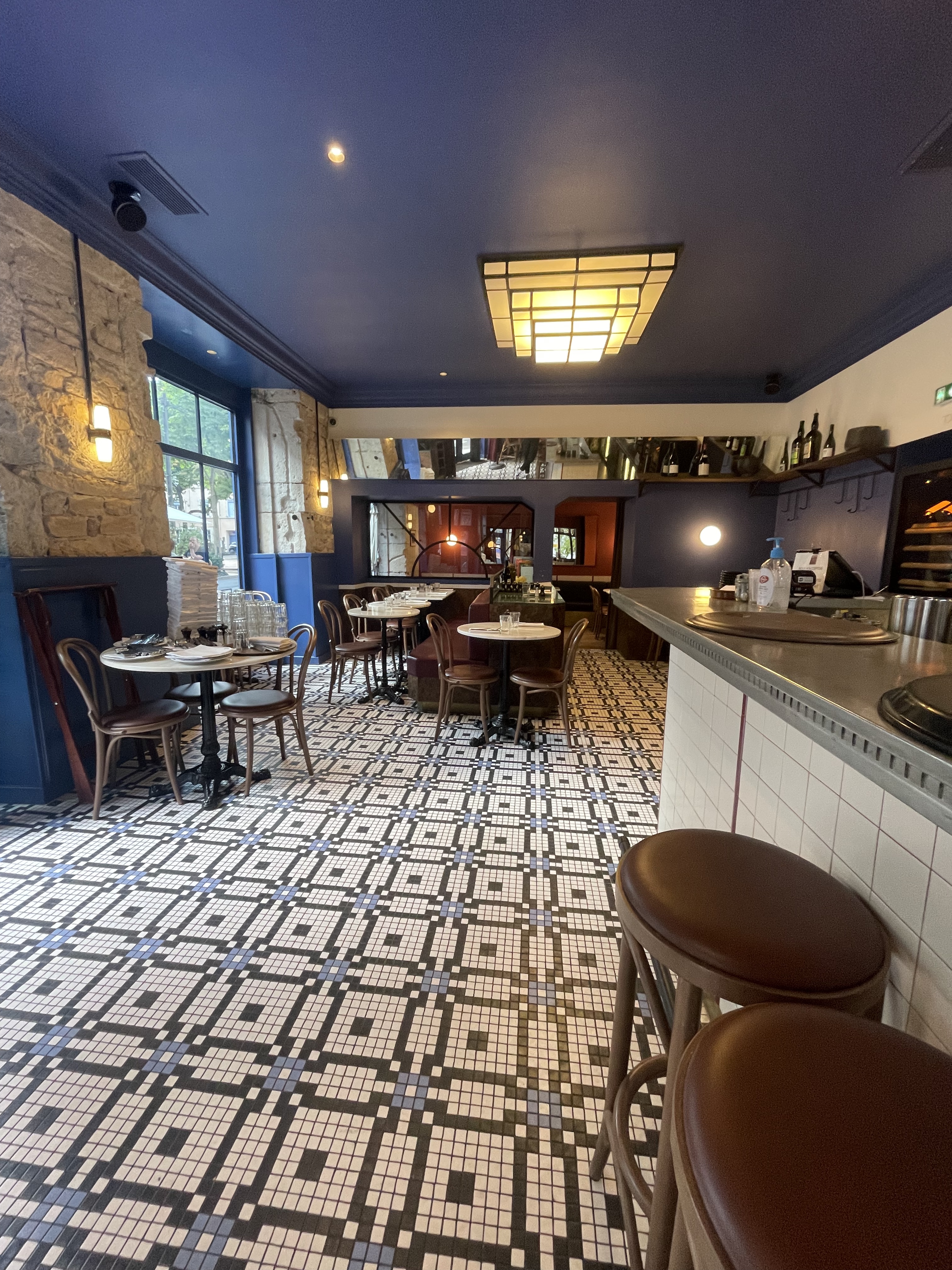 Situé sur une place calme de Lyon. Accueil souriant, prise en charge rapide et attentionné pendant le repas. Carte originale et variée, produits terre et mer, fromages 🧀. Vin au verre possible. Le pain poilane se marie tres bien avec les assaisonnement des plats, qui sont vraiment un point fort des plats que j'ai choisi. Bonne préparation. Je me suis régalé. Point d'amélioration possible, la carte manque de cocktail, peut-être un dessert fruité type soupe de fraise, olive confite, pignon de pain et basilic. Le carpaccio pourrait être un peu plus fin, mais les tranches sont généreuses. Je recommande !