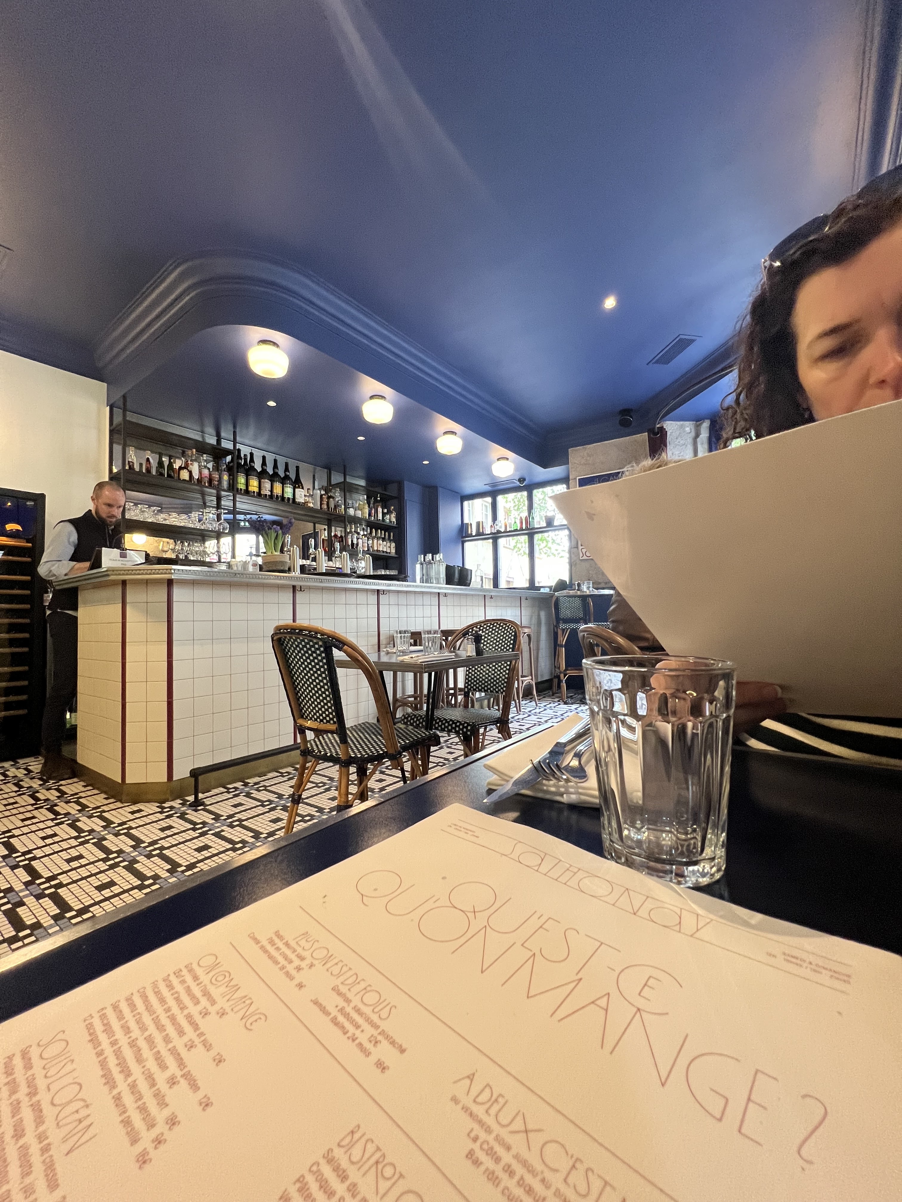 Une brasserie à la déco tradi, une belle devanture bleue (le bleu Majorelle ?) et une grande terrasse. Accueil et service sympathiques. Plats de brasserie et portions à partager. Plats très goûtus notamment le poulpe grillé et les calamars persillade. Un poil cher pour nous mais à tester !