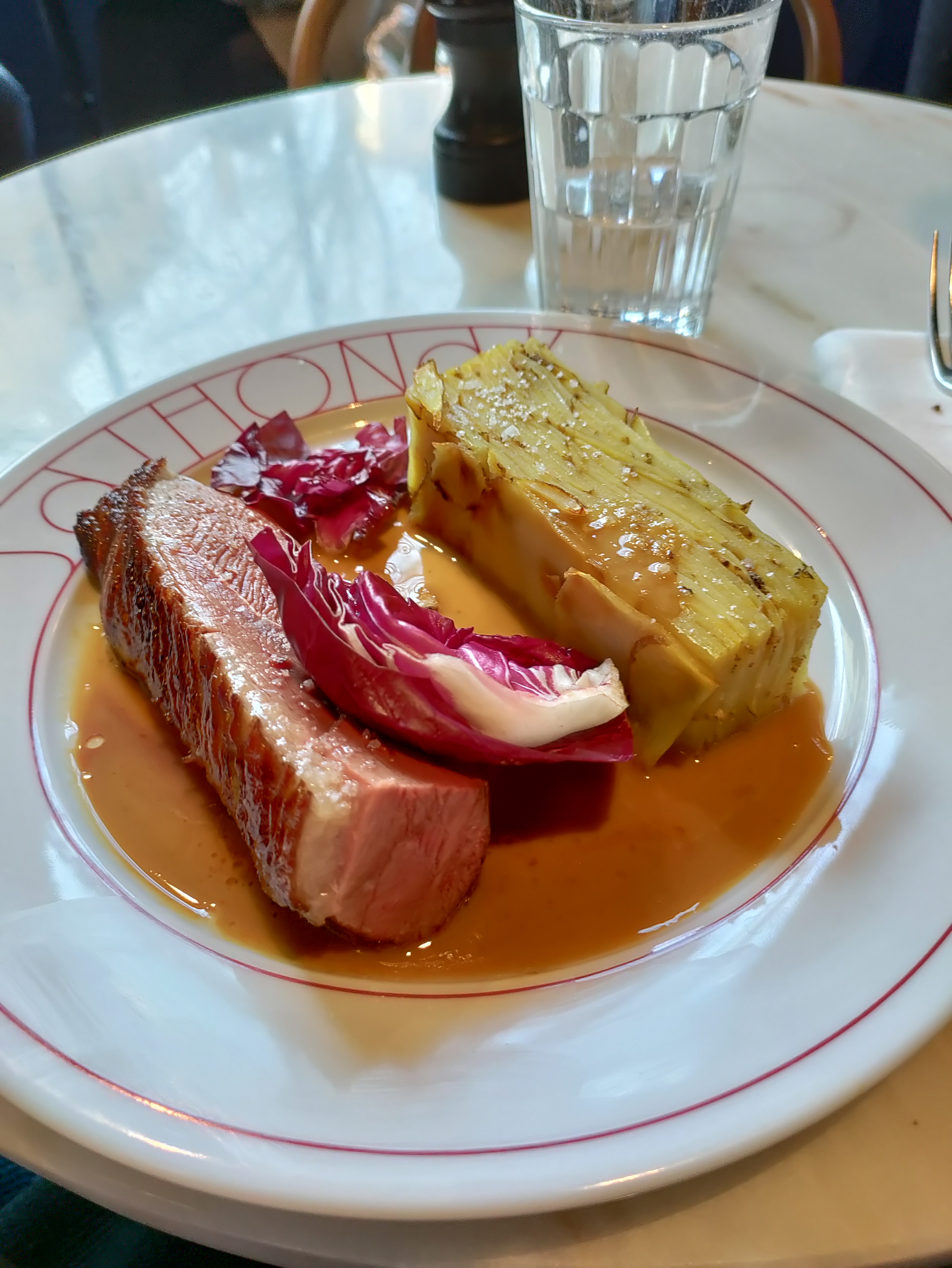 Repas de midi à la brasserie sathonay. Plat : magret (enfin plutôt un demi magret alors que sur d'autres photos des avis on voit un magret entier...pour le même prix que le demi j'imagine....donc ce n'est pas très honnête..), pomme de terre Anna(non épluchées les pommes de terre...)...et les légumes ben je les cherche encore....il y avait noté trevise alors je m'attendais a un peu plus que 2 pauvres feuilles. Dessert ok Pour le prix je trouve cela léger/juste (24€ le plat et 8€ le dessert) Concernant l'ambiance c'était sympa mais nous avons passé notre repas frigorifié...et manger en ayant froid est fort désagréable....manteau sur les jambes, écharpe autour du coup, bonnet sur la tête....le gros bémol c'était ça et l'impression aujourd'hui de m'être fait voler sur le magret
