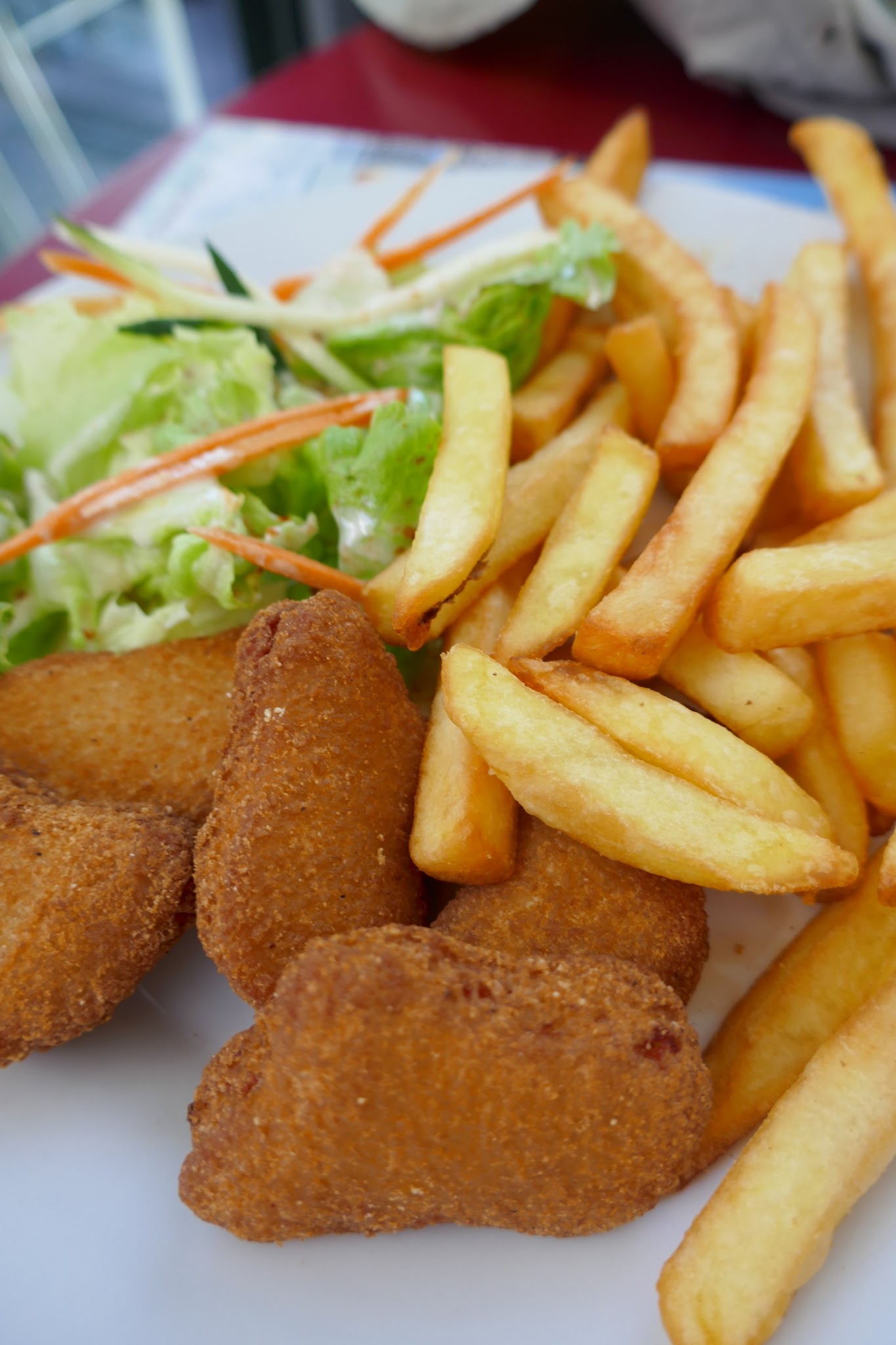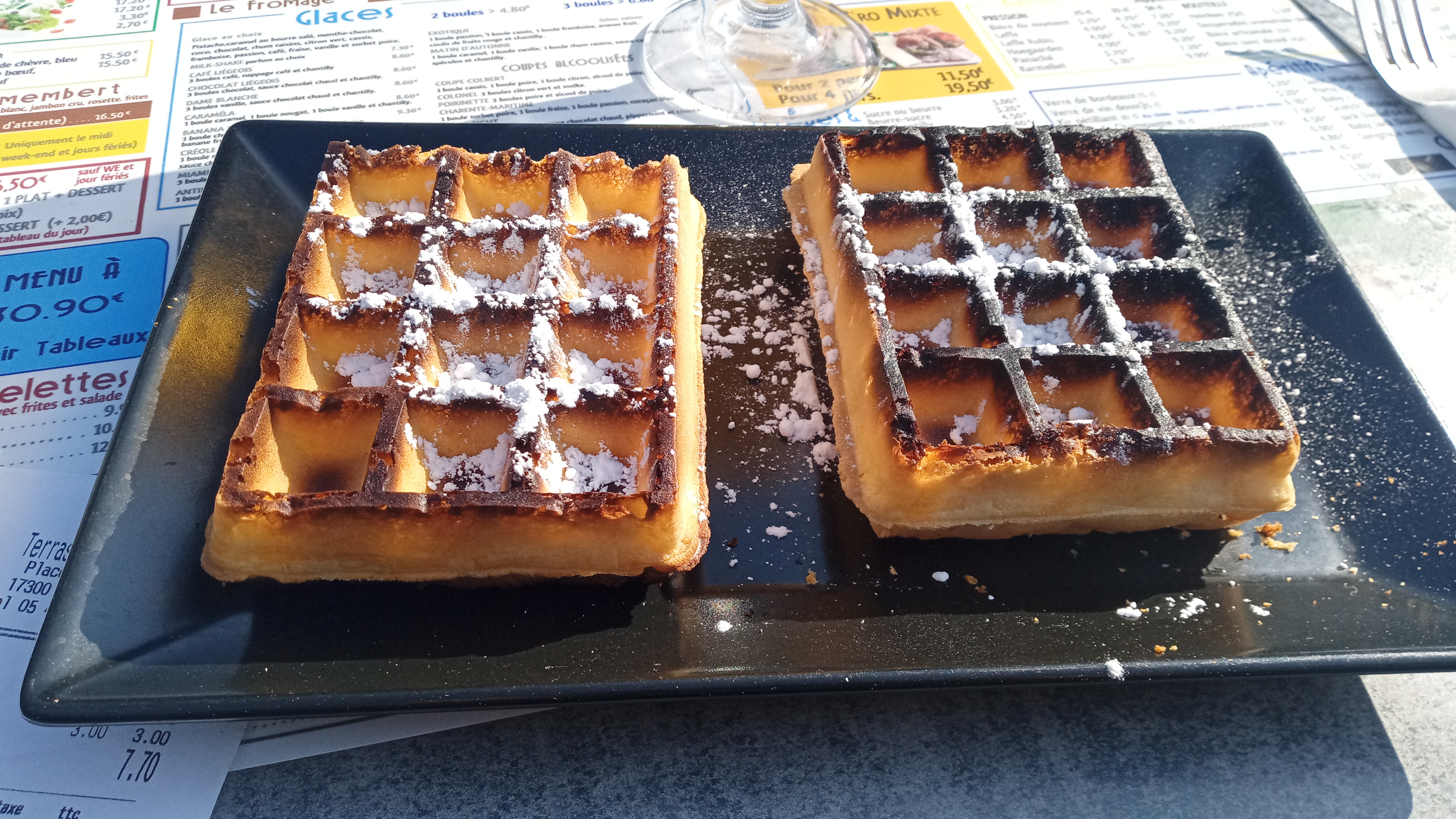 On s'est attablés en terrasse pour profiter des premiers soleils de mars... bouffe immonde ! pire que dans une station service d'autoroute. J'ai pris des moules-frites, les moules étaient complètement desséchées, probablement cuites 4 ou 5 h. avant et réchauffées depuis, les frites molles et grasses, le tout servi tiède. Bref, l'attrape-touriste dans ce qu'il y a de pire.