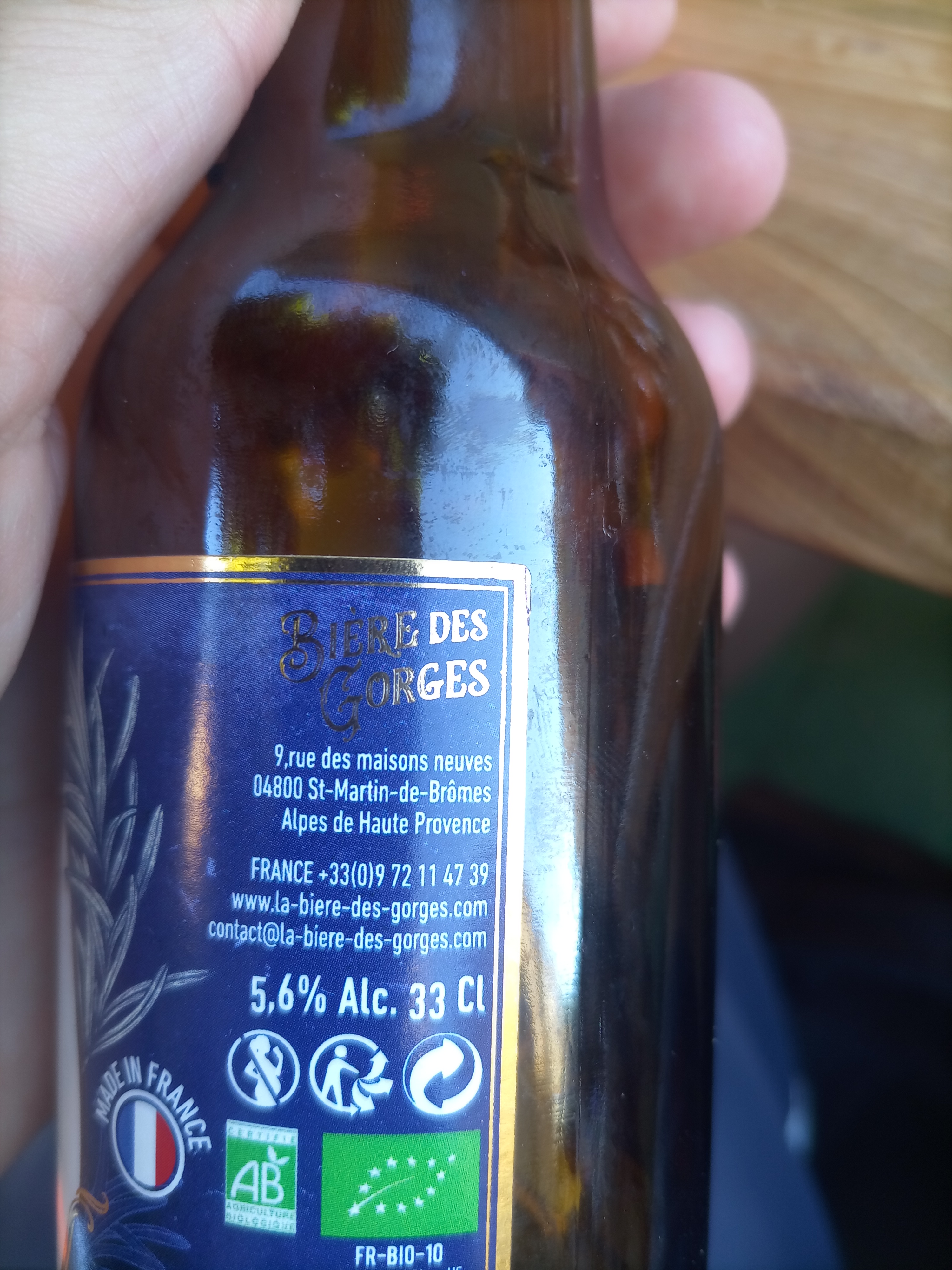 Notée la la lecture de l étiquette, : biere fabriquée par une brasserie de Montpelier pour la marque bierre du verdon. C est ecrit dessus elle n a du verdon que son nom et son etiquette. Pure strategie commerciale.