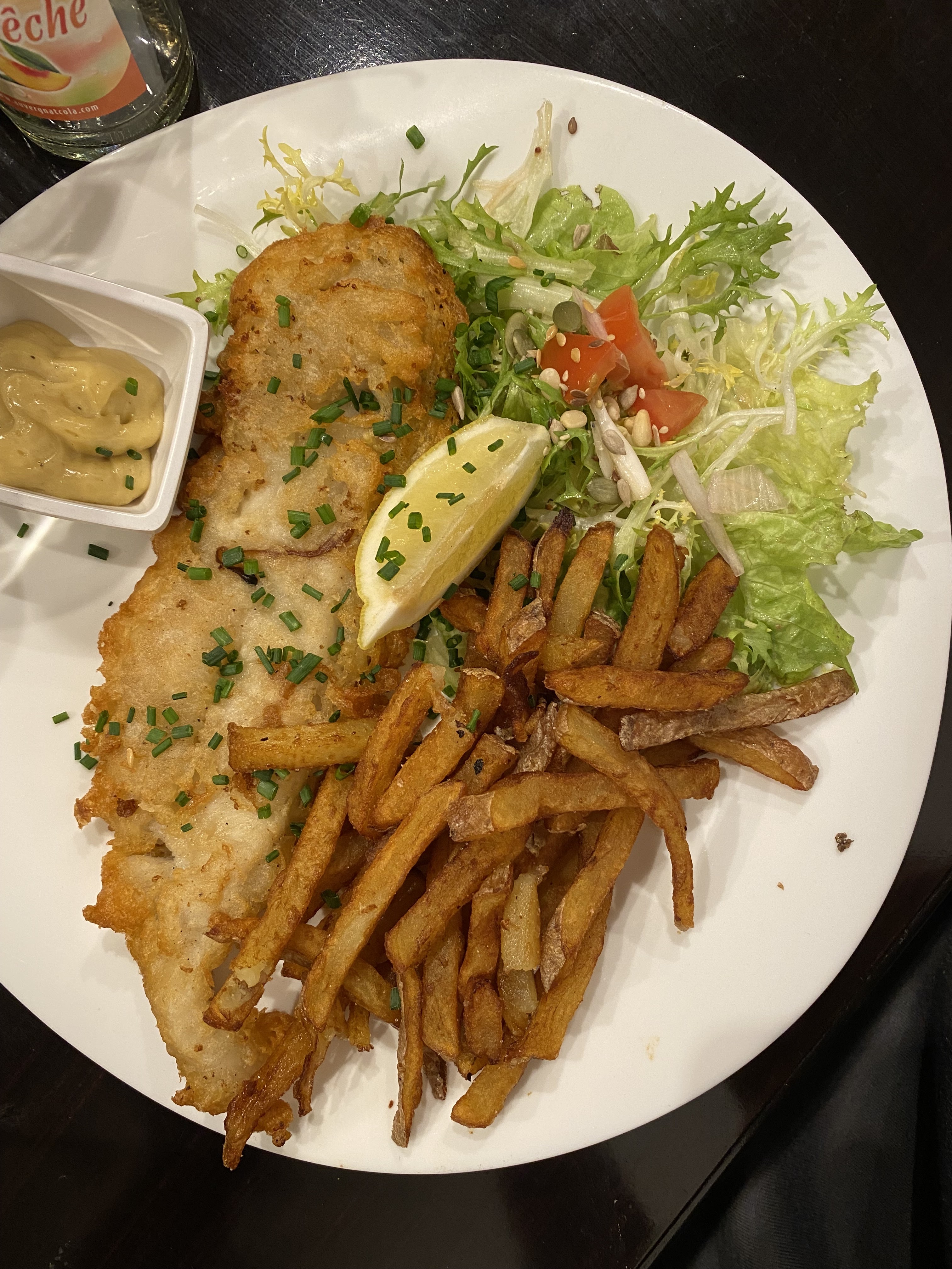 Bon ambiance, repas moyens frites hyper grillées, fish and chips, certainement accidentel...pour l'accueil et la bière j'y retournerais