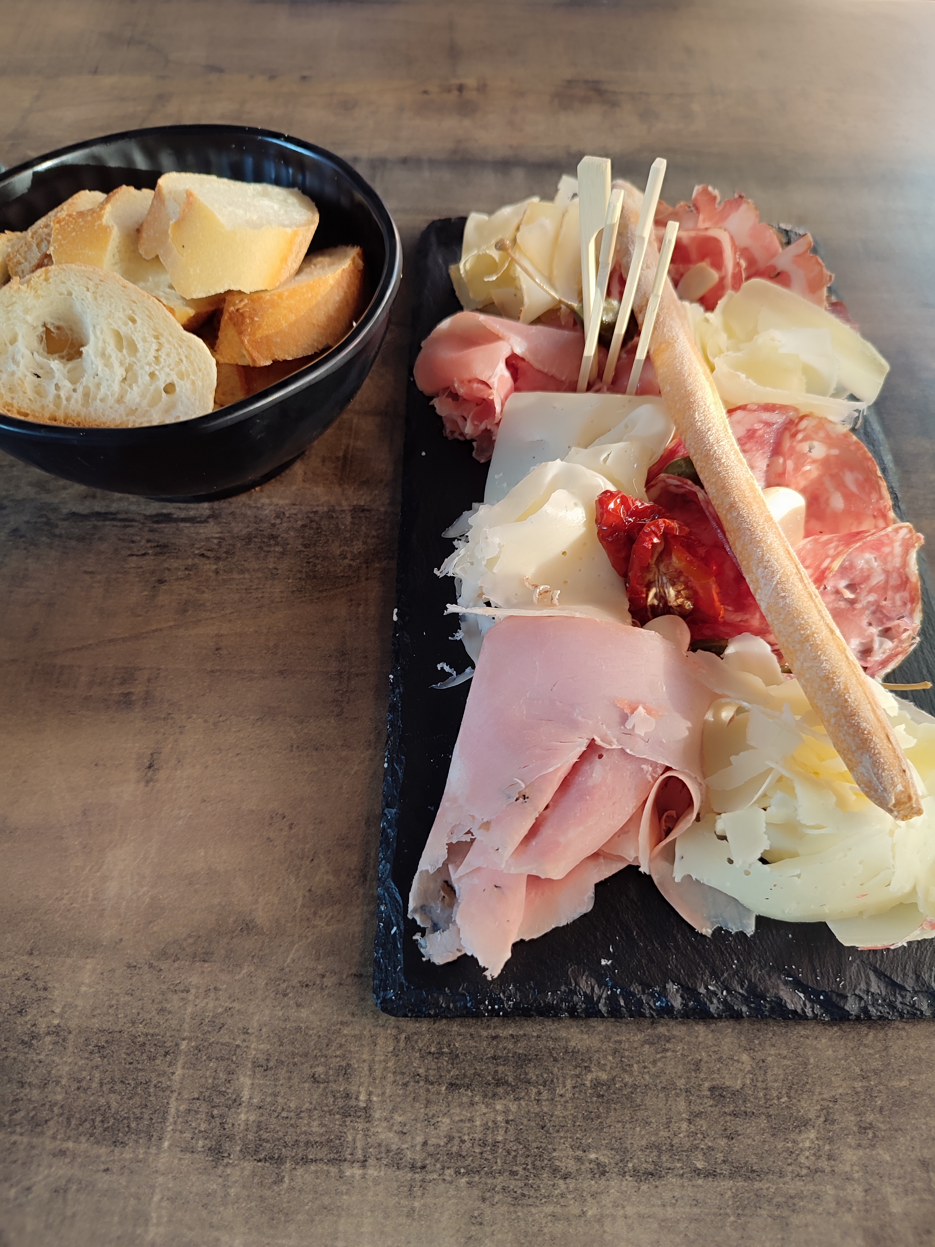 Planche apéro charcuterie fromage très bonne et belle. Le seul problème c'est que les cuisines ouvrent à 12h, quand tu as des enfants en bas âge le mieux c'est 11h30 surtout si on veut éviter le monde de 12h