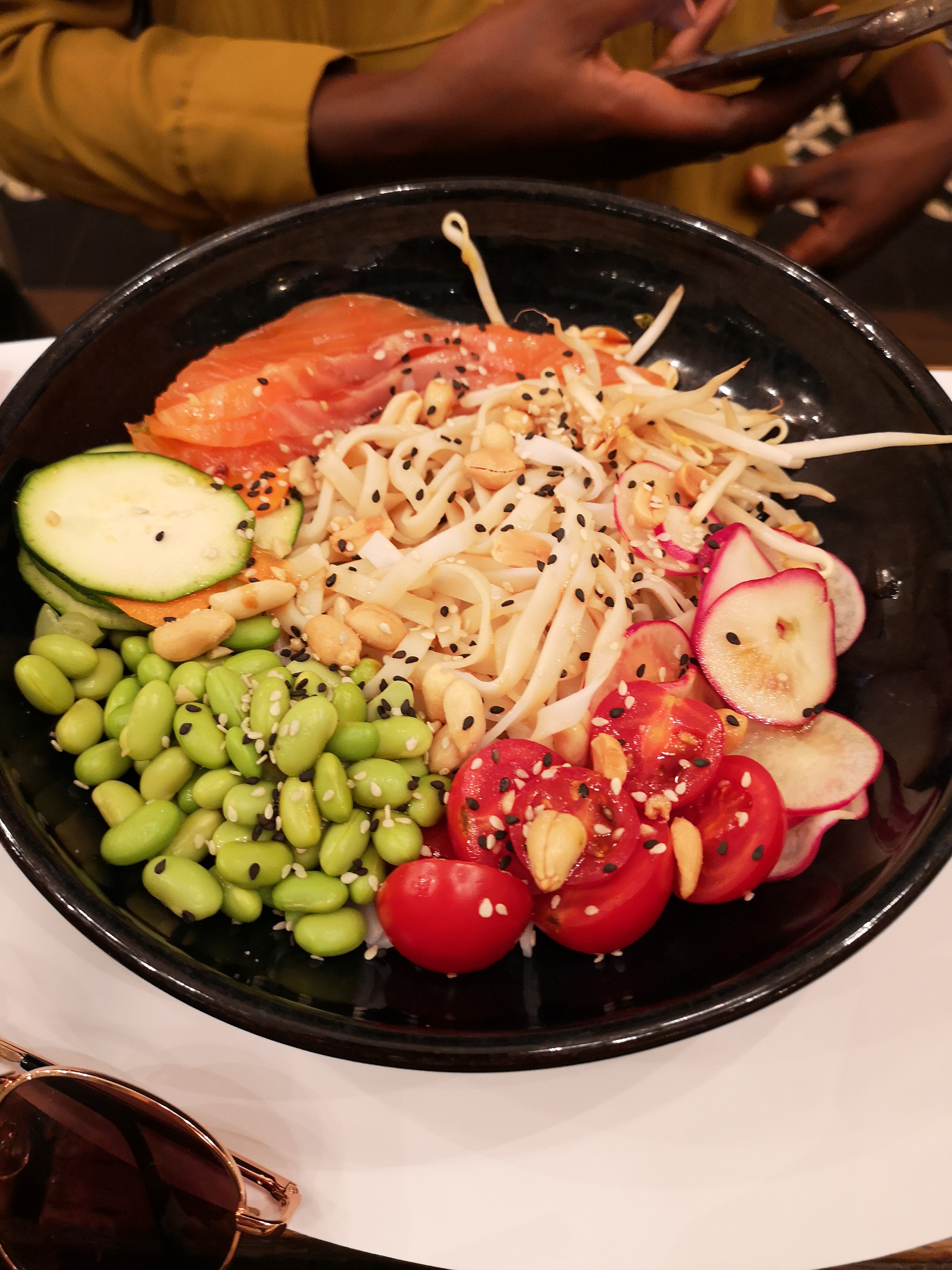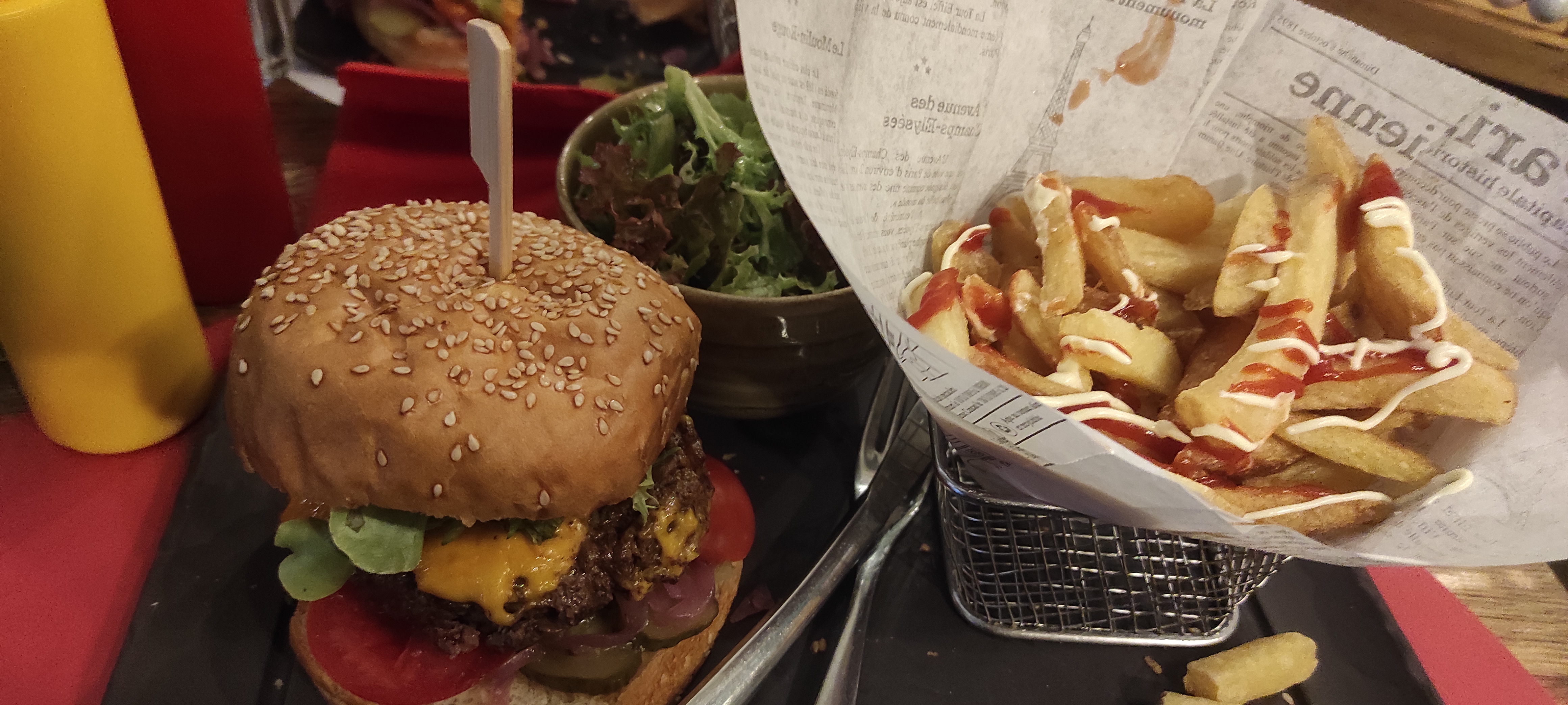 Mauvais dîner, salade César avec vinaigrette 👍🏻 Écrans avec une image qui s’arrête toutes les 3 minutes et impossible de mettre du son donc ambiance catastrophique