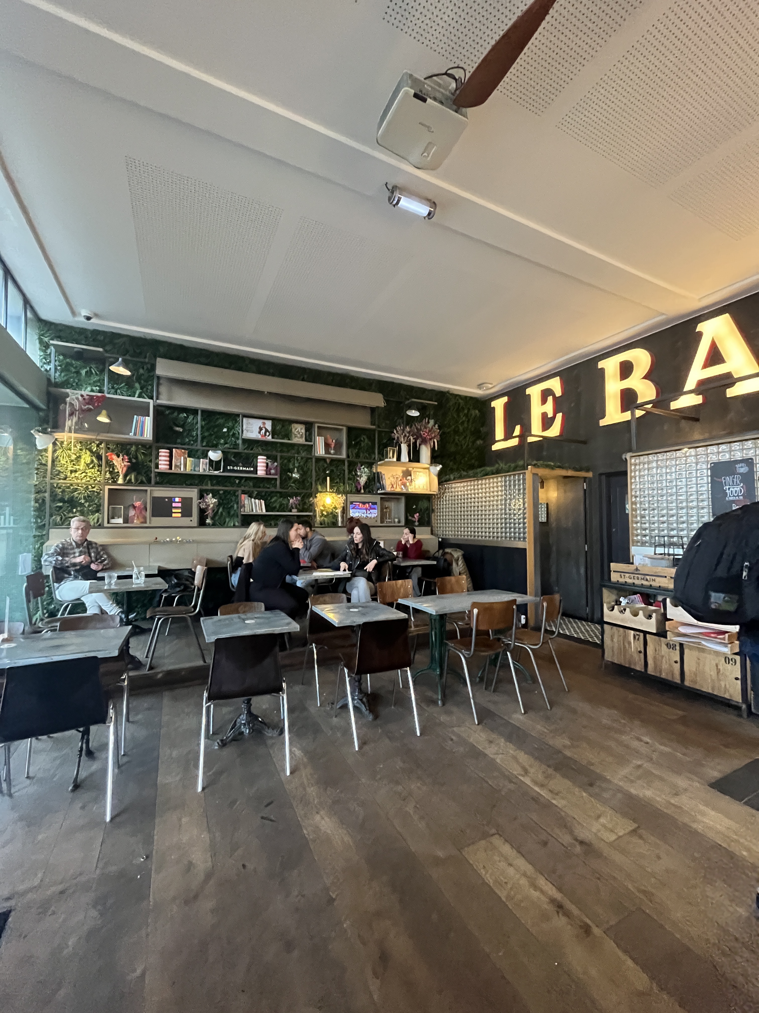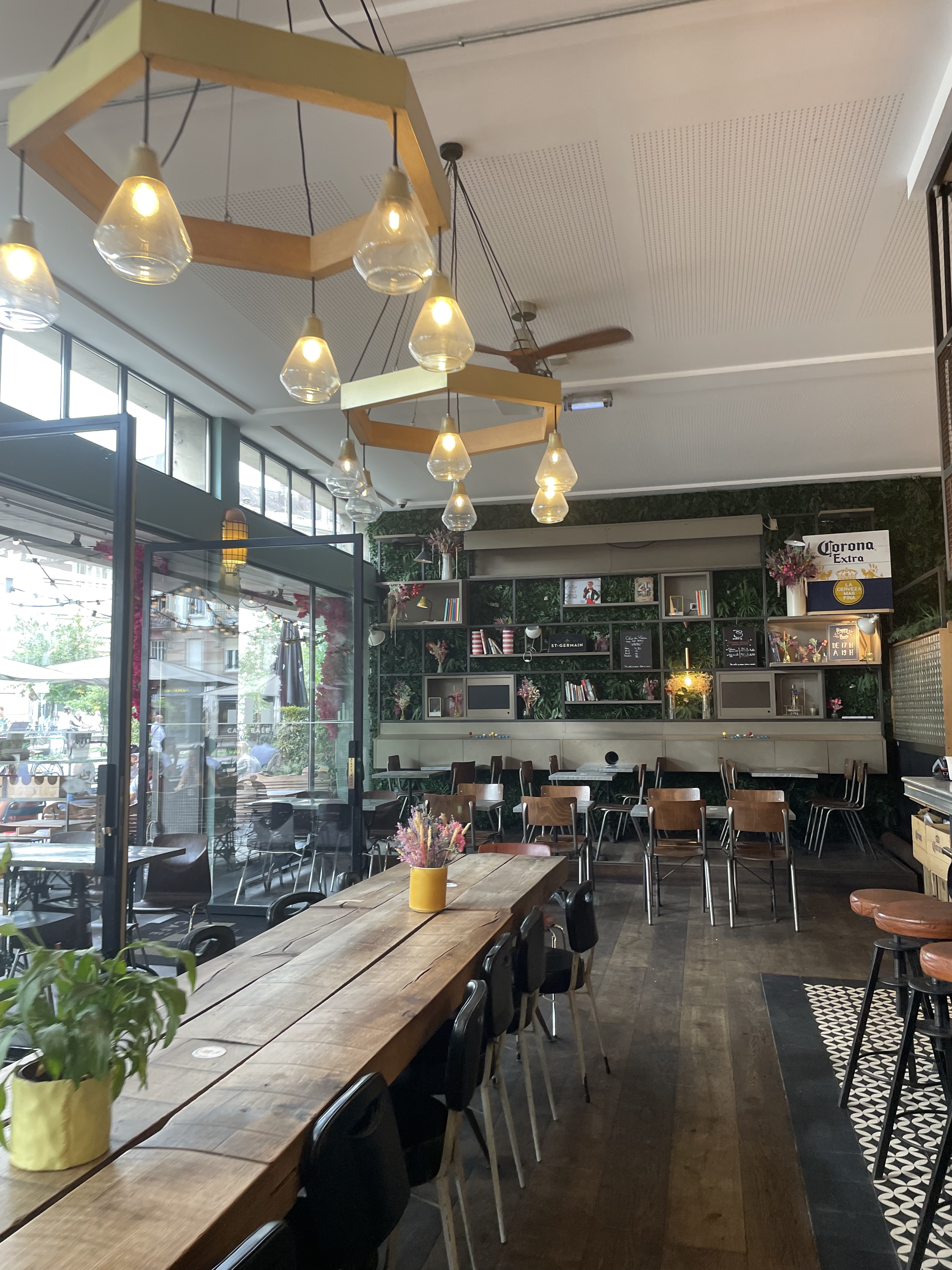 Une décoration originale, mélange de modernité (lustres stylisé), vintage (des consoles de jeux vidéo rétro) végétal (mur de plantes) convivialité (Grande table en bois style auberge espagnole)... La terrasse est très grande et ensoleillé (avec de l'ombre également) les prix sont corrects, les plats s'étalent sur la journée, du petit déjeuner au dîner. Je baisse ma note à trois étoiles, après une visite un samedi après midi, le service était désagréable et très très long....
