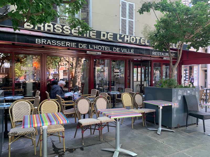 Une terrasse sur la place de l'hotel de ville avec a la fois du soleil et de l'holnre selon les preferences. Service de proximite avec des clients habitues