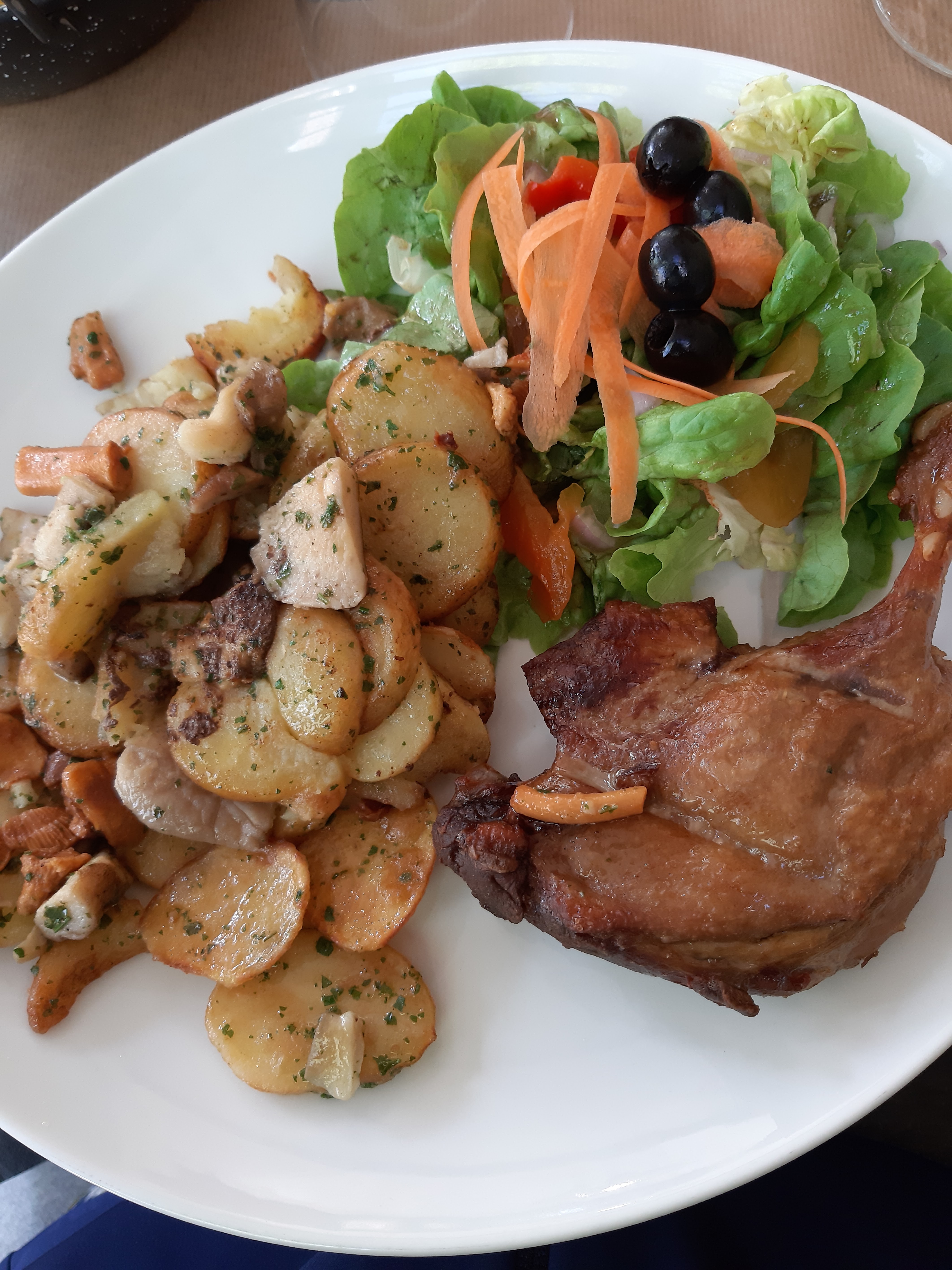Super salade, bon canard, bon gâteau aux pommes, excellent service 100% répéteraient