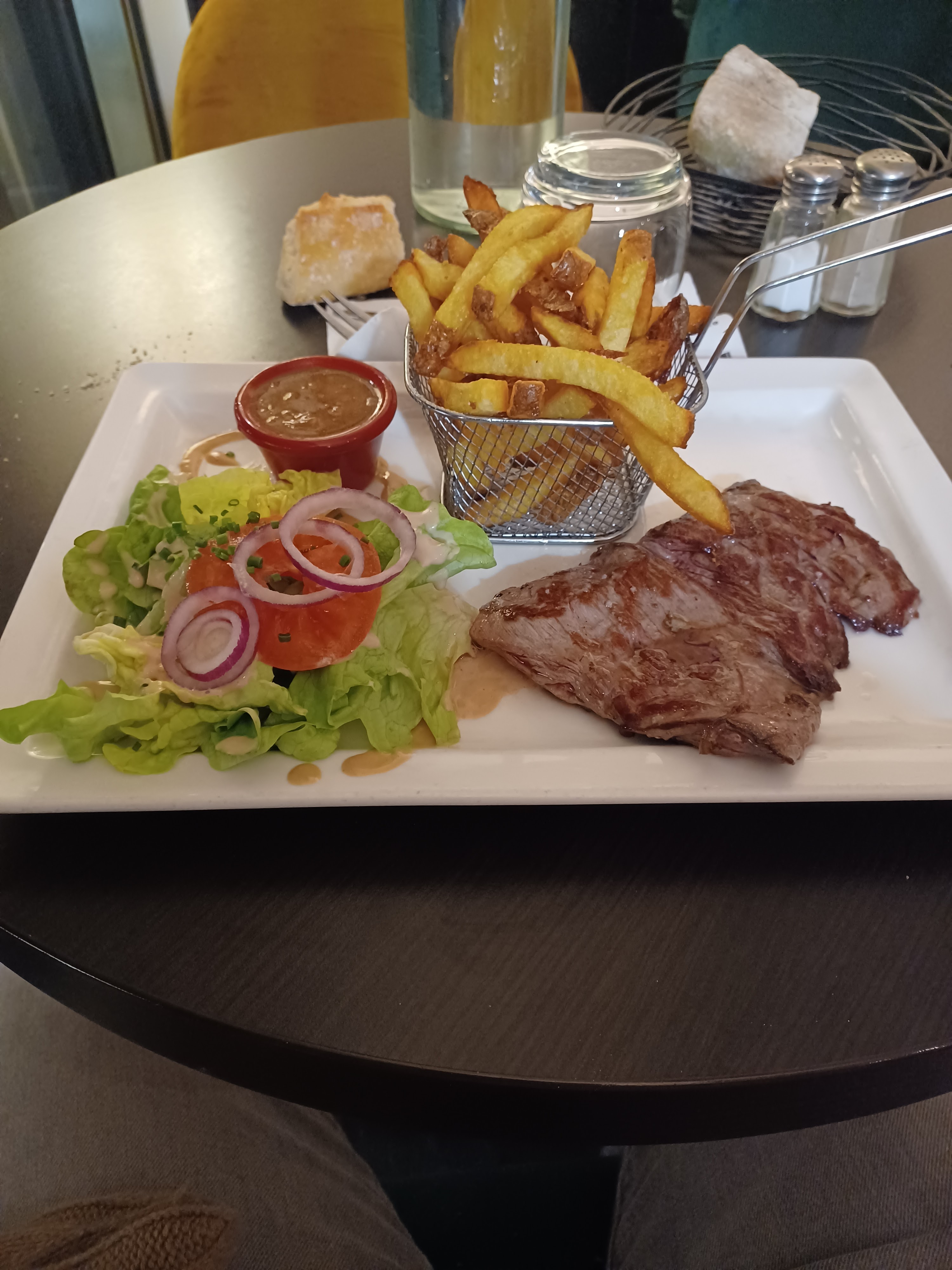 Nous avons été déçu de la qualité des assiettes. J’ai pris un carpaccio de beauf. La quantité de viande était très limitée. De plus de la salade et des tomates recouvraient l’assiette. Par ailleurs, les vins sont arrivés deux minutes après les apéritifs. Le verre de vin rouge au prix de 6€ n’était pas de qualité. Pour finir, la sauce au poivre avait davantage le goût de ketchup que de poivre.