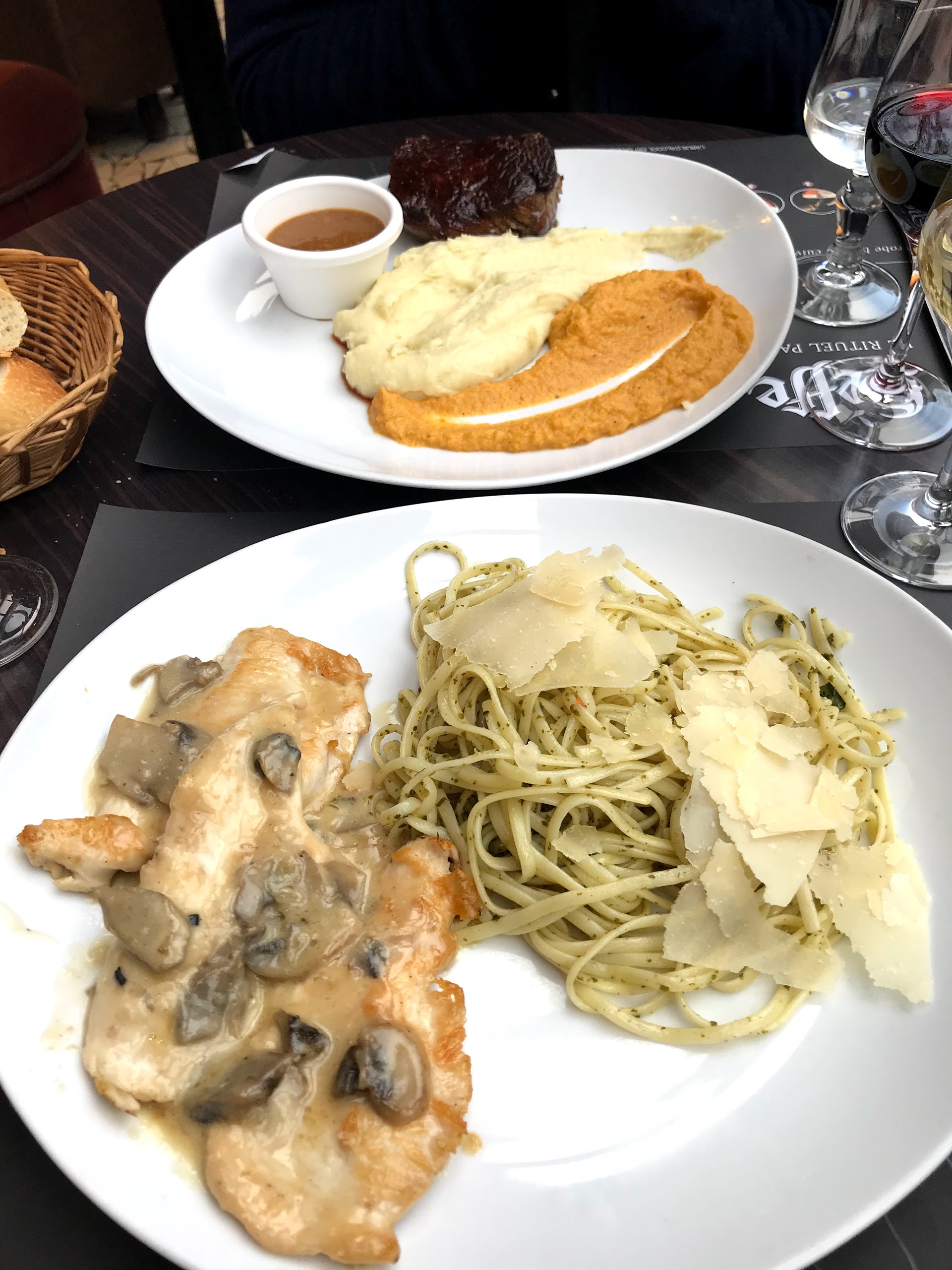 C'était très typiquement parisien. OK mais pas fantastique et un peu cher. 5 € café et 6 € petite eau. Mais l'ambiance était bonne et le service bien. J'ai eu un poulet César qui contenait des tomates. Premier César de l'histoire à avoir de la tomate. Mais c'est Paris partout. Et ne me lancez pas dans le cappuccino. Pour une raison quelconque, les Français n’ont jamais appris à faire du café. Ils pensent qu’ils l’étaient, mais ce n’était pas le cas. Ils ne peuvent faire que de l'expresso. Court noir.