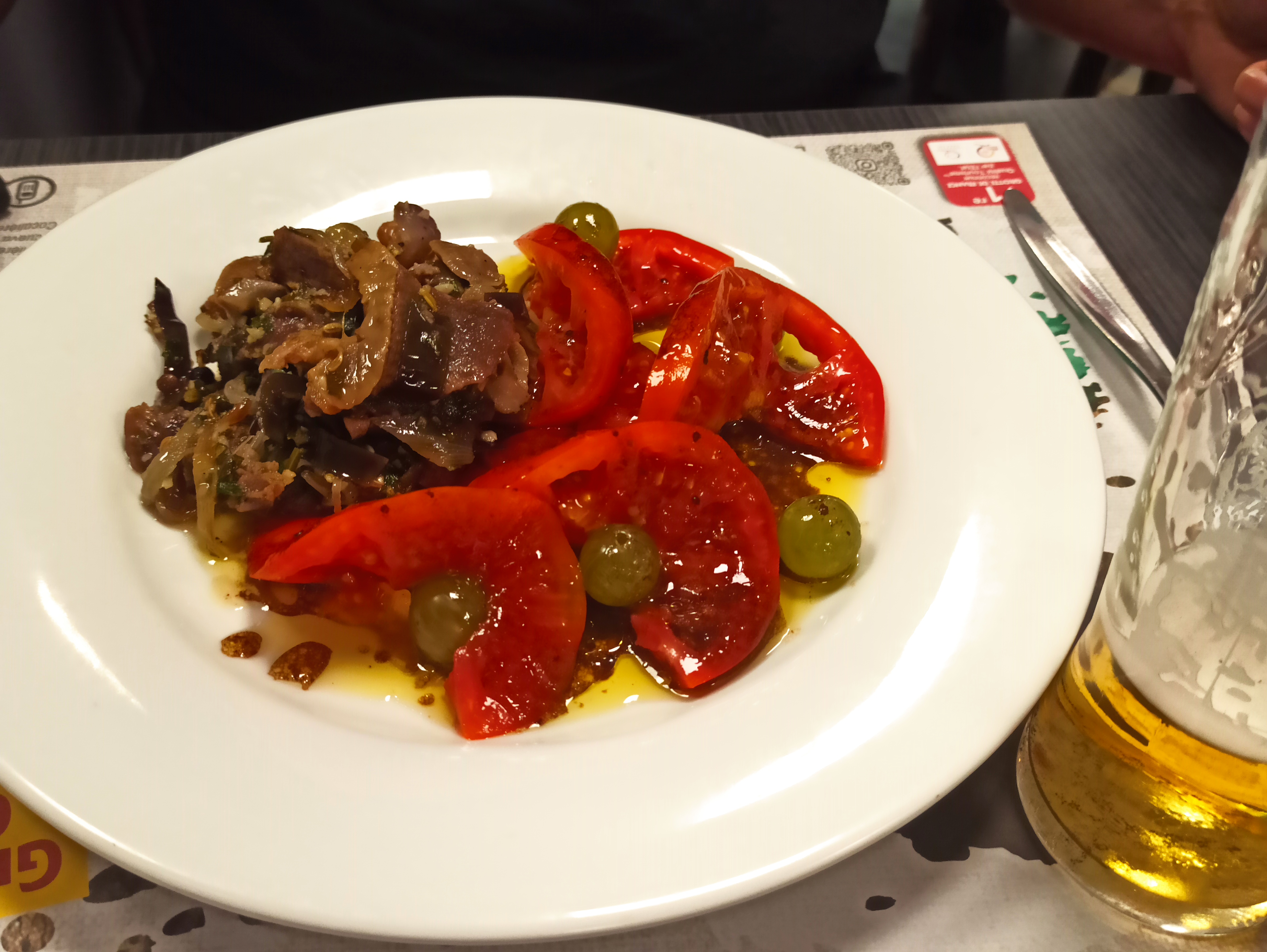 Menu complet:salade de langue de veau+lapin rôti farci de pruneaux et de poitrine fumée+ gâteau) avec vin+café à 16E. Le tout en terrasse avec le sourire